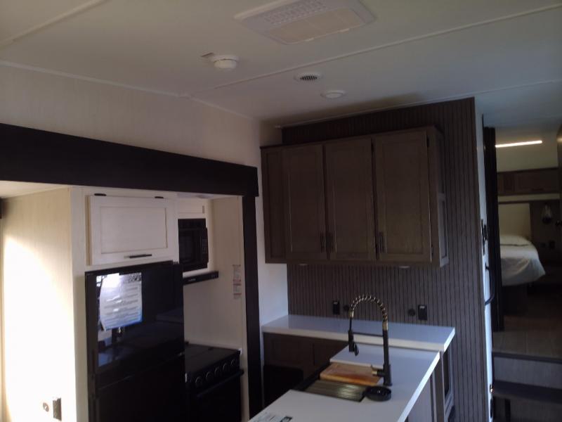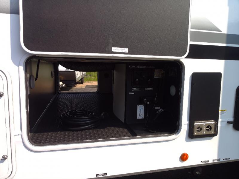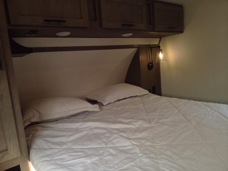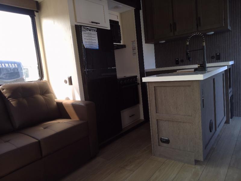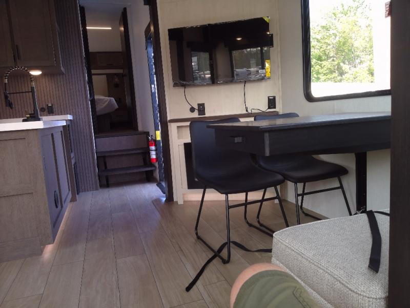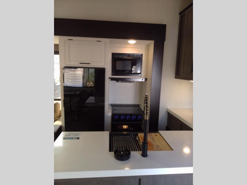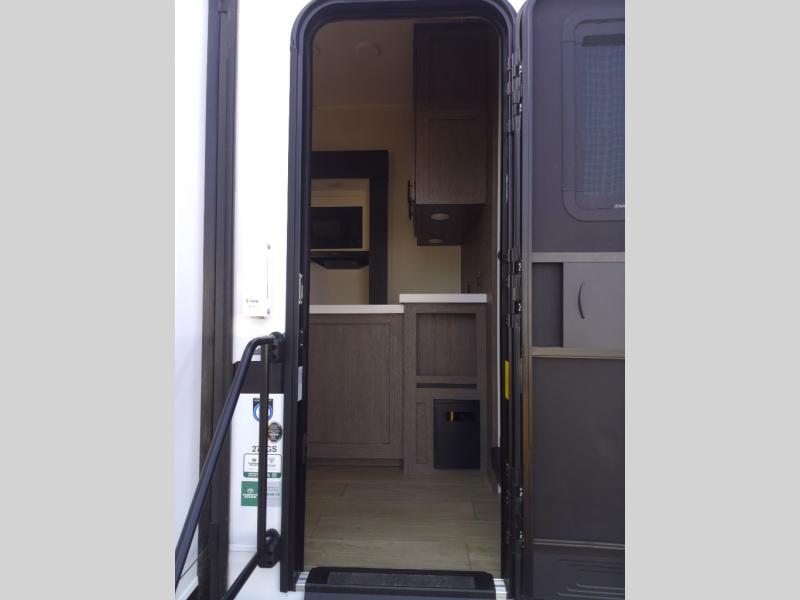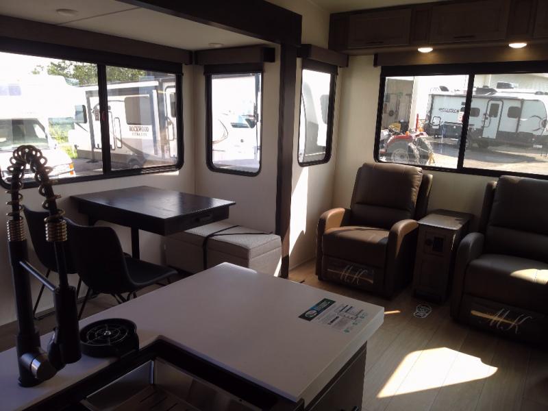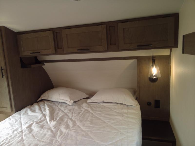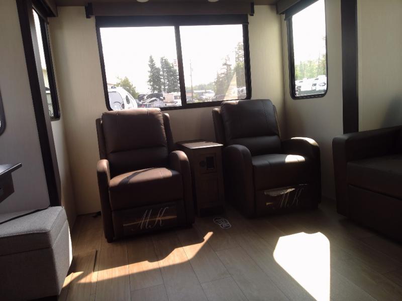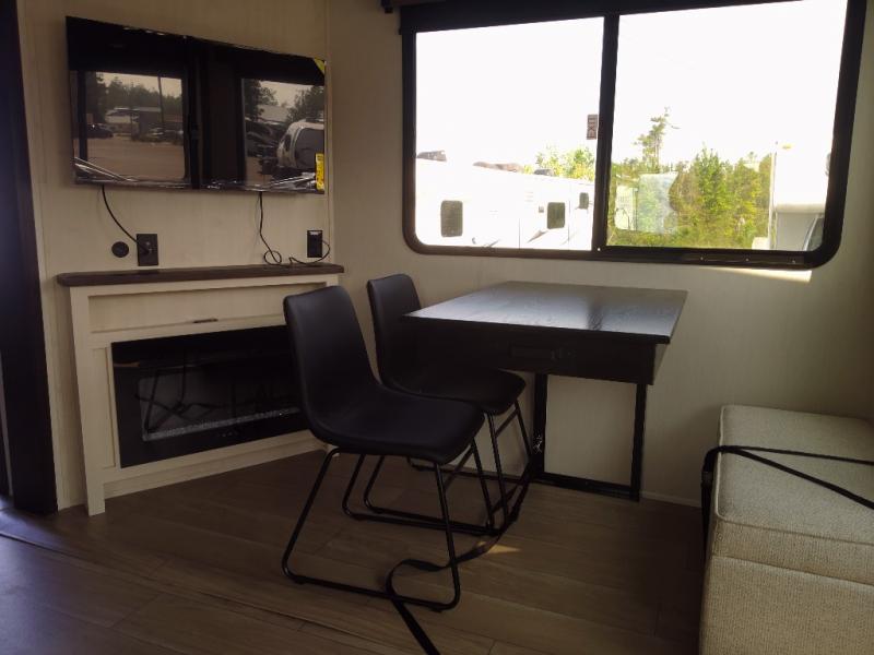 This fifth wheel is perfect for couple's but also has enough space for company too! The rear living area features two recliners with a middle table side to set your cup of coffee, a tri-fold sofa that can transform into an extra sleeping space, and free standing table with chairs and storage ottoman seat to enjoy your meals by the electric fireplace. The fully equipped kitchen has everything you need including a counter peninsula, 12V refrigerator, and plenty of storage. After a fun-filled day at the beach, rinse off in the full bathroom that includes a spacious shower, porcelain toilet, and convenient shower caddy. The front private bedroom has a queen bed to lay your head on at night and there is even USB ports on either side to charge your electronics!