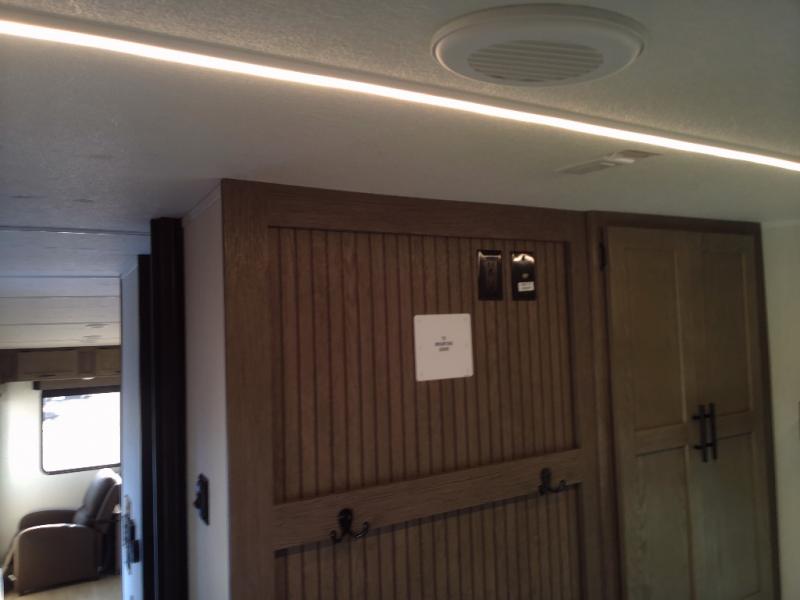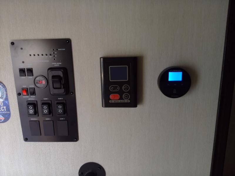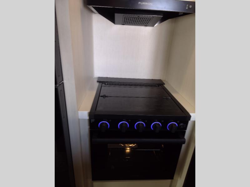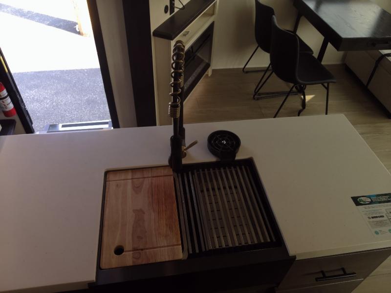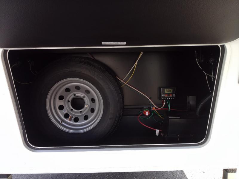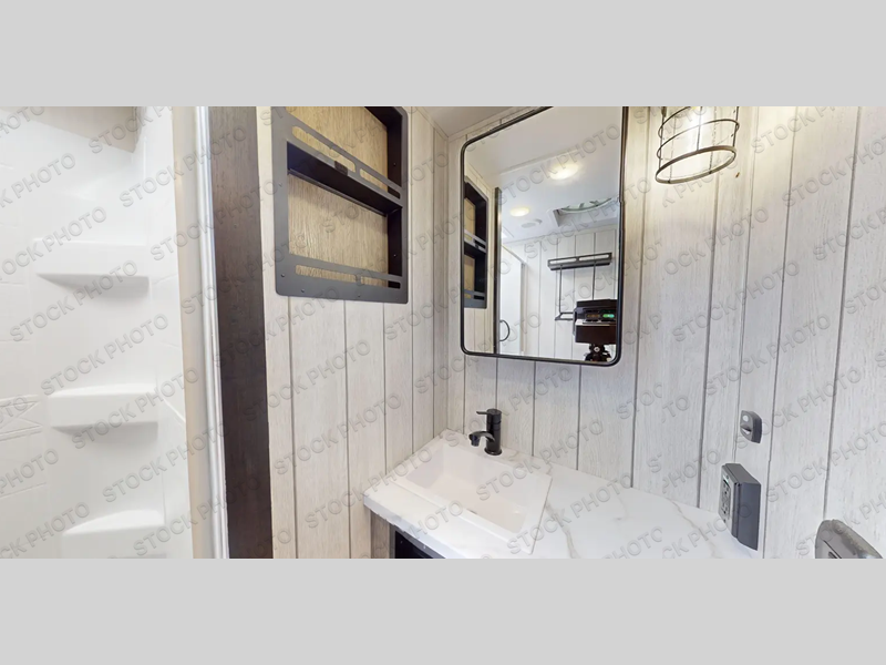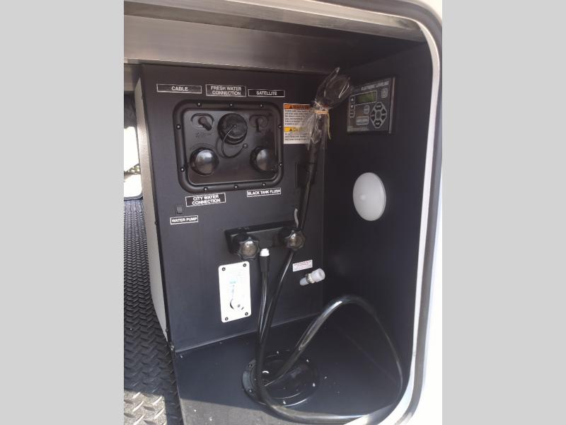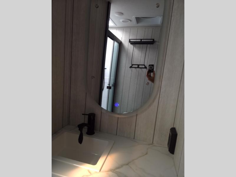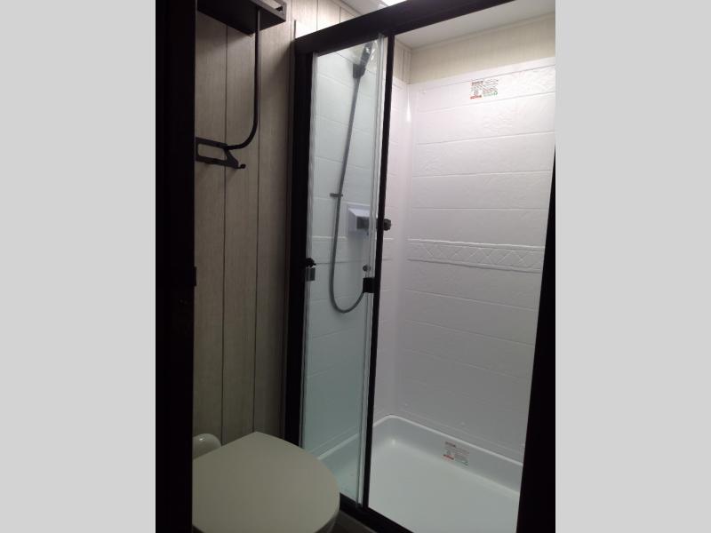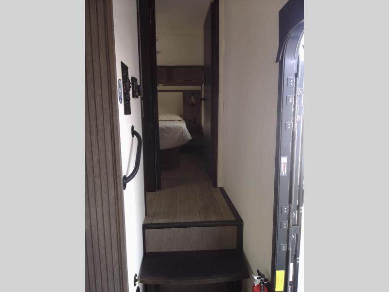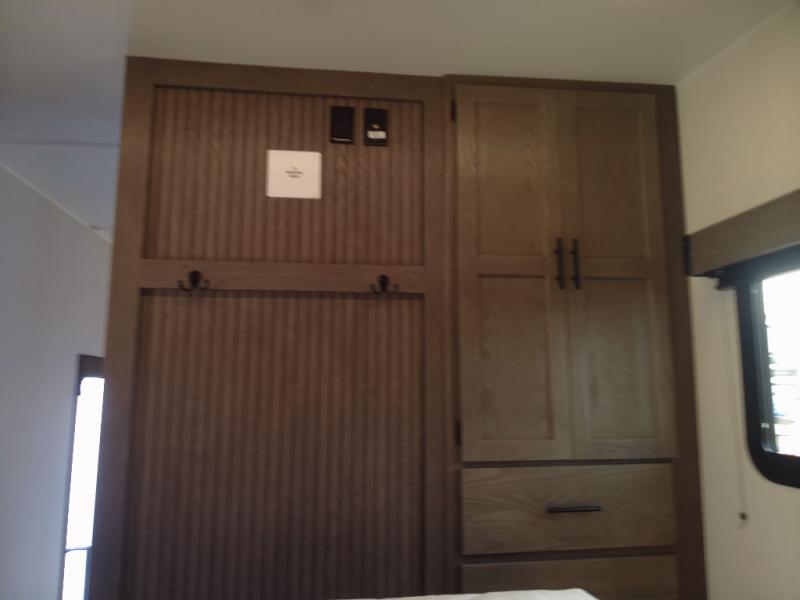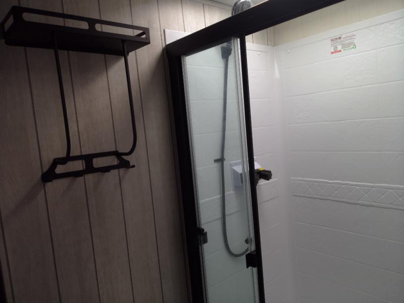 This fifth wheel is perfect for couple's but also has enough space for company too! The rear living area features two recliners with a middle table side to set your cup of coffee, a tri-fold sofa that can transform into an extra sleeping space, and free standing table with chairs and storage ottoman seat to enjoy your meals by the electric fireplace. The fully equipped kitchen has everything you need including a counter peninsula, 12V refrigerator, and plenty of storage. After a fun-filled day at the beach, rinse off in the full bathroom that includes a spacious shower, porcelain toilet, and convenient shower caddy. The front private bedroom has a queen bed to lay your head on at night and there is even USB ports on either side to charge your electronics!