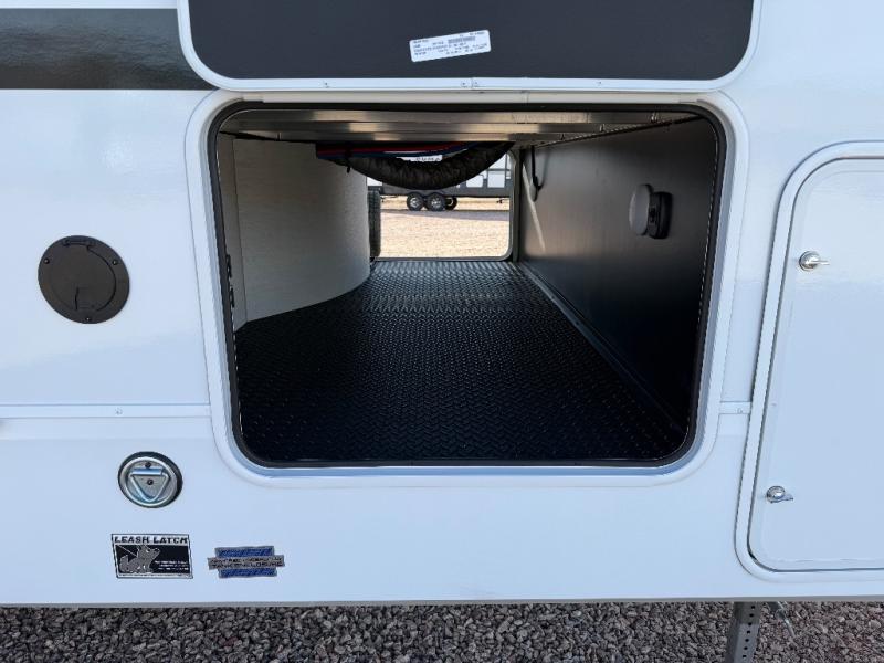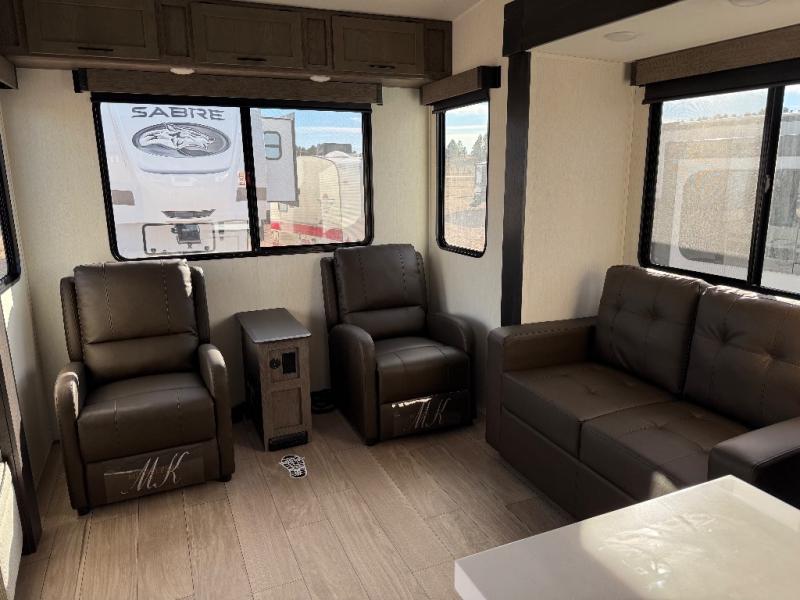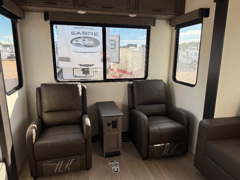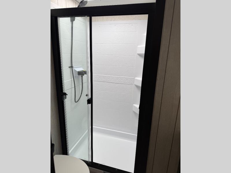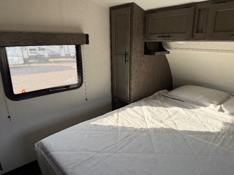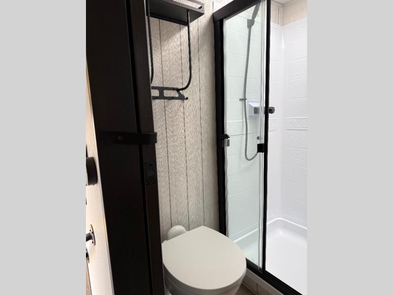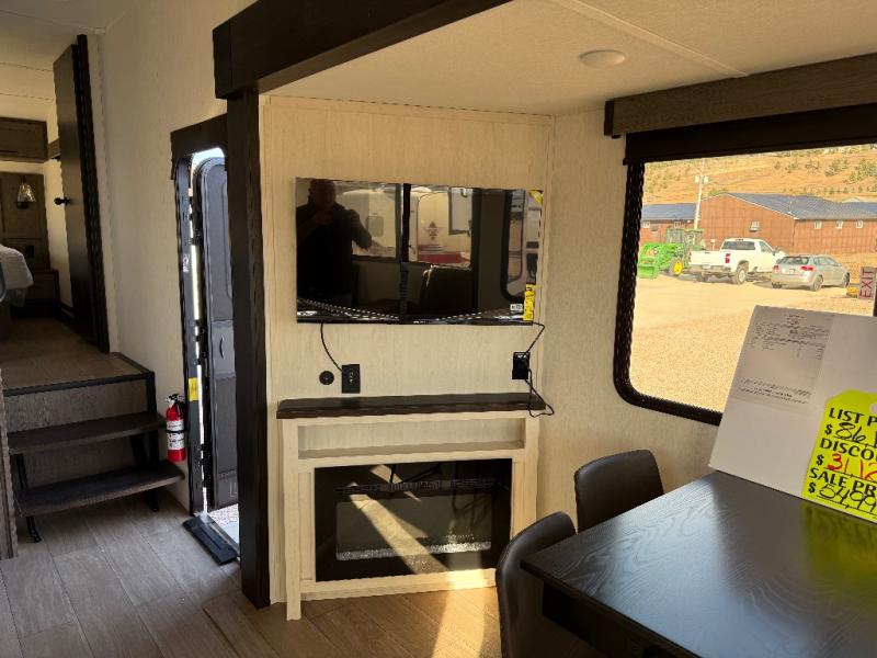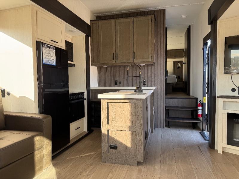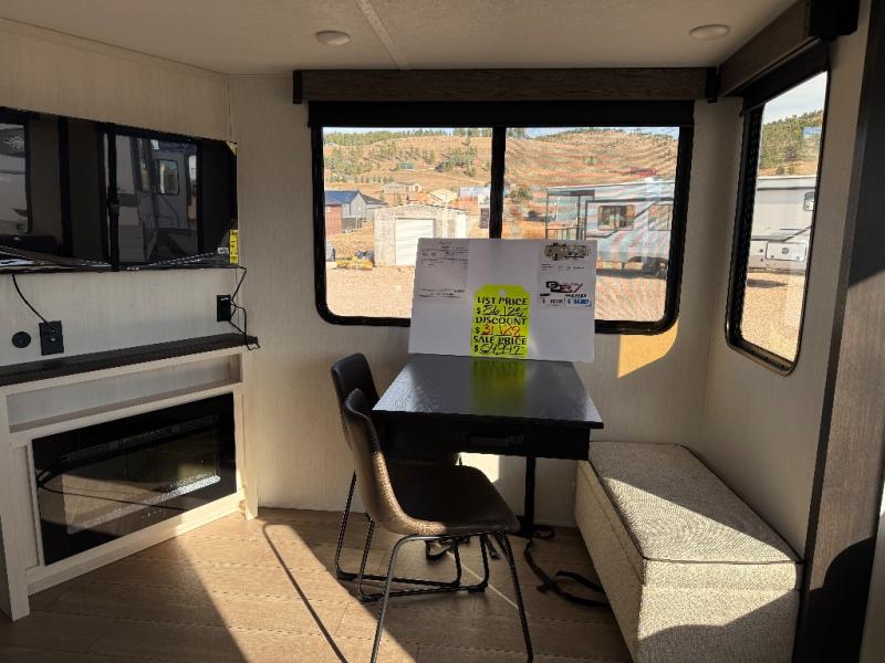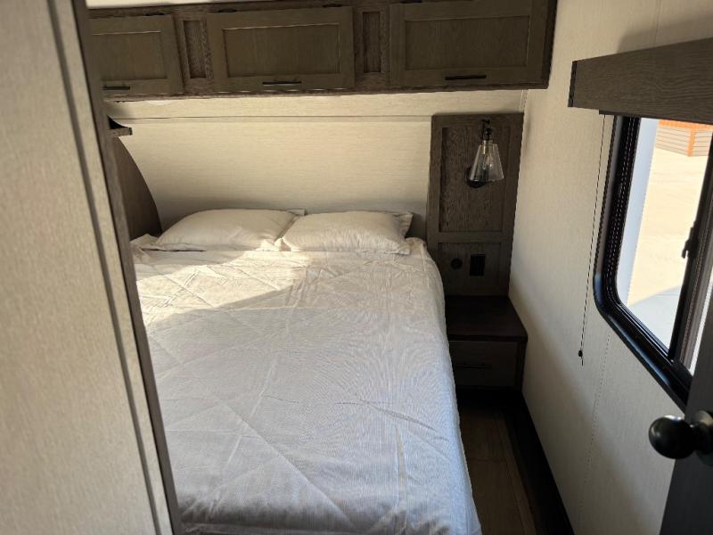 This fifth wheel is perfect for couple's but also has enough space for company too! The rear living area features two recliners with a middle table side to set your cup of coffee, a tri-fold sofa that can transform into an extra sleeping space, and free standing table with chairs and storage ottoman seat to enjoy your meals by the electric fireplace. The fully equipped kitchen has everything you need including a counter peninsula, 12V refrigerator, and plenty of storage. After a fun-filled day at the beach, rinse off in the full bathroom that includes a spacious shower, porcelain toilet, and storage. The front private bedroom has a queen bed to lay your head on at night and there is even USB ports on either side to charge your electronics!