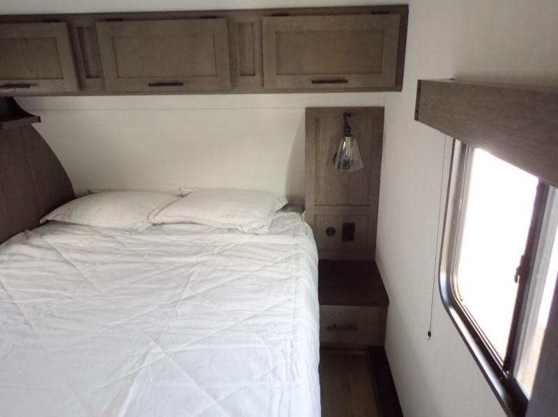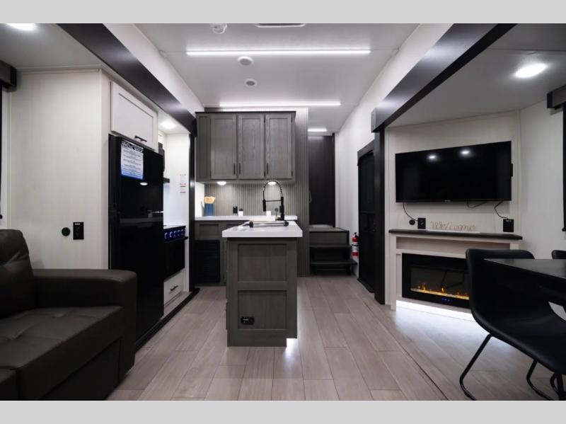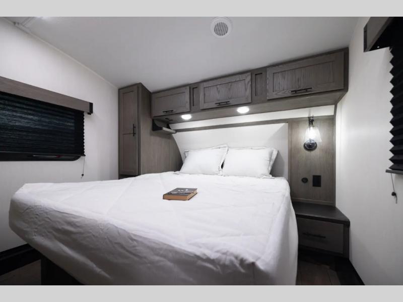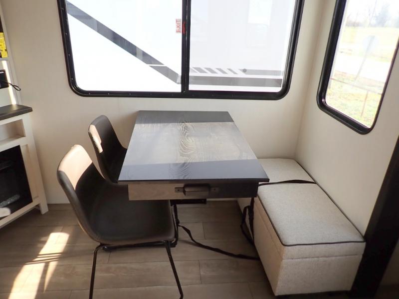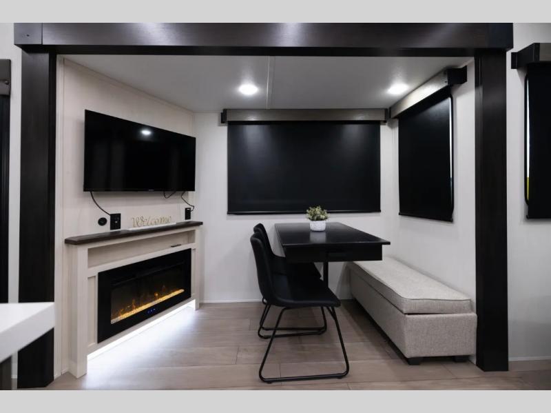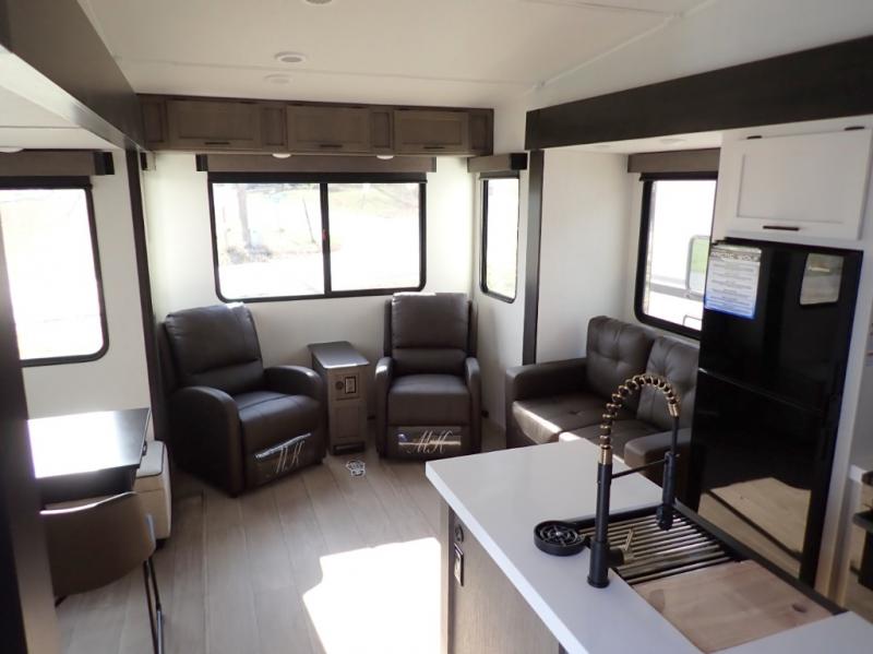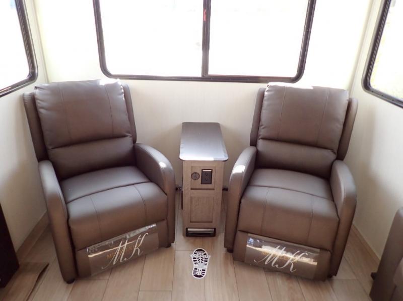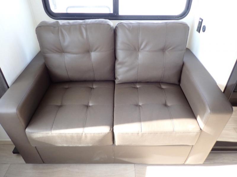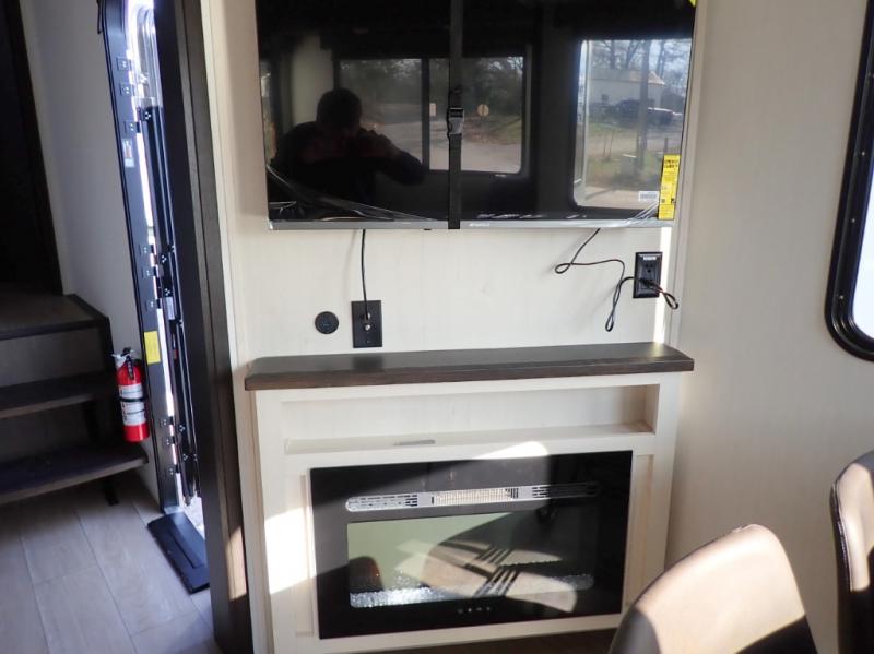 This fifth wheel is perfect for couple's but also has enough space for company too! The rear living area features two recliners with a middle table side to set your cup of coffee, a tri-fold sofa that can transform into an extra sleeping space, and free standing table with chairs and storage ottoman seat to enjoy your meals by the electric fireplace. The fully equipped kitchen has everything you need including a counter peninsula, 12V refrigerator, and plenty of storage. After a fun-filled day at the beach, rinse off in the full bathroom that includes a spacious shower, porcelain toilet, and storage. The front private bedroom has a queen bed to lay your head on at night and there is even USB ports on either side to charge your electronics!