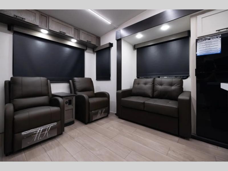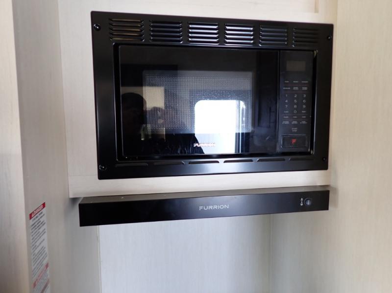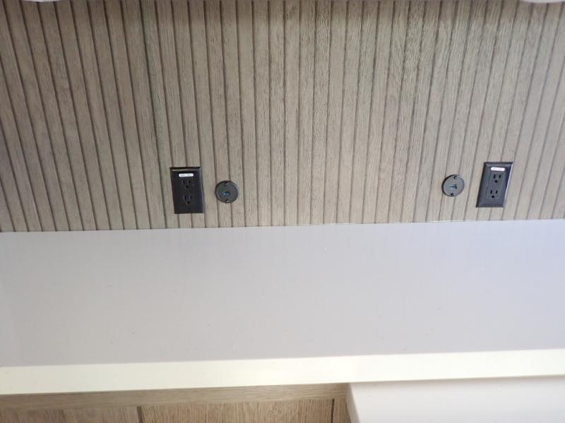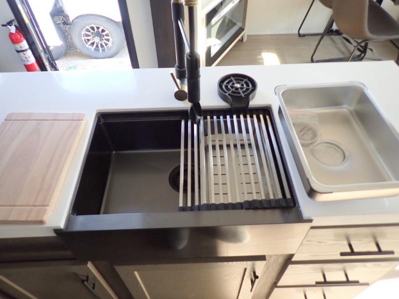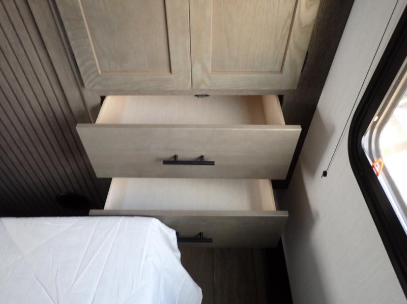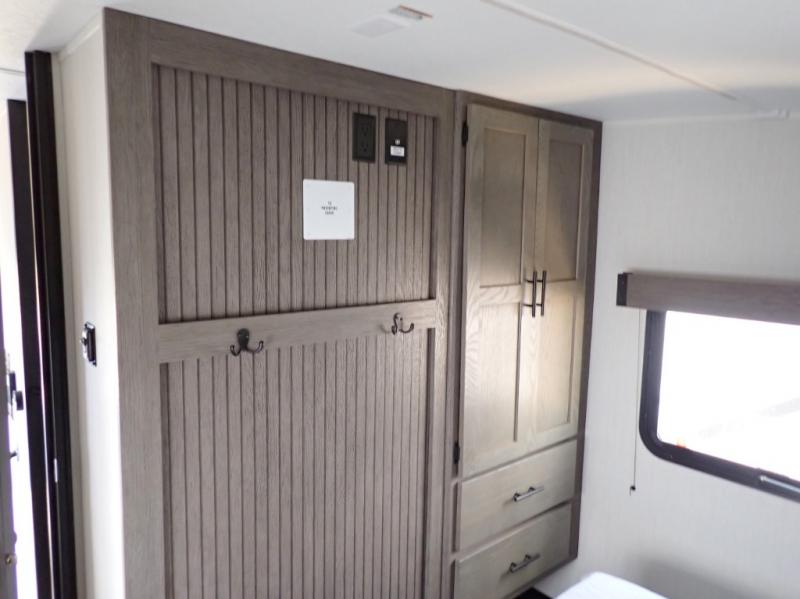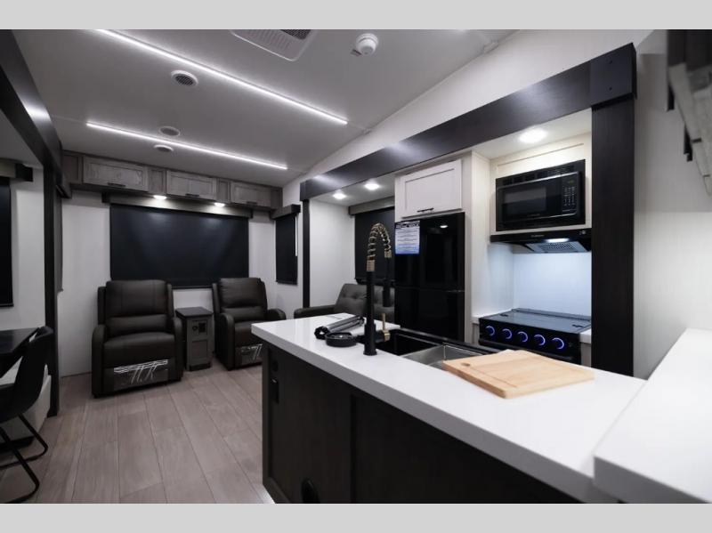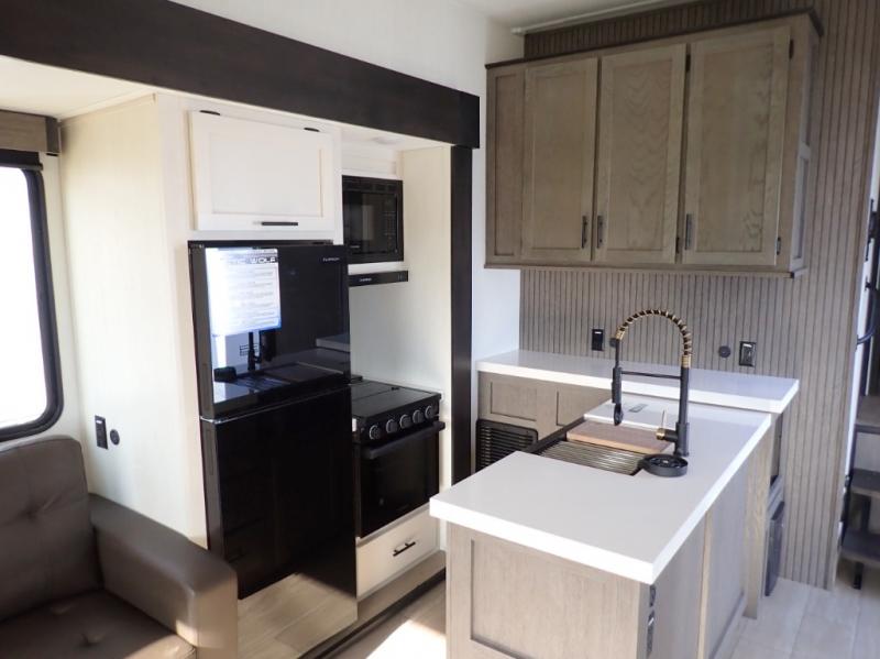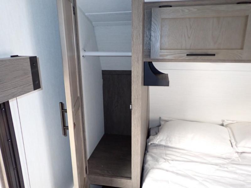 This fifth wheel is perfect for couple's but also has enough space for company too! The rear living area features two recliners with a middle table side to set your cup of coffee, a tri-fold sofa that can transform into an extra sleeping space, and free standing table with chairs and storage ottoman seat to enjoy your meals by the electric fireplace. The fully equipped kitchen has everything you need including a counter peninsula, 12V refrigerator, and plenty of storage. After a fun-filled day at the beach, rinse off in the full bathroom that includes a spacious shower, porcelain toilet, and storage. The front private bedroom has a queen bed to lay your head on at night and there is even USB ports on either side to charge your electronics!