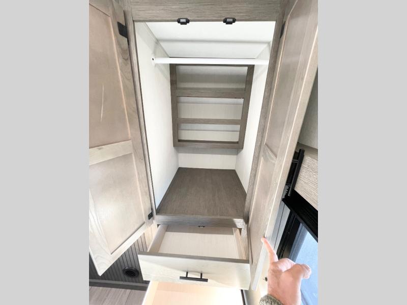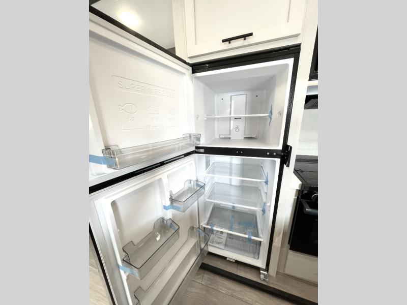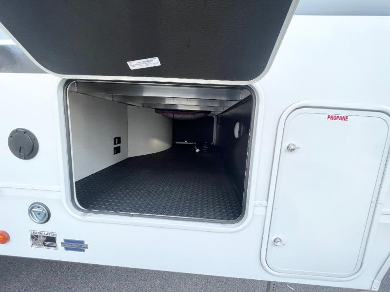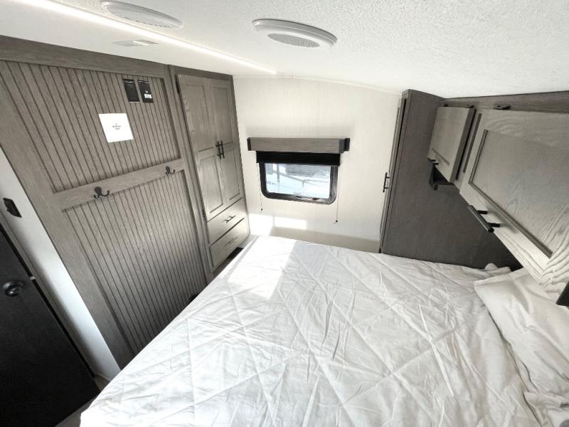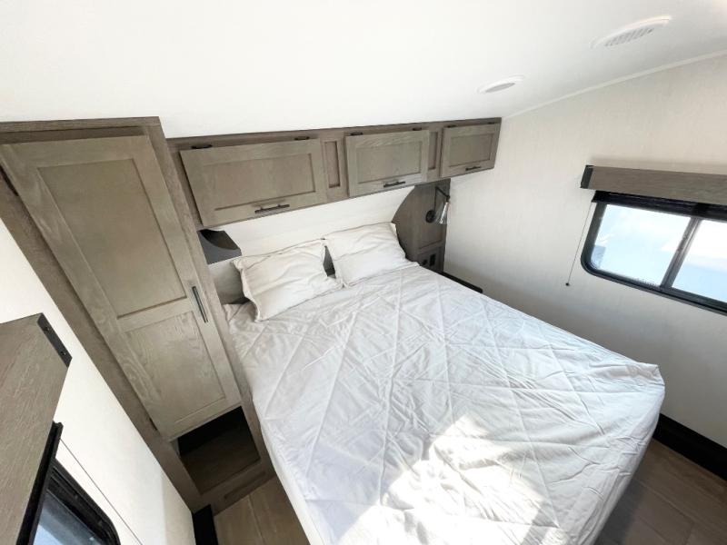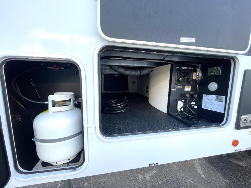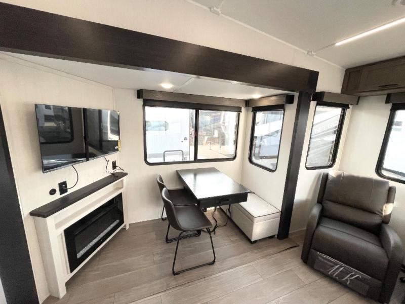 This fifth wheel is perfect for couple's but also has enough space for company too! The rear living area features two recliners with a middle table side to set your cup of coffee, a tri-fold sofa that can transform into an extra sleeping space, and free standing table with chairs and storage ottoman seat to enjoy your meals by the electric fireplace. The fully equipped kitchen has everything you need including a counter peninsula, 12V refrigerator, and plenty of storage. After a fun-filled day at the beach, rinse off in the full bathroom that includes a spacious shower, porcelain toilet, and storage. The front private bedroom has a queen bed to lay your head on at night and there is even USB ports on either side to charge your electronics!