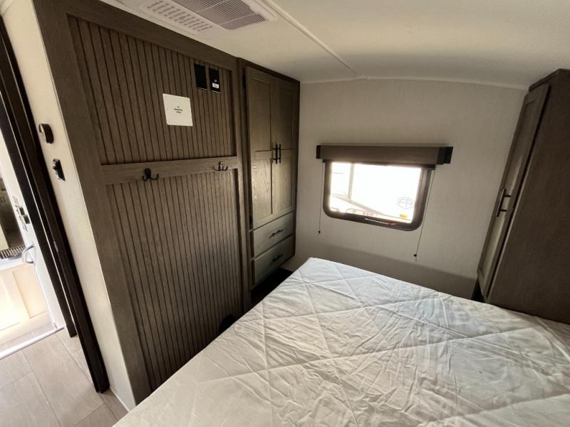 Invite the whole gang with this spacious fifth wheel in tow! The rear private bunkhouse includes triple bunks, a dinette, plus a TV stand with a dresser to keep your space tidy. You'll find a queen bed in the front private bedroom, along with two wardrobes and an overhead cabinet for books. Everyone can meet in the combined kitchen and living area to relax on the tri-fold sofa, play a game around the U-shaped dinette, or just enjoy the fireplace! The chef of your group will have an interior kitchen to cook meals each day, or they can head outside to use the outdoor kitchen with a refrigerator. There is also a 20' patio awning and outside storage to keep hiking gear packed away.