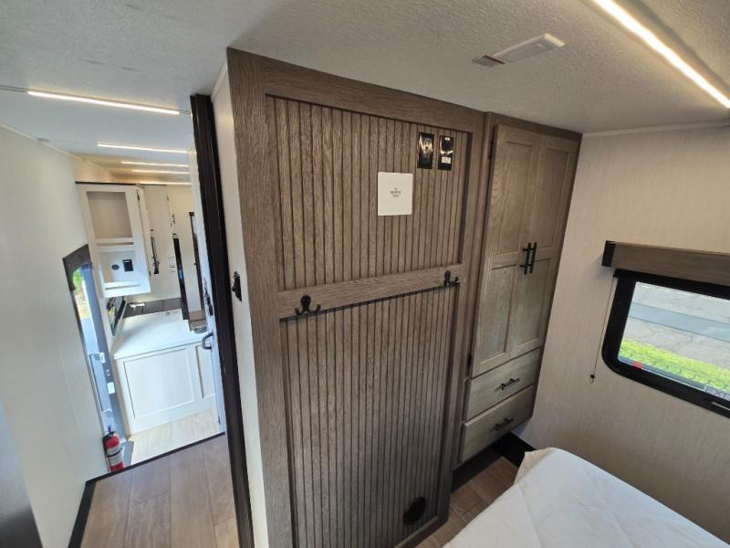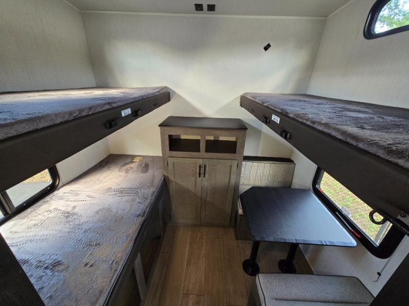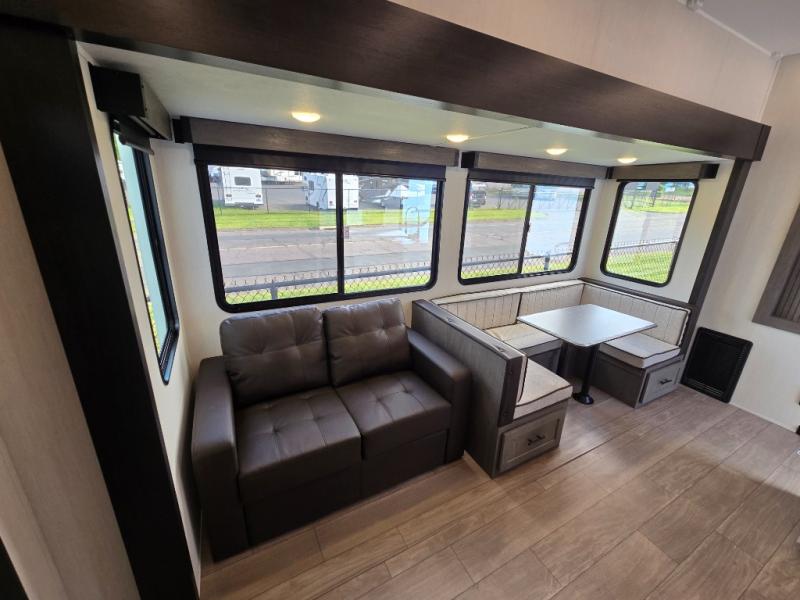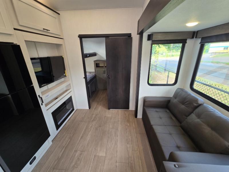 Invite the whole gang with this spacious fifth wheel in tow! The rear private bunkhouse includes triple bunks, a dinette, plus a TV stand with a dresser to keep your space tidy. You'll find a queen bed in the front private bedroom, along with two wardrobes and an overhead cabinet for books. Everyone can meet in the combined kitchen and living area to relax on the tri-fold sofa, play a game around the U-shaped dinette, or just enjoy the fireplace! The chef of your group will have an interior kitchen to cook meals each day, or they can head outside to use the outdoor kitchen with a refrigerator. There is also a 20' patio awning and outside storage to keep hiking gear packed away.