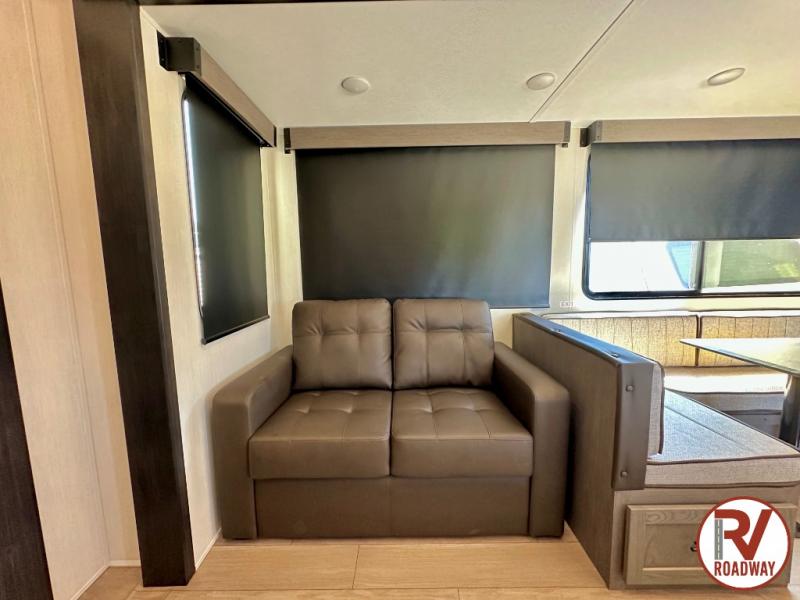 Invite the whole gang with this spacious fifth wheel in tow! The rear private bunkhouse includes triple bunks, a dinette, plus a TV stand with a dresser to keep your space tidy. You'll find a queen bed in the front private bedroom, along with two wardrobes and an overhead cabinet for books. Everyone can meet in the combined kitchen and living area to relax on the tri-fold sofa, play a game around the U-shaped dinette, or just enjoy the fireplace! The chef of your group will have an interior kitchen to cook meals each day, or they can head outside to use the outdoor kitchen with a refrigerator. There is also a 20' patio awning and outside storage to keep hiking gear packed away.
