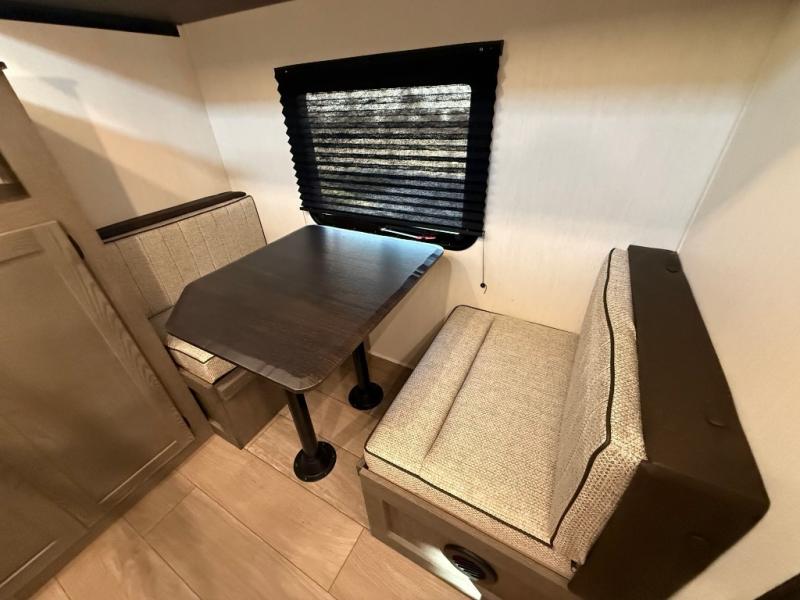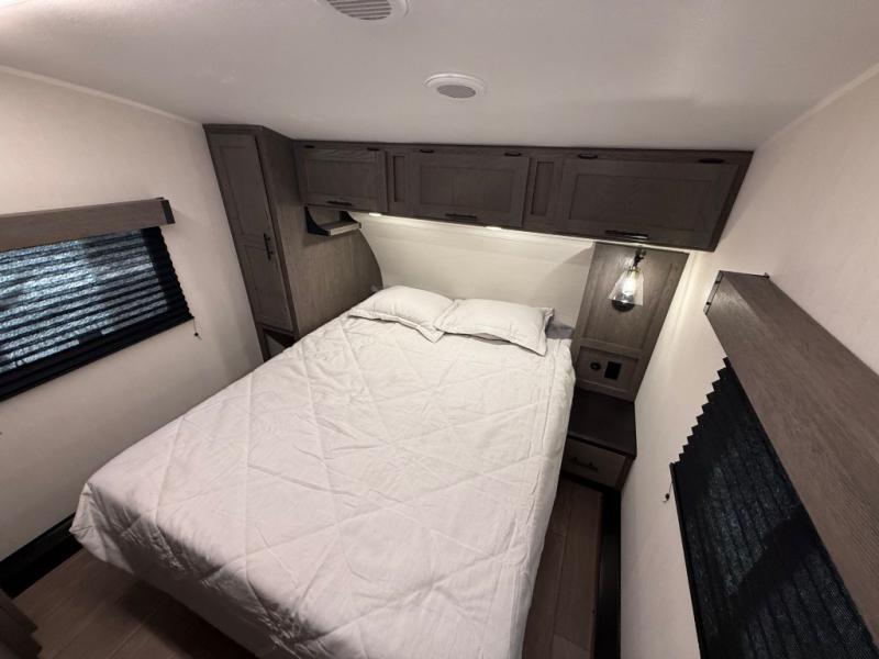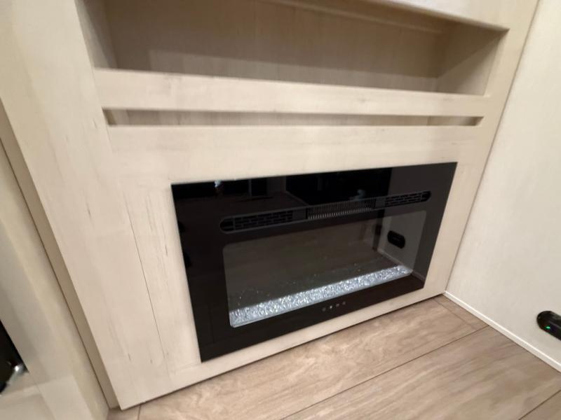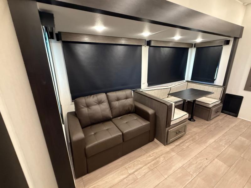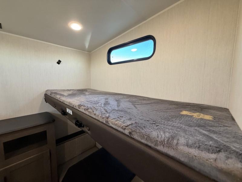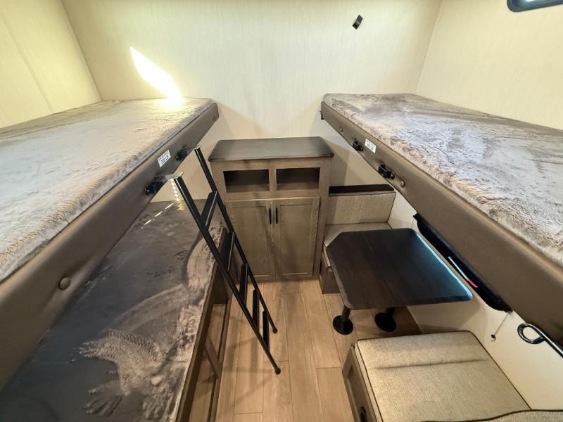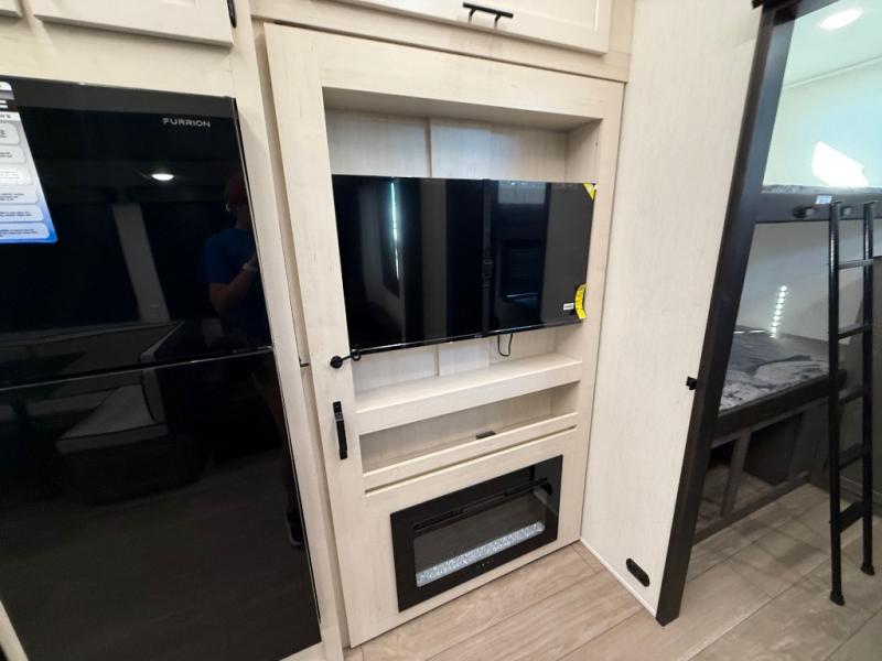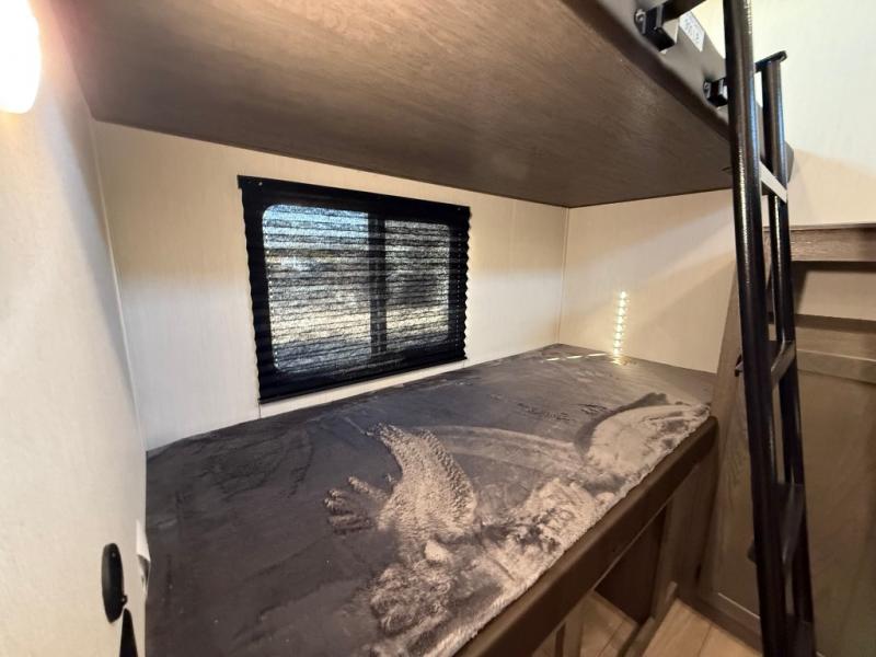 Invite the whole gang with this spacious fifth wheel in tow! The rear private bunkhouse includes triple bunks, a dinette, plus a TV stand with a dresser to keep your space tidy. You'll find a queen bed in the front private bedroom, along with two wardrobes and an overhead cabinet for books. Everyone can meet in the combined kitchen and living area to relax on the tri-fold sofa, play a game around the U-shaped dinette, or just enjoy the fireplace! The chef of your group will have an interior kitchen to cook meals each day, or they can head outside to use the outdoor kitchen with a refrigerator. There is also a 20' patio awning and outside storage to keep hiking gear packed away.