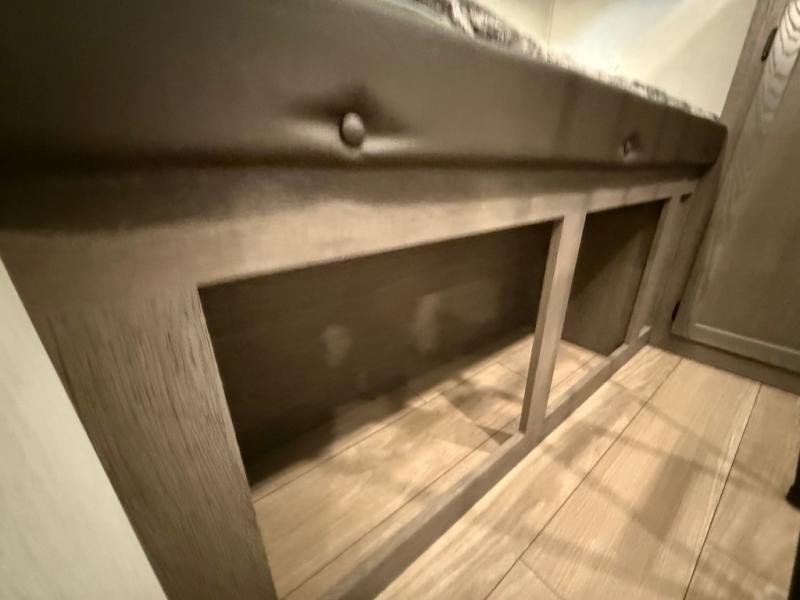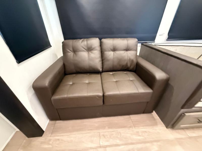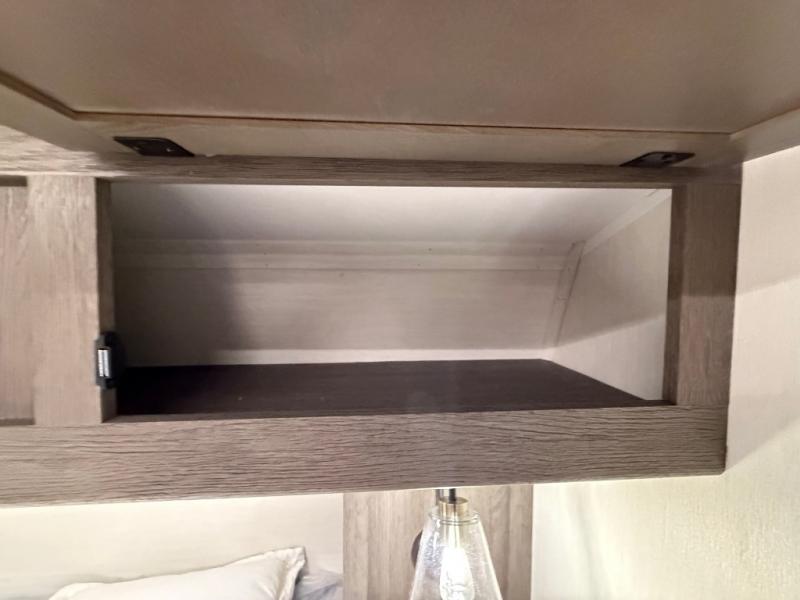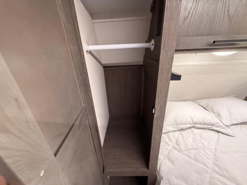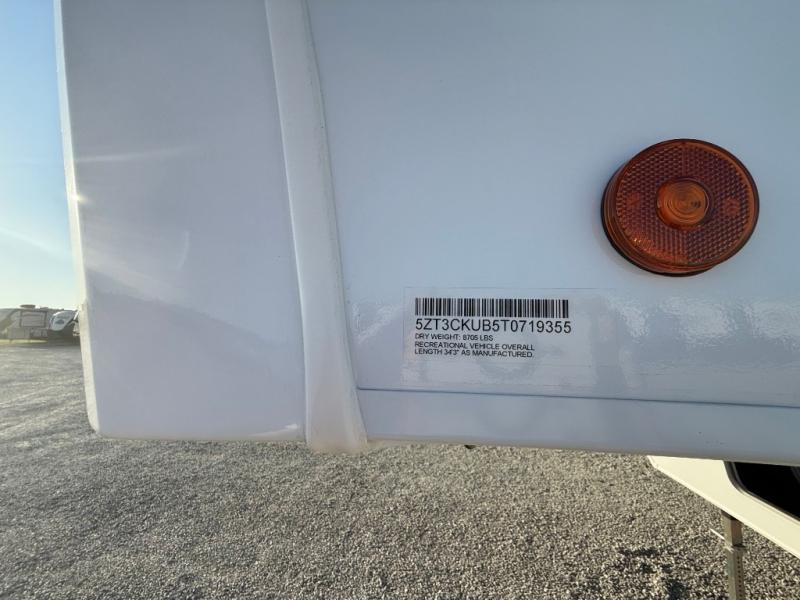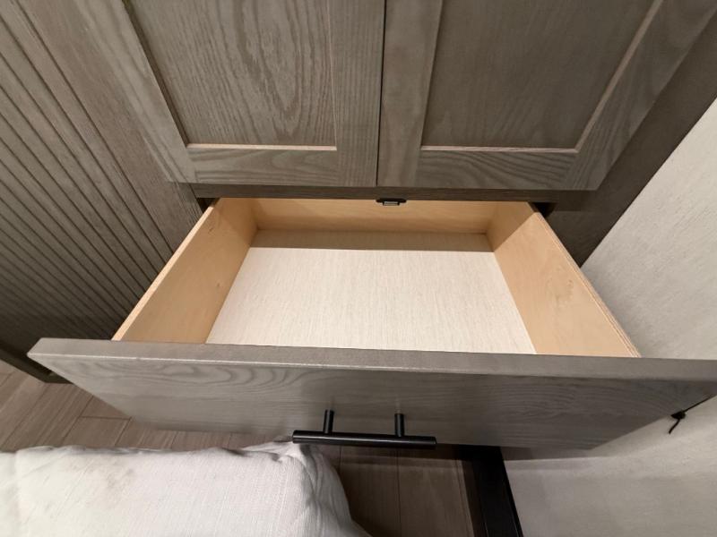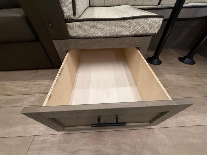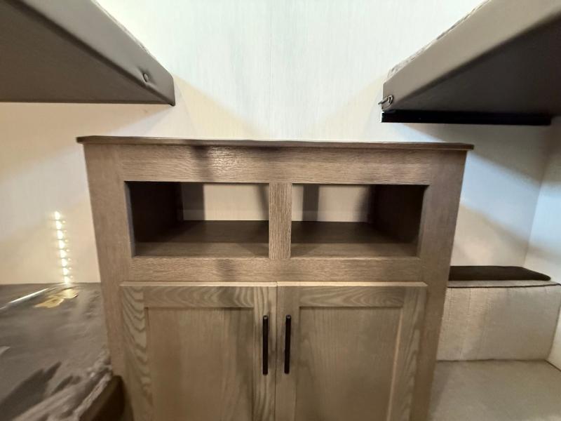 Invite the whole gang with this spacious fifth wheel in tow! The rear private bunkhouse includes triple bunks, a dinette, plus a TV stand with a dresser to keep your space tidy. You'll find a queen bed in the front private bedroom, along with two wardrobes and an overhead cabinet for books. Everyone can meet in the combined kitchen and living area to relax on the tri-fold sofa, play a game around the U-shaped dinette, or just enjoy the fireplace! The chef of your group will have an interior kitchen to cook meals each day, or they can head outside to use the outdoor kitchen with a refrigerator. There is also a 20' patio awning and outside storage to keep hiking gear packed away.