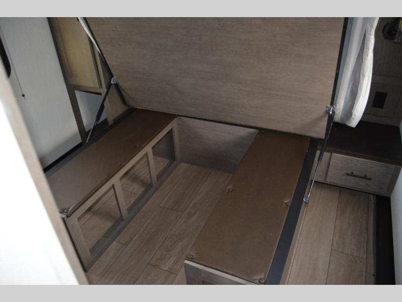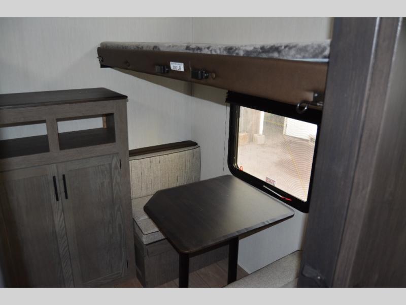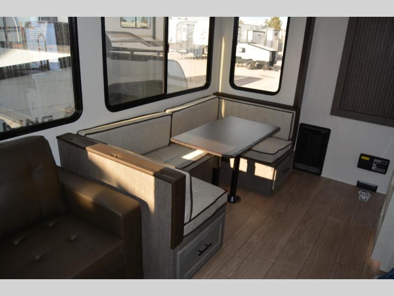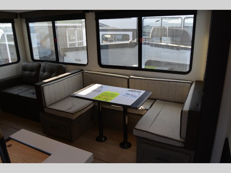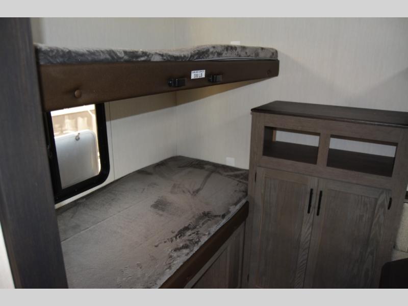 Invite the whole gang with this spacious fifth wheel in tow! The rear private bunkhouse includes triple bunks, a dinette, plus a TV stand with a dresser to keep your space tidy. You'll find a queen bed in the front private bedroom, along with two wardrobes and an overhead cabinet for books. Everyone can meet in the combined kitchen and living area to relax on the tri-fold sofa, play a game around the U-shaped dinette, or just enjoy the fireplace! The chef of your group will have an interior kitchen to cook meals each day, or they can head outside to use the outdoor kitchen with a refrigerator. There is also a 20' patio awning and outside storage to keep hiking gear packed away.
