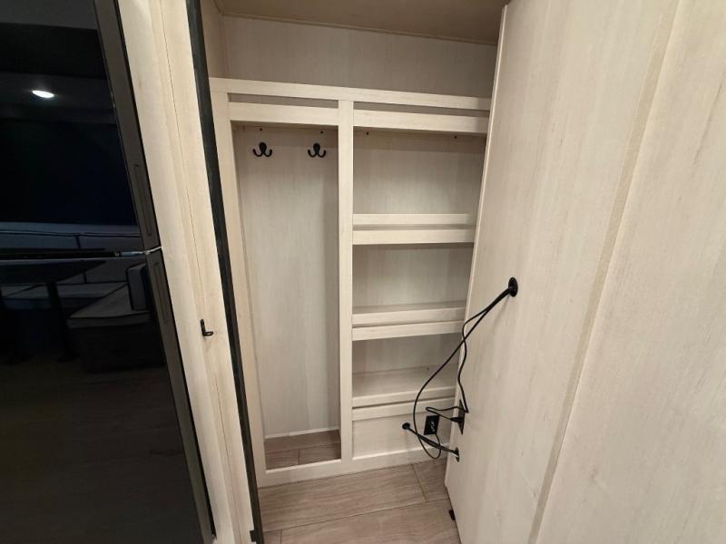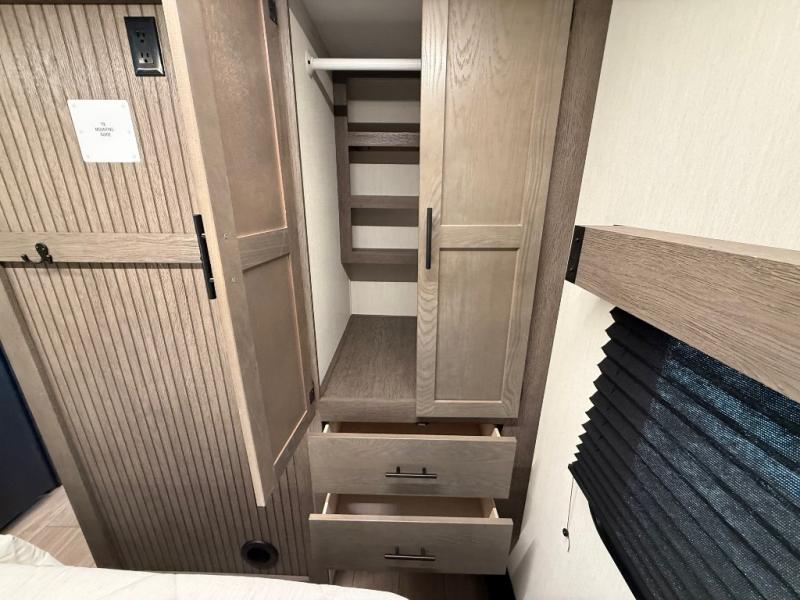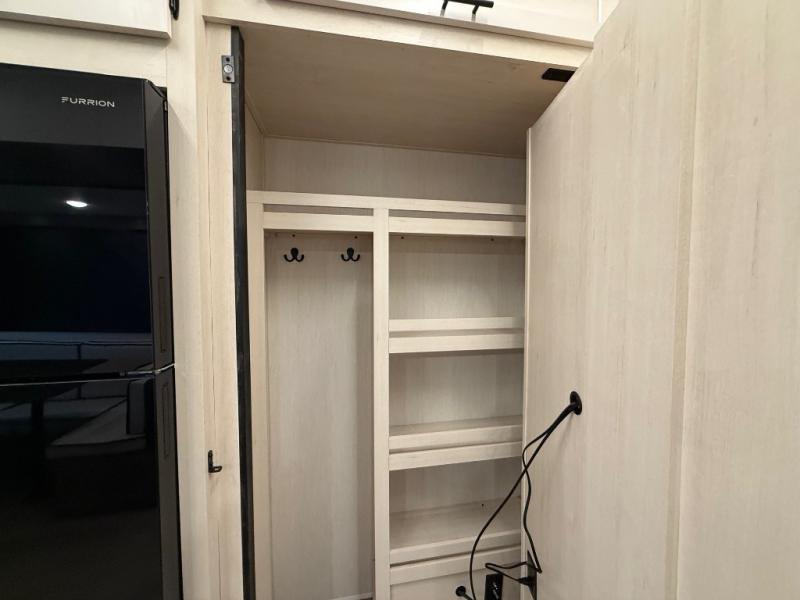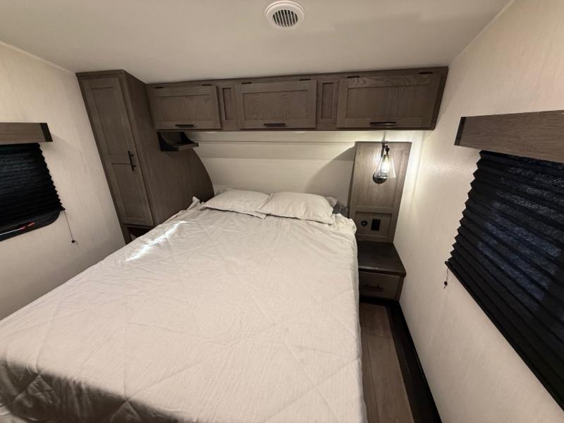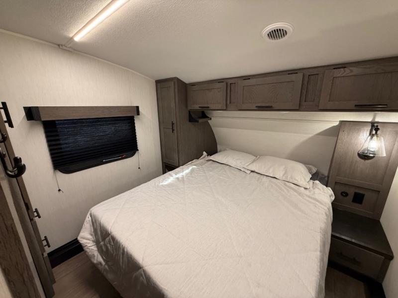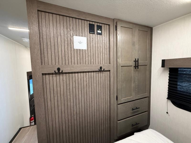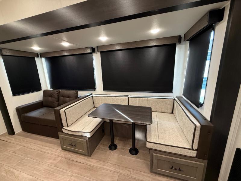 Invite the whole gang with this spacious fifth wheel in tow! The rear private bunkhouse includes triple bunks, a dinette, plus a TV stand with a dresser to keep your space tidy. You'll find a queen bed in the front private bedroom, along with two wardrobes and an overhead cabinet for books. Everyone can meet in the combined kitchen and living area to relax on the tri-fold sofa, play a game around the U-shaped dinette, or just enjoy the fireplace! The chef of your group will have an interior kitchen to cook meals each day, or they can head outside to use the outdoor kitchen with a refrigerator. There is also a 20' patio awning and outside storage to keep hiking gear packed away.