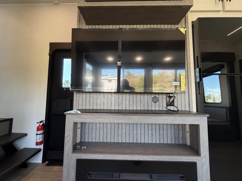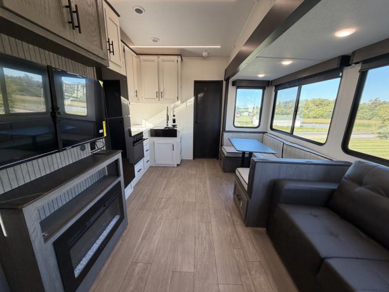 Let the fun times begin with the purchase of this Cherokee Arctic Wolf fifth wheel! You'll have loads of sleeping space for ten tired travelers with the front private bedroom, rear private bunkhouse, U-shaped dinette, and tri-fold sofa. You'll also have excellent storage space with the bunkhouse wardrobe, large walk-in pantry next to the entry door, and the outside storage areas. The large slide in the main living area offers more living space, and the fireplace will make it feel more like home.