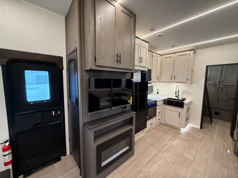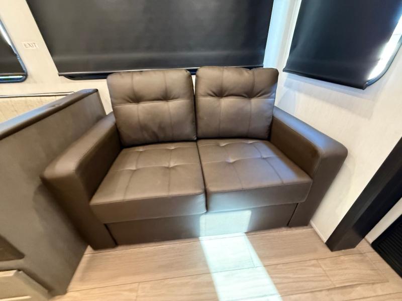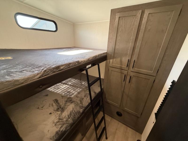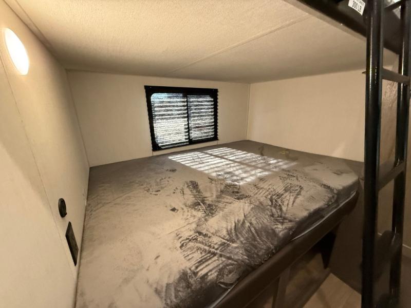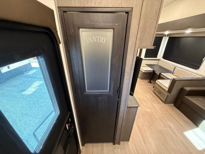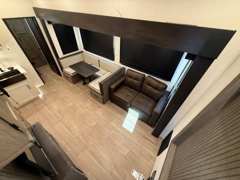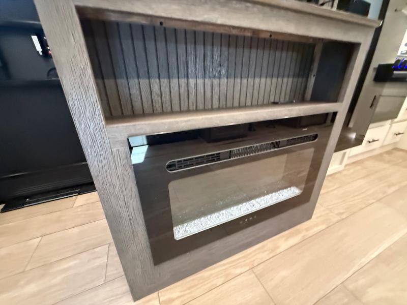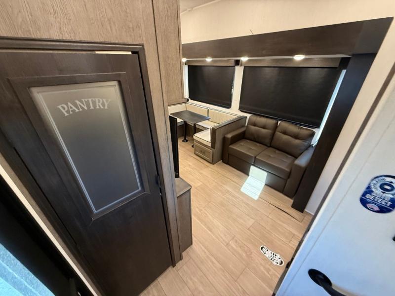 Let the fun times begin with the purchase of this Cherokee Arctic Wolf fifth wheel! You'll have loads of sleeping space for ten tired travelers with the front private bedroom, rear private bunkhouse, U-shaped dinette, and tri-fold sofa. You'll also have excellent storage space with the bunkhouse wardrobe, large walk-in pantry next to the entry door, and the outside storage areas. The large slide in the main living area offers more living space, and the fireplace will make it feel more like home.