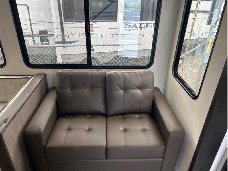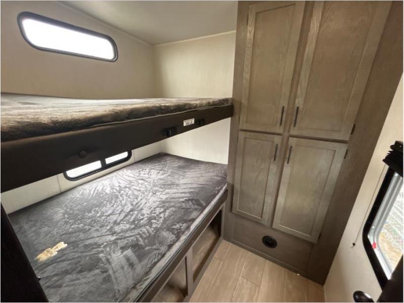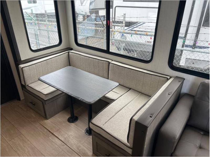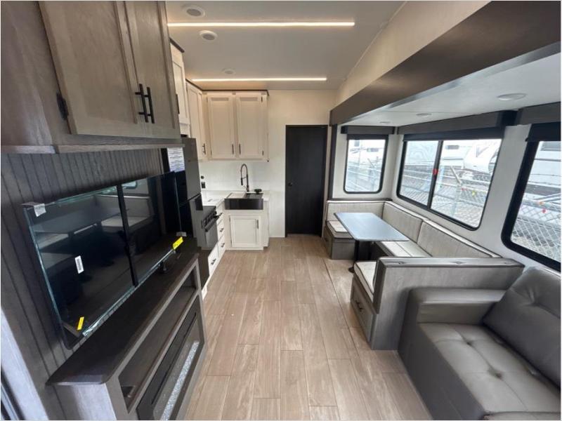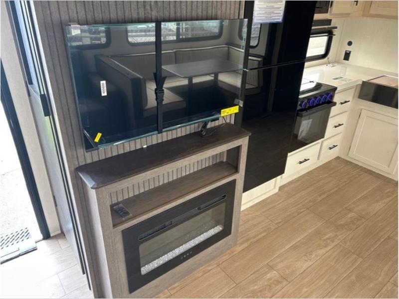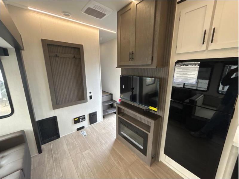 Let the fun times begin with the purchase of this Cherokee Arctic Wolf fifth wheel! You'll have loads of sleeping space for ten tired travelers with the front private bedroom, rear private bunkhouse, U-shaped dinette, and tri-fold sofa. You'll also have excellent storage space with the bunkhouse wardrobe, large walk-in pantry next to the entry door, and the outside storage areas. The large slide in the main living area offers more living space, and the fireplace will make it feel more like home.