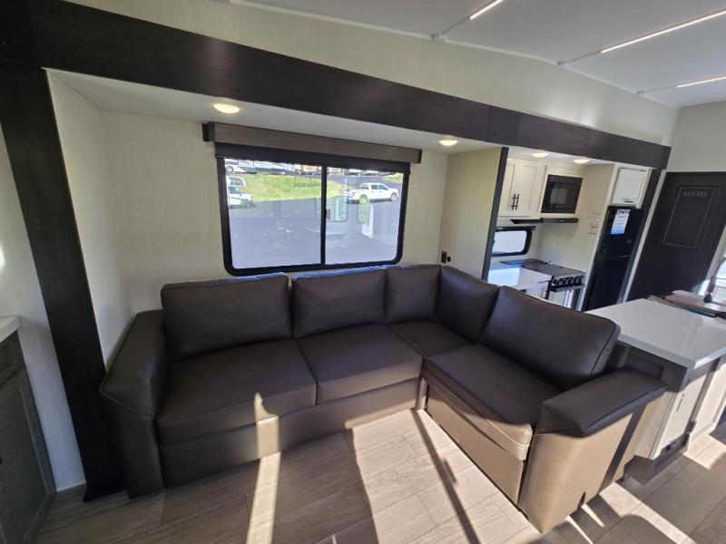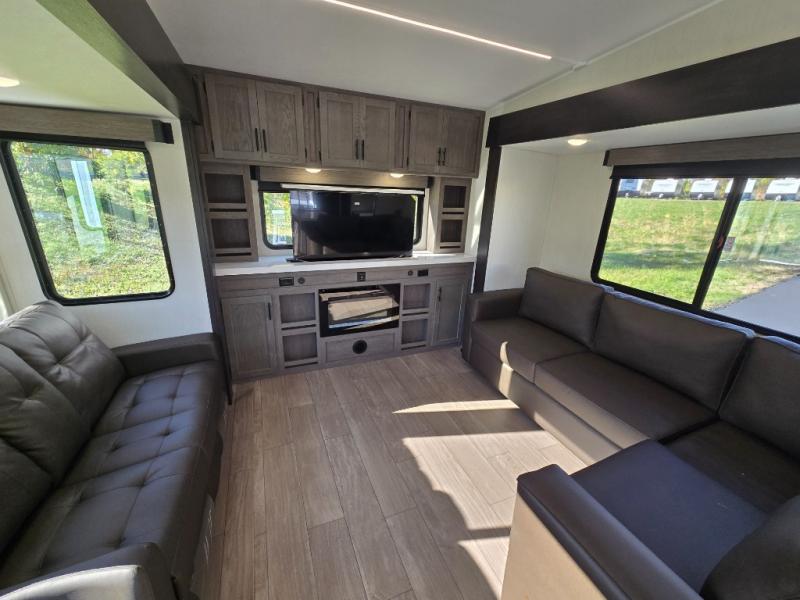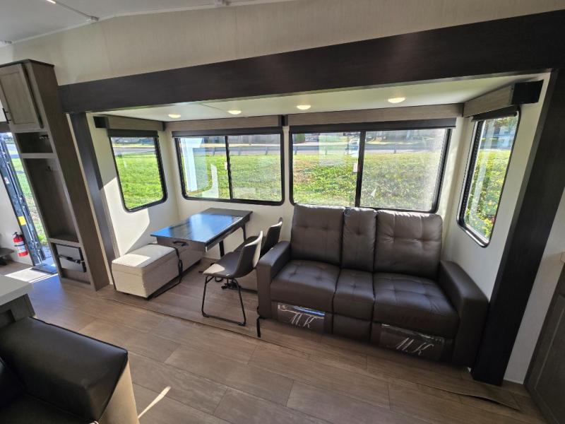 Enjoy time at the campground in this spacious fifth wheel! Once you arrive at the campground, you can unload the outside storage, put out the 15' awning, then head inside to make lunch on the three burner cooktop. Your crew can dine at the free-standing table and chairs, then relax on the dual tri-fold sofas. There is also theater seating, all in great view of the rear televator TV and fireplace. A full bath with a spacious shower will let you freshen up before bed, and the queen bed in the front bedroom is sure to bring a great night's rest!