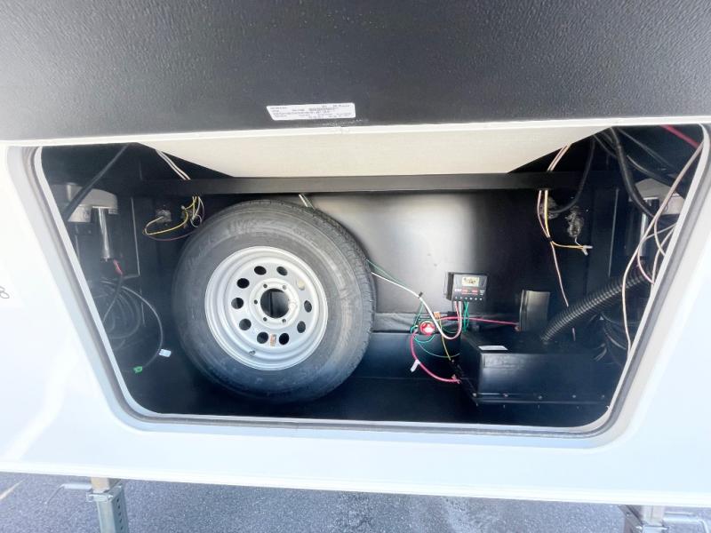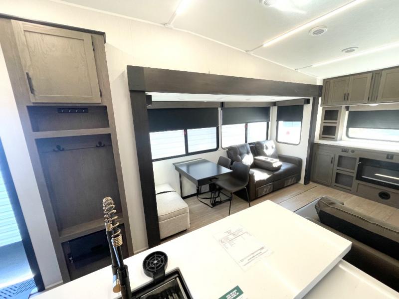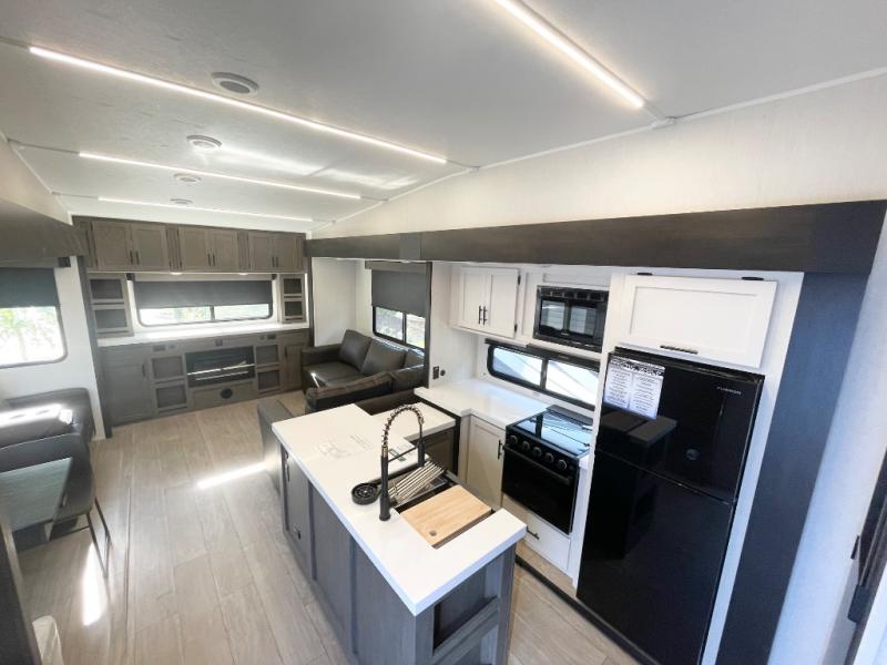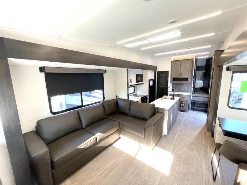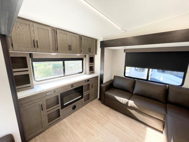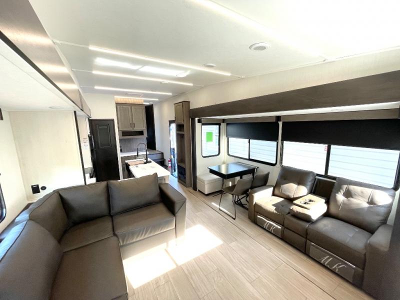 Enjoy time at the campground in this spacious fifth wheel! Once you arrive at the campground, you can unload the outside storage, put out the 15' awning, then head inside to make lunch on the three burner cooktop. Your crew can dine at the free-standing table and chairs, then relax on the dual tri-fold sofas. There is also theater seating, all in great view of the rear televator TV and fireplace. A full bath with a spacious shower will let you freshen up before bed, and the queen bed in the front bedroom is sure to bring a great night's rest!