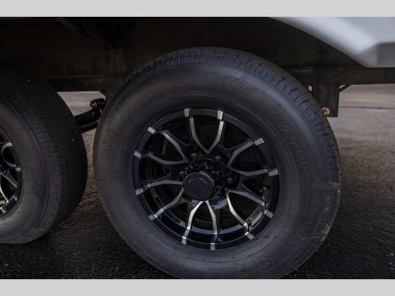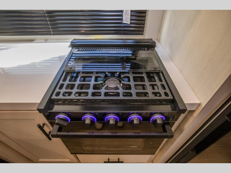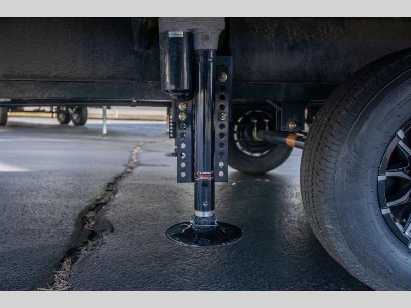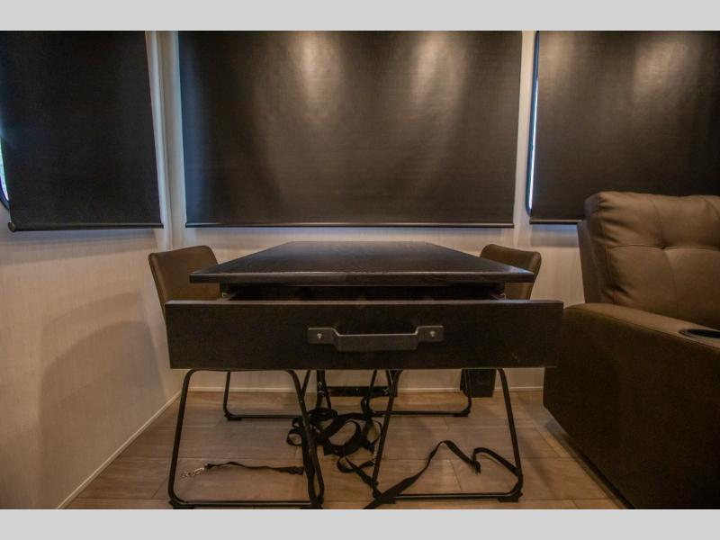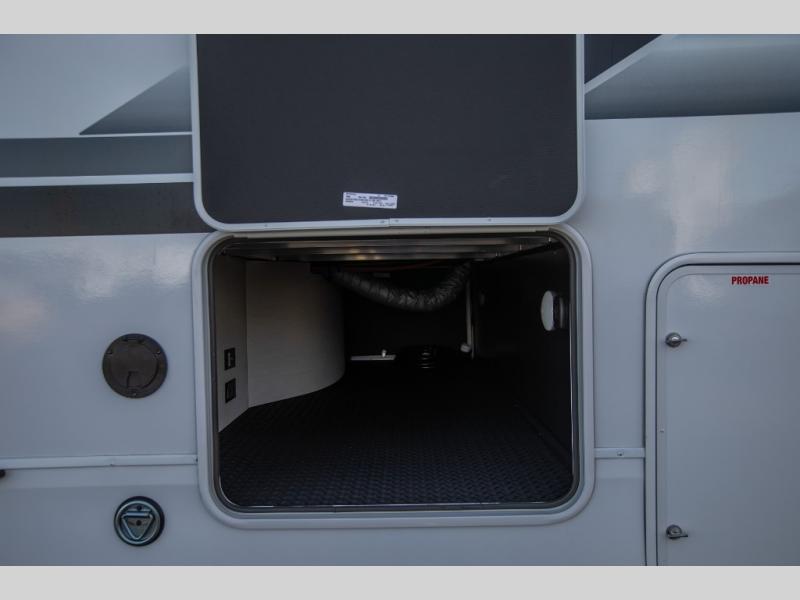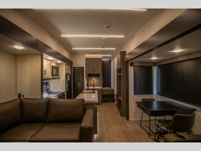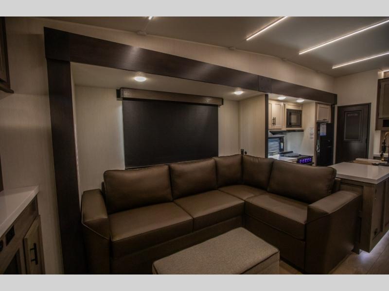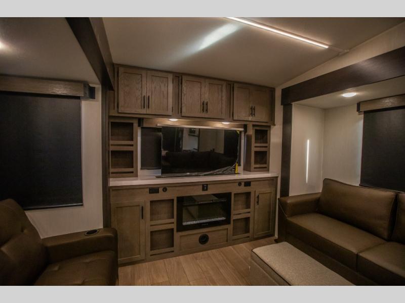 Enjoy time at the campground in this spacious fifth wheel! Once you arrive at the campground, you can unload the outside storage, put out the 15' awning, then head inside to make lunch on the three burner cooktop. Your crew can dine at the free-standing table and chairs, then relax on the dual tri-fold sofas. There is also theater seating, all in great view of the rear televator TV and fireplace. A full bath with a spacious shower will let you freshen up before bed, and the queen bed in the front bedroom is sure to bring a great night's rest!