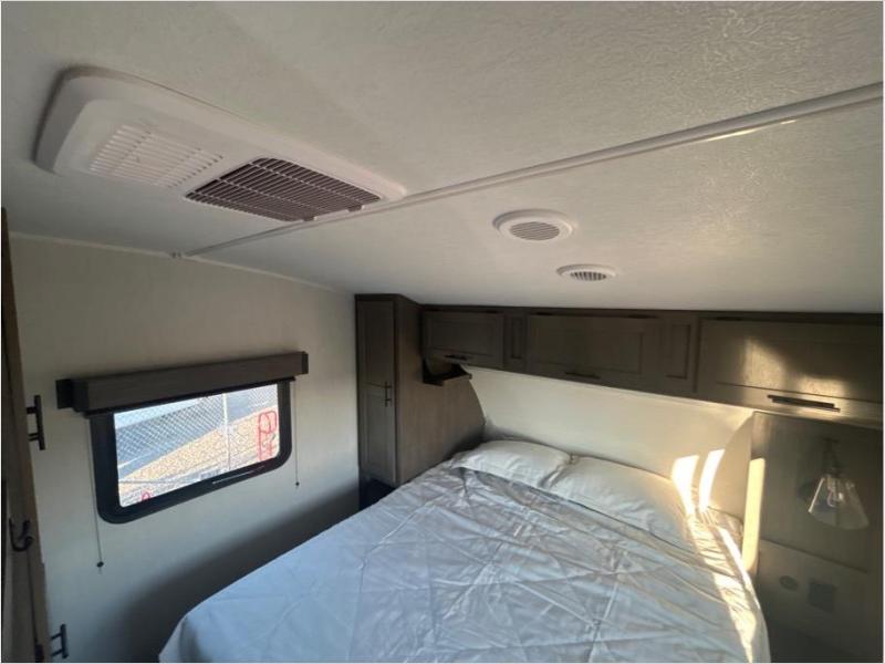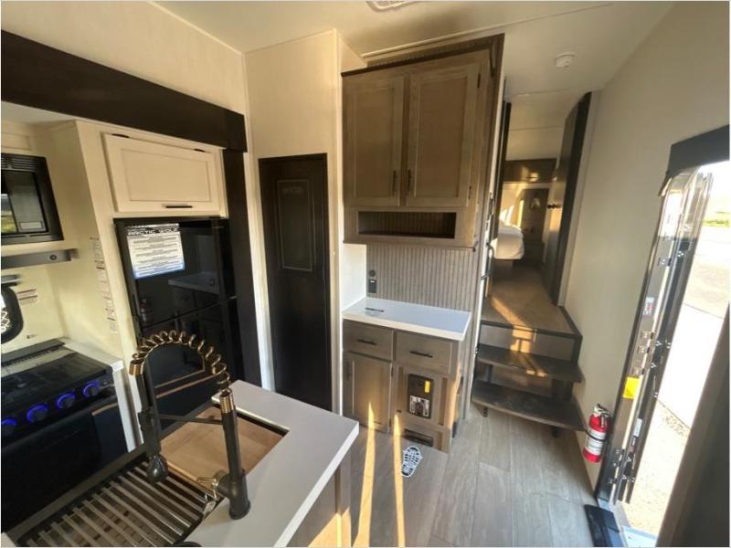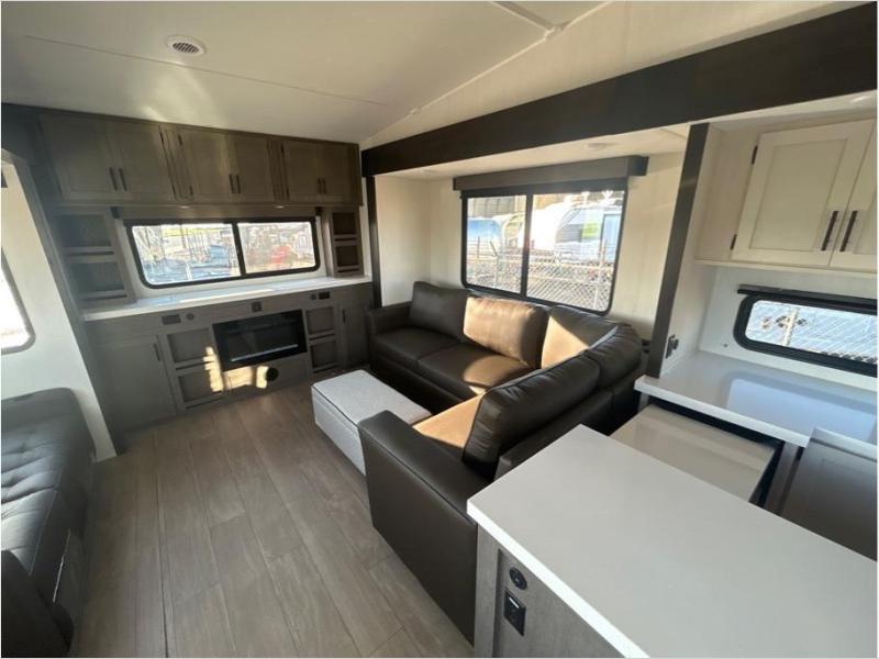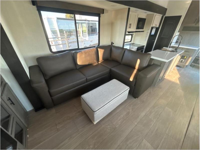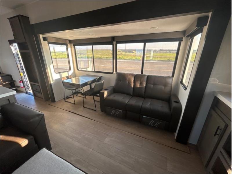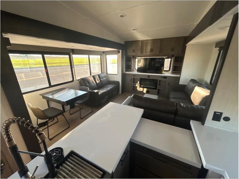 Enjoy time at the campground in this spacious fifth wheel! Once you arrive at the campground, you can unload the outside storage, put out the 15' awning, then head inside to make lunch on the three burner cooktop. Your crew can dine at the free-standing table and chairs, then relax on the dual tri-fold sofas. There is also theater seating, all in great view of the rear televator TV and fireplace. A full bath with a spacious shower will let you freshen up before bed, and the queen bed in the front bedroom is sure to bring a great night's rest!