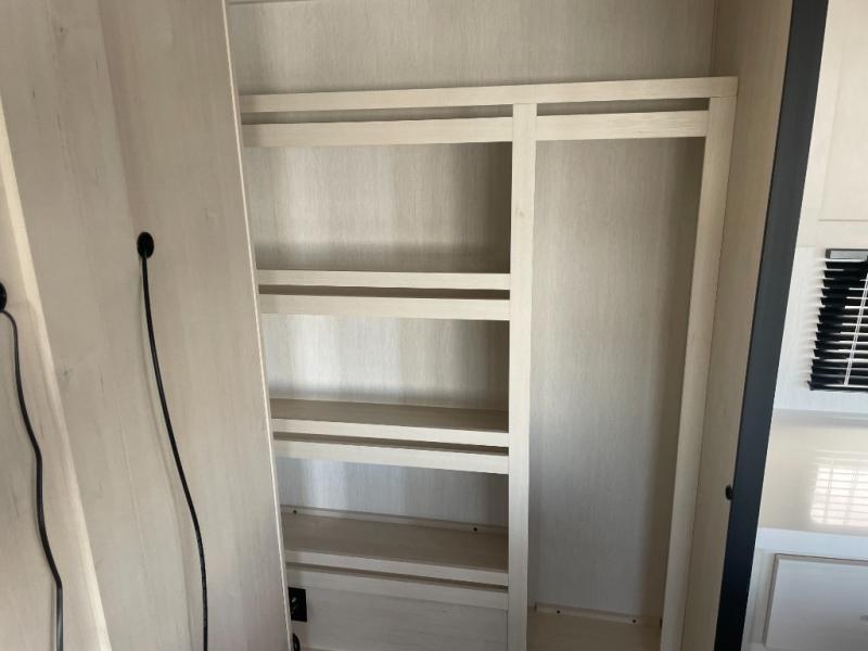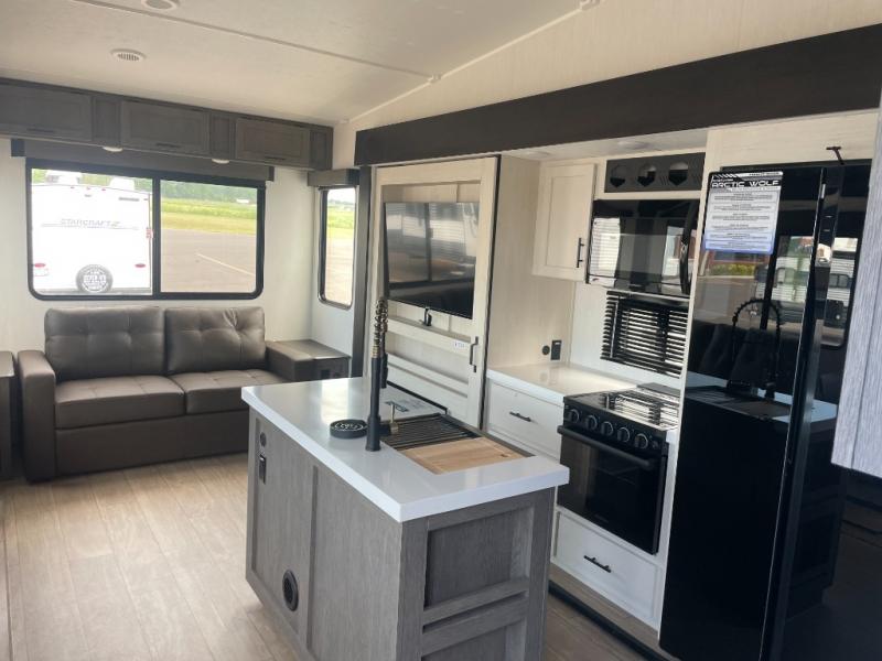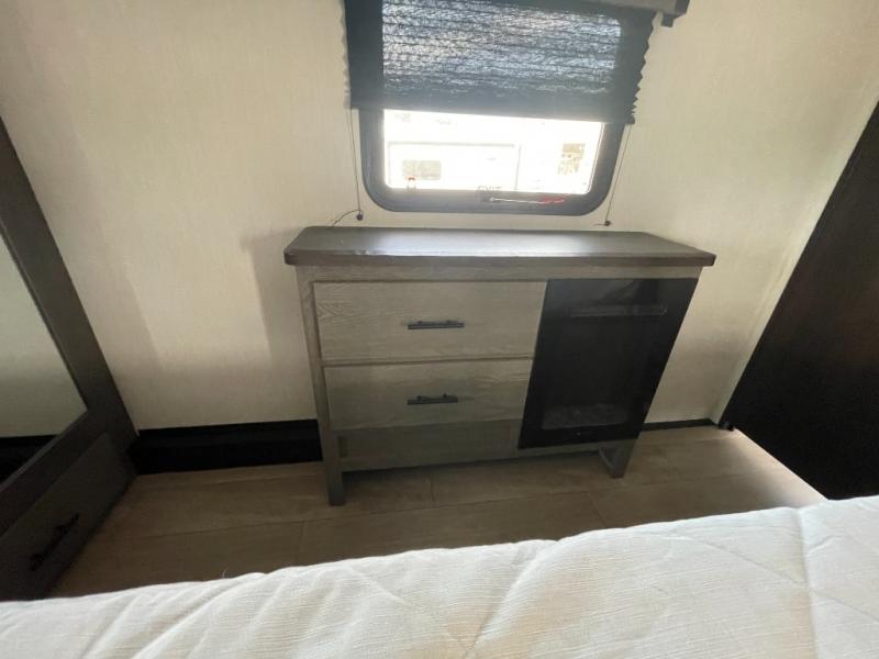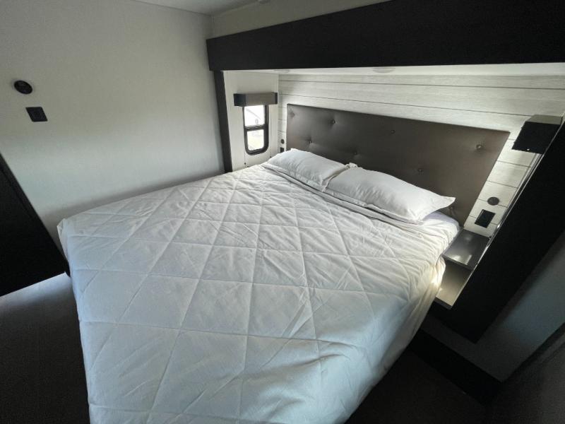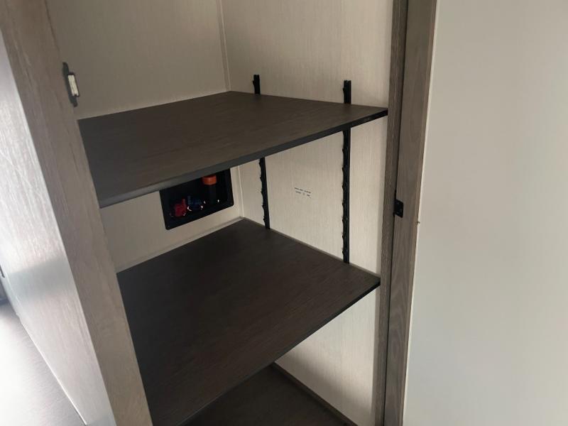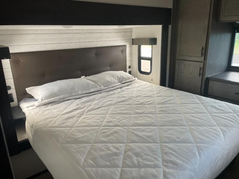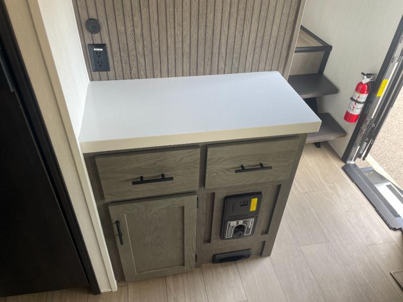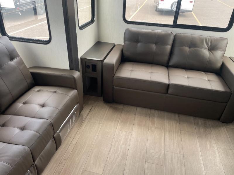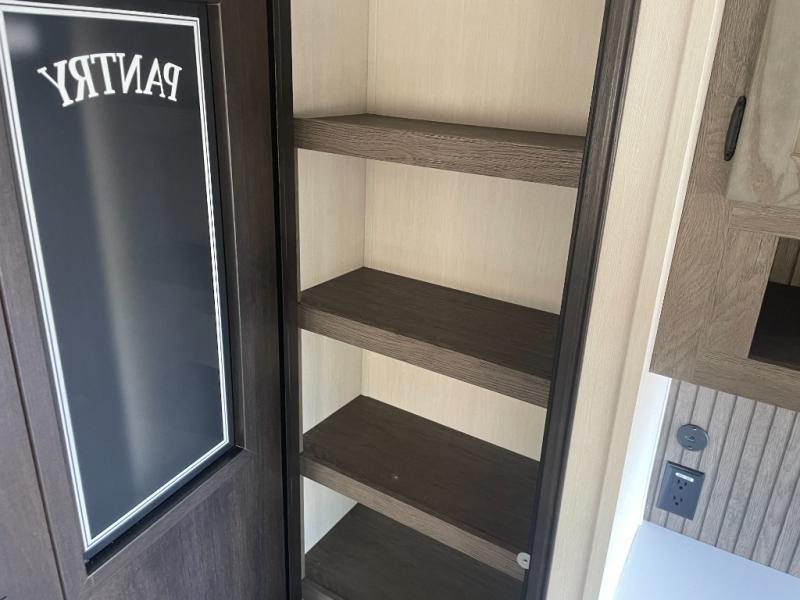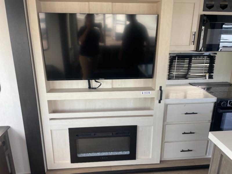 This Cherokee Arctic Wolf fifth wheel is quite extraordinary and accommodating! It has a set of opposing slides in the main living area so you can have more space to sit back on the theater seating and tri-fold sofa. You can switch on the fireplace to add some warmth to this space if it's a cool night. The free-standing table and chairs is going to be great for sitting down to eat a meal together, and there is even a storage ottoman seat for board games or throw blankets. You'll also be able to grab dessert from the large hidden pantry closet to go with your coffee. The private bedroom up front is going to provide great relaxation with its king bed slide. The spacious wardrobe includes a sun bench as well as washer/dryer prep, and there's even a second fireplace in the bedroom for the ultimate in coziness.