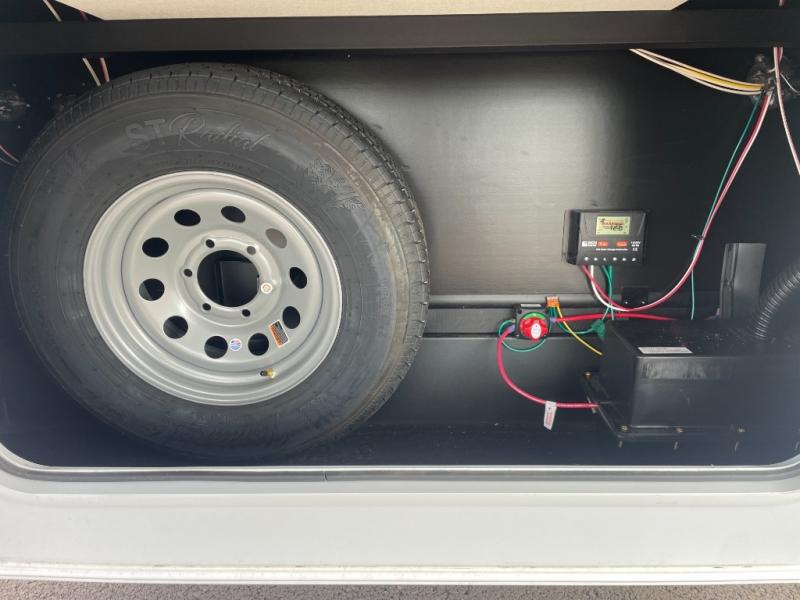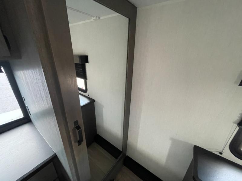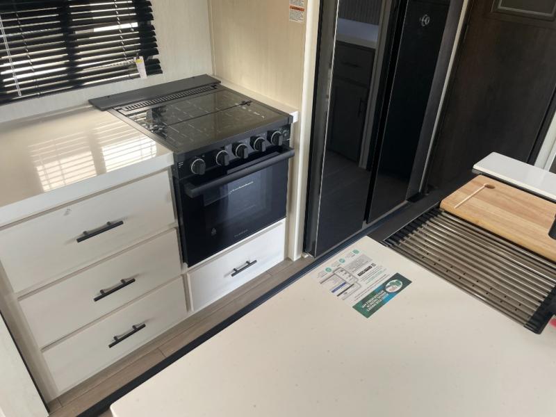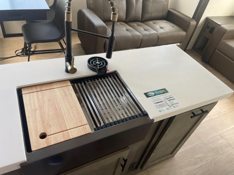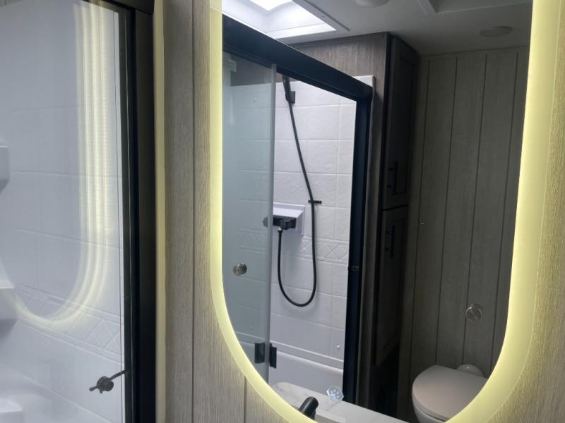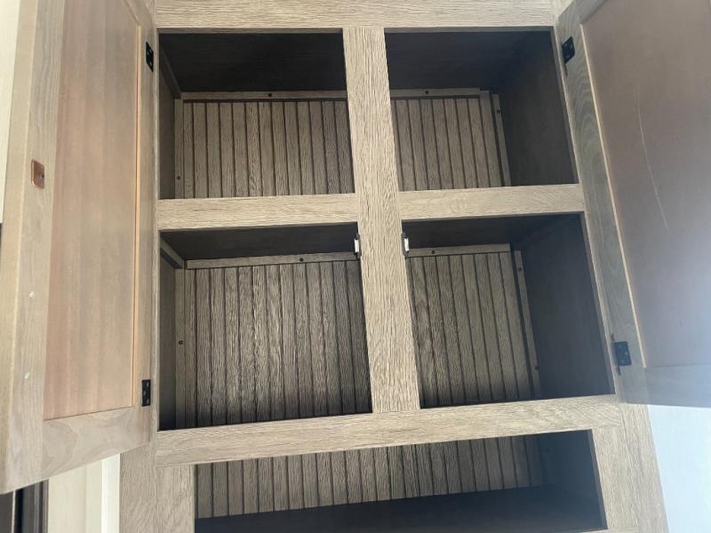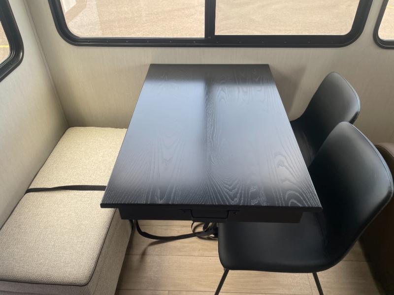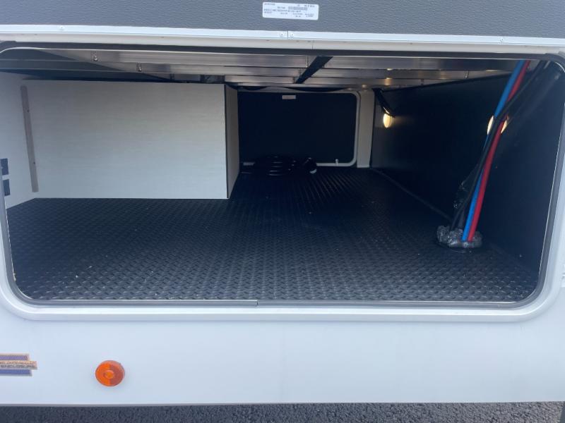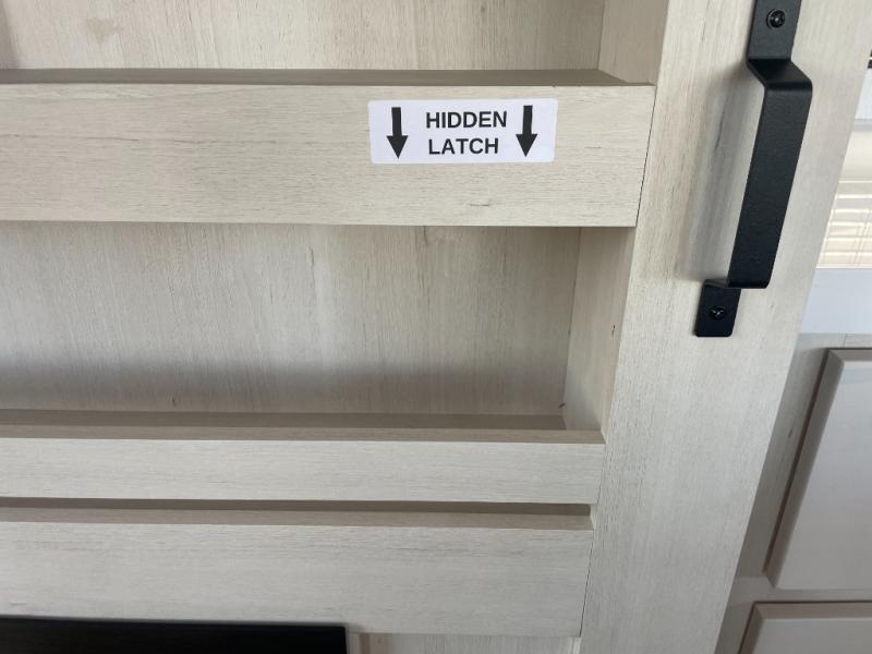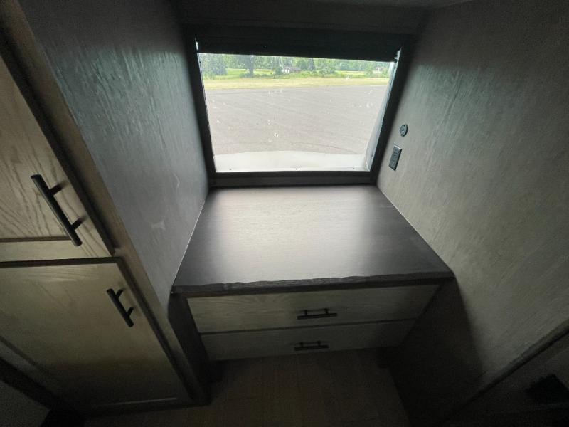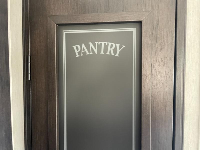 This Cherokee Arctic Wolf fifth wheel is quite extraordinary and accommodating! It has a set of opposing slides in the main living area so you can have more space to sit back on the theater seating and tri-fold sofa. You can switch on the fireplace to add some warmth to this space if it's a cool night. The free-standing table and chairs is going to be great for sitting down to eat a meal together, and there is even a storage ottoman seat for board games or throw blankets. You'll also be able to grab dessert from the large hidden pantry closet to go with your coffee. The private bedroom up front is going to provide great relaxation with its king bed slide. The spacious wardrobe includes a sun bench as well as washer/dryer prep, and there's even a second fireplace in the bedroom for the ultimate in coziness.