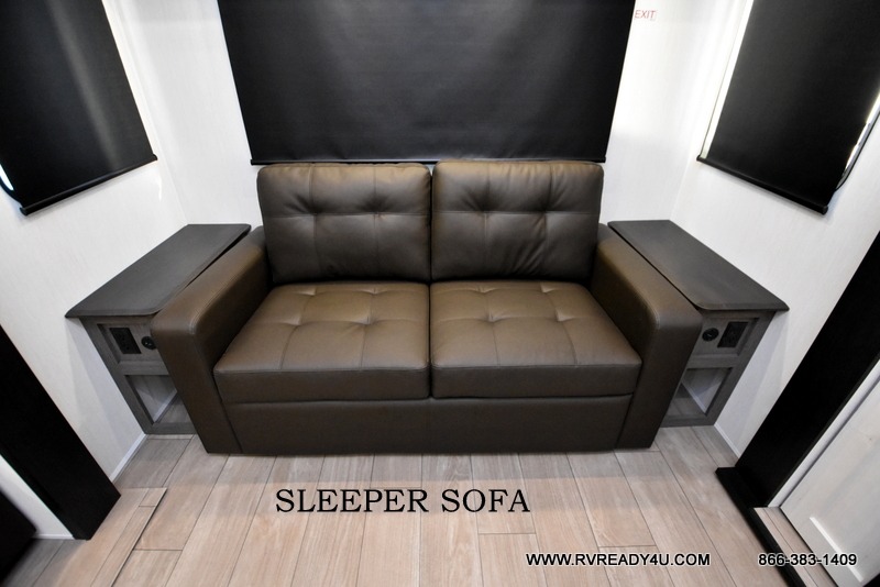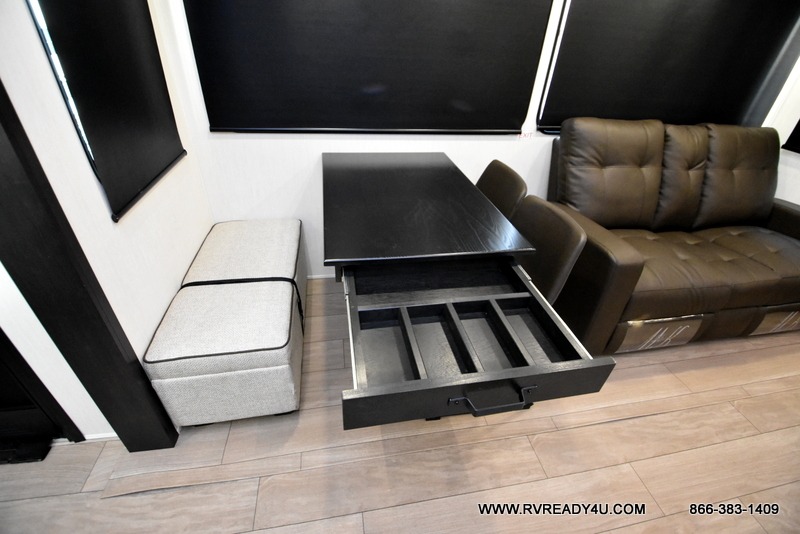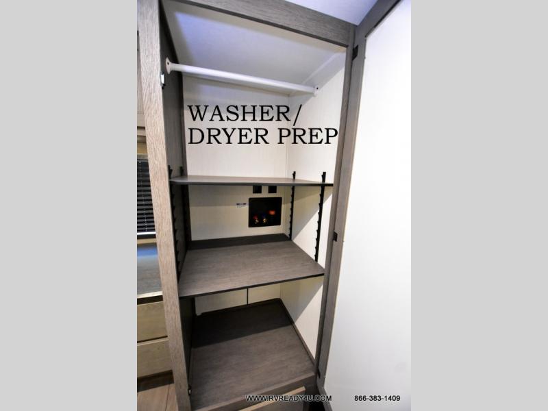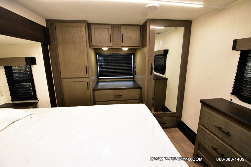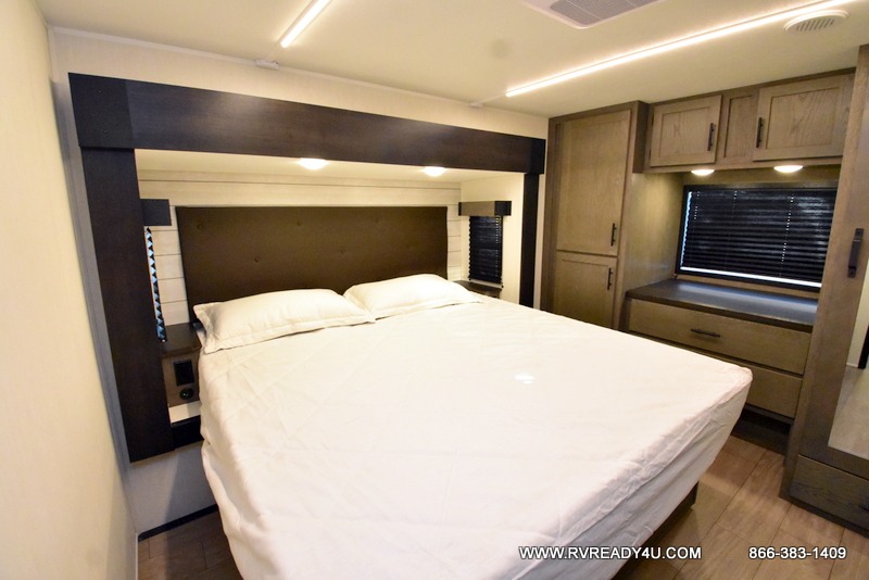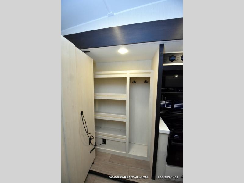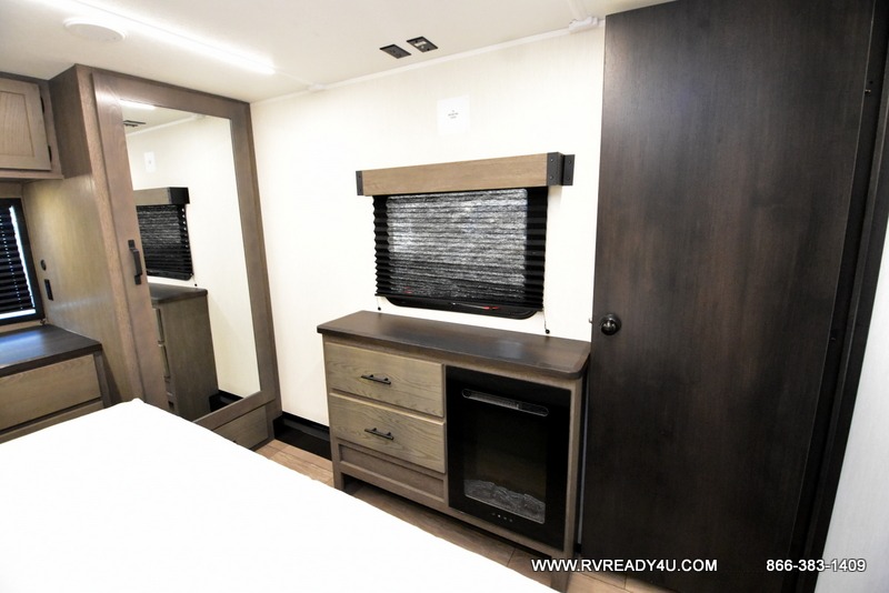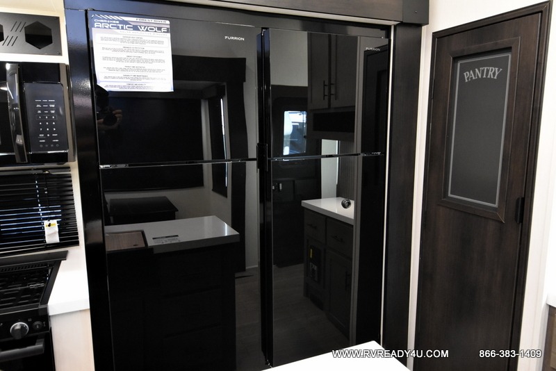 This Cherokee Arctic Wolf fifth wheel is quite extraordinary and accommodating! It has a set of opposing slides in the main living area so you can have more space to sit back on the theater seating and tri-fold sofa. You can switch on the fireplace to add some warmth to this space if it's a cool night. The free-standing table and chairs is going to be great for sitting down to eat a meal together, and there is even a storage ottoman seat for board games or throw blankets. You'll also be able to grab dessert from the large hidden pantry closet to go with your coffee. The private bedroom up front is going to provide great relaxation with its king bed slide. The spacious wardrobe includes washer/dryer prep, and there's even a second fireplace in the bedroom for the ultimate in coziness.