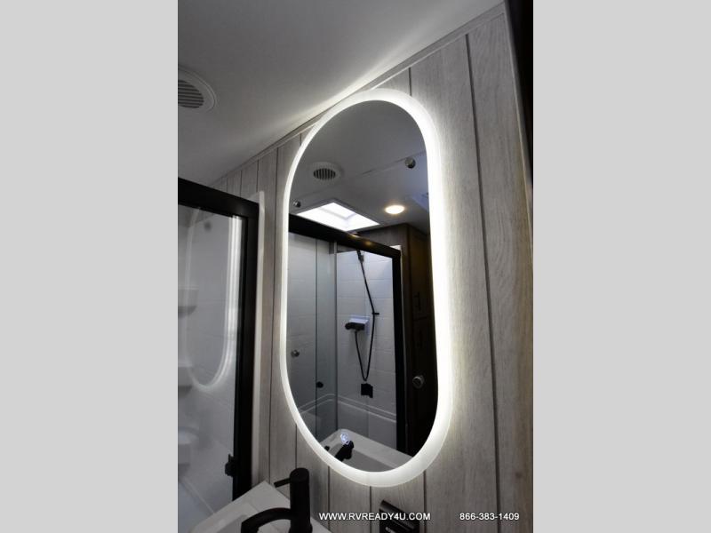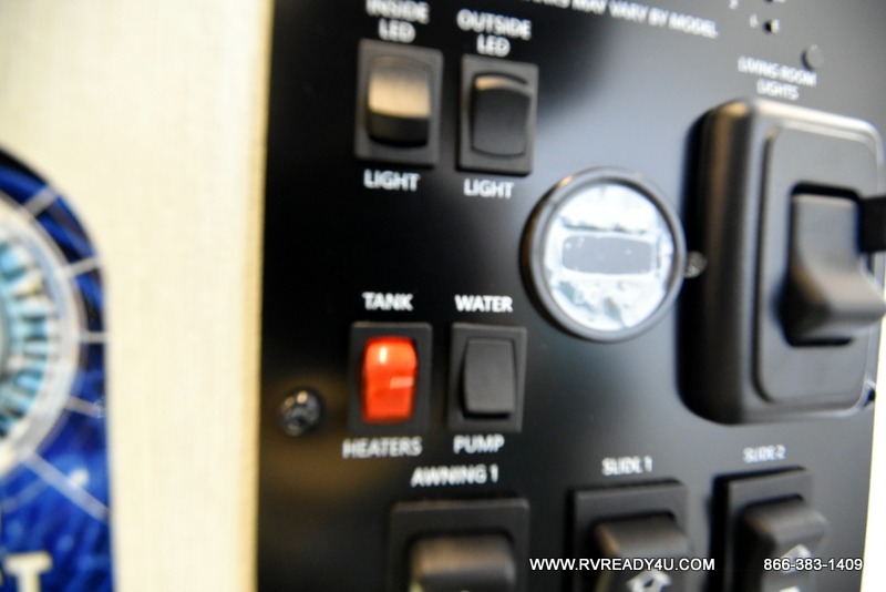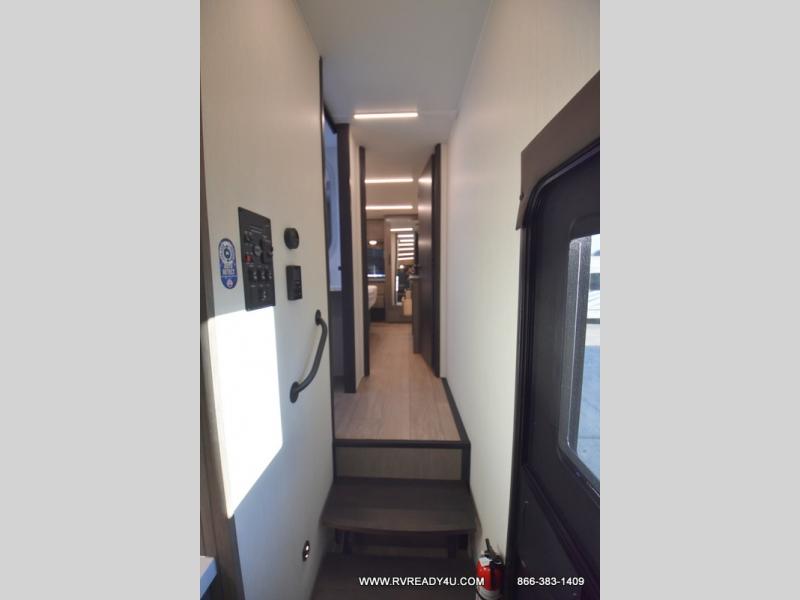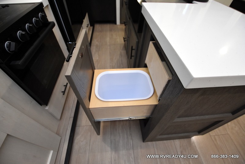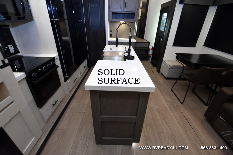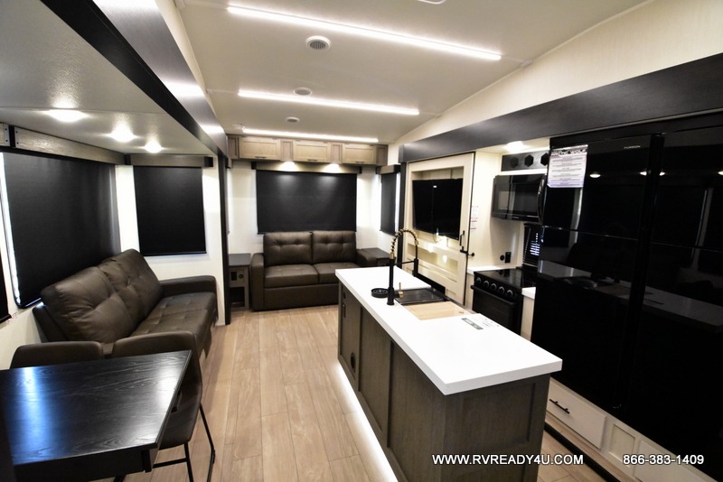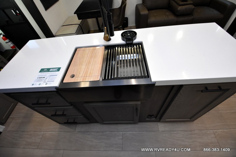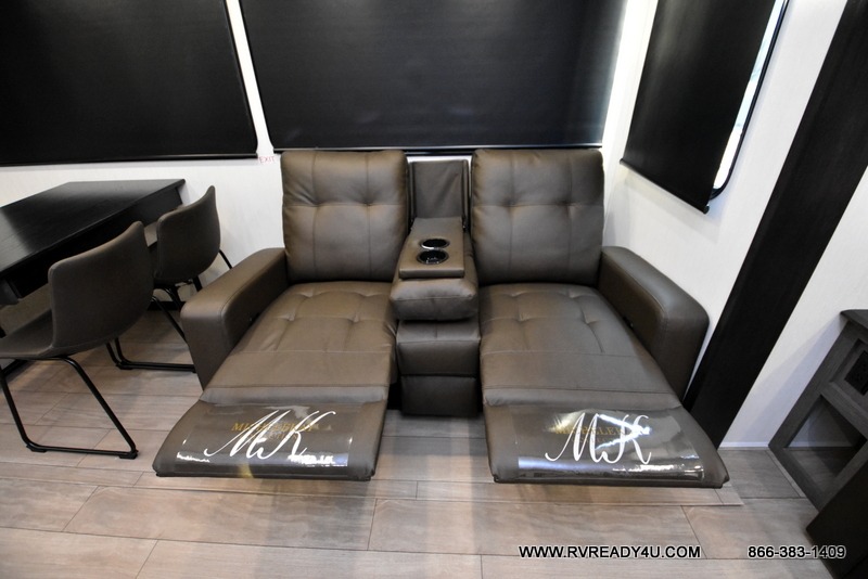 This Cherokee Arctic Wolf fifth wheel is quite extraordinary and accommodating! It has a set of opposing slides in the main living area so you can have more space to sit back on the theater seating and tri-fold sofa. You can switch on the fireplace to add some warmth to this space if it's a cool night. The free-standing table and chairs is going to be great for sitting down to eat a meal together, and there is even a storage ottoman seat for board games or throw blankets. You'll also be able to grab dessert from the large hidden pantry closet to go with your coffee. The private bedroom up front is going to provide great relaxation with its king bed slide. The spacious wardrobe includes washer/dryer prep, and there's even a second fireplace in the bedroom for the ultimate in coziness.