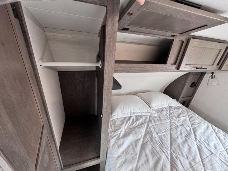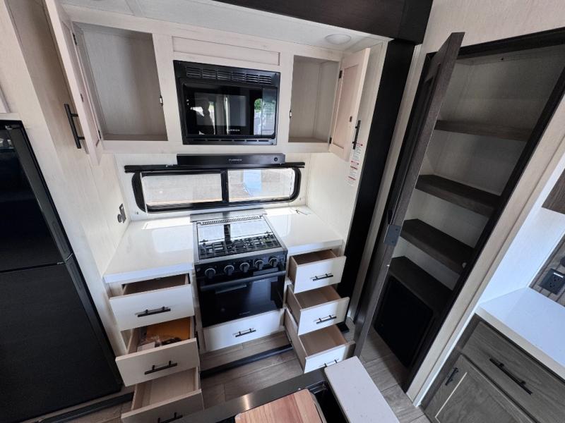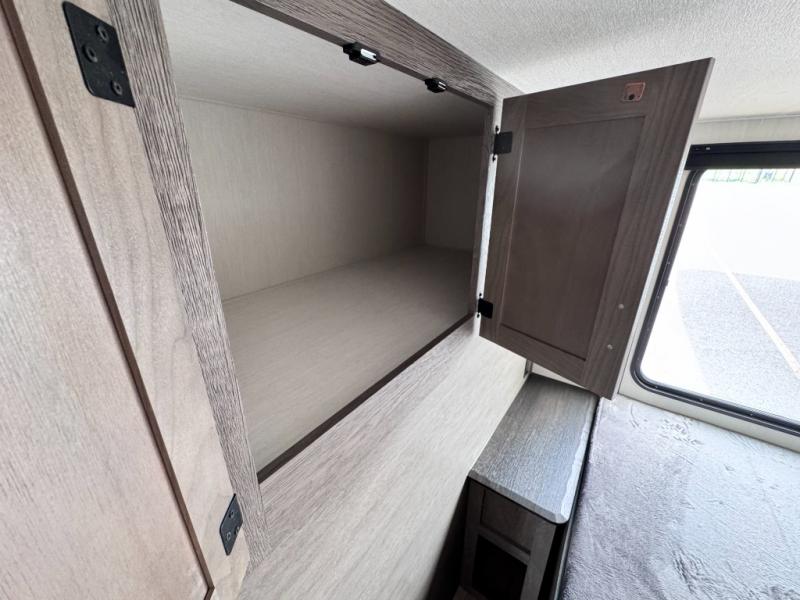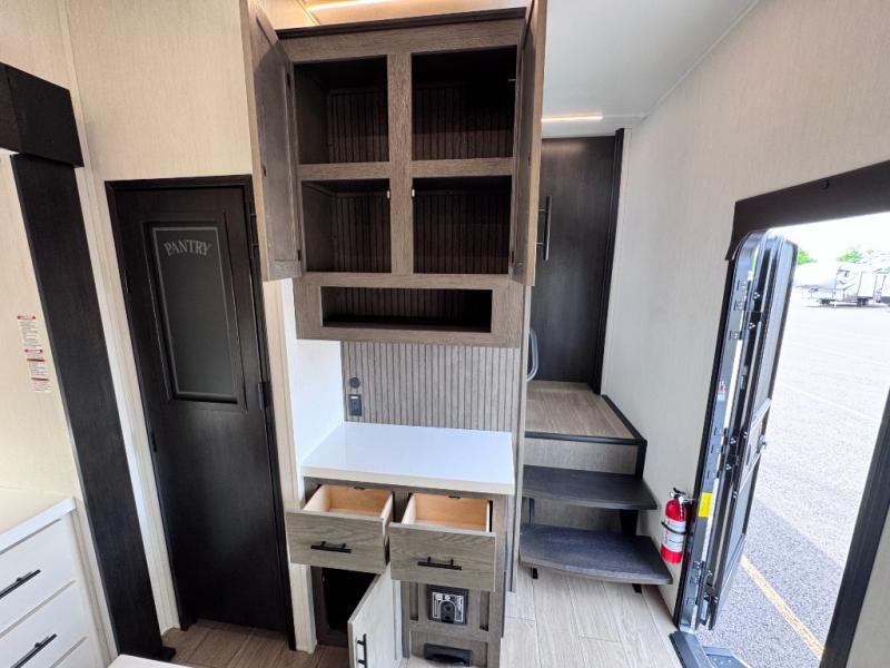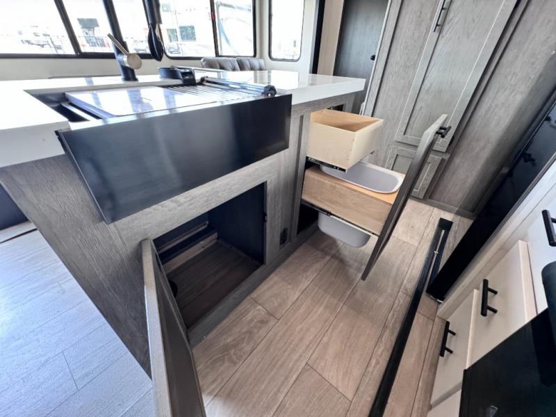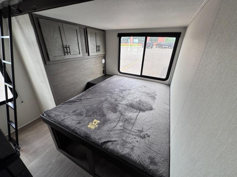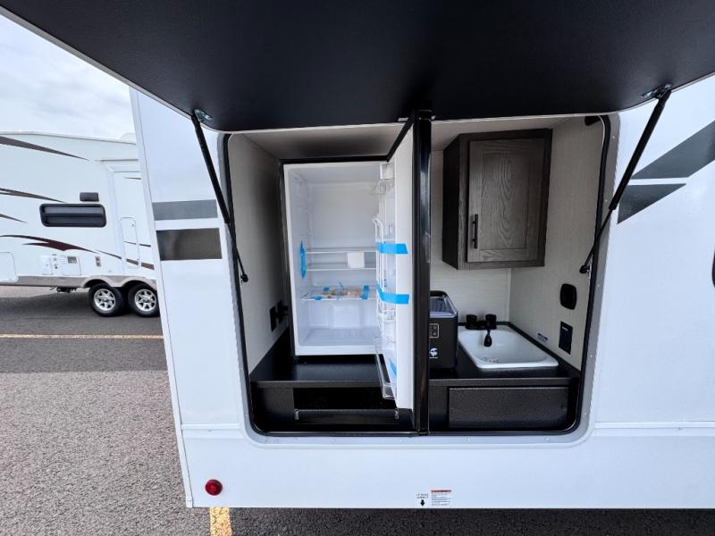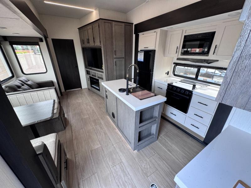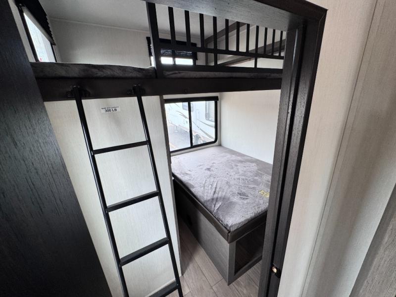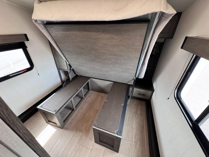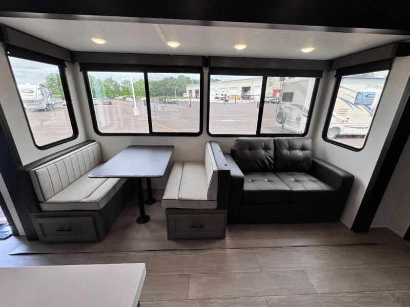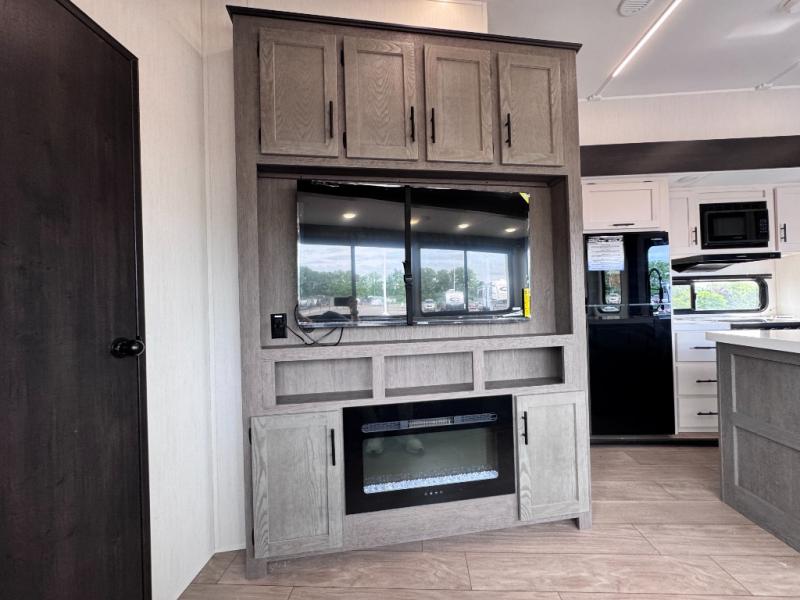 There's not much about this fifth wheel that you won't love! Your guests can claim the rear bunkhouse suite with a 54" x 74" bunk/bed, a 60" x 80" loft bunk, and a half bath for added convenience. You'll have the front private bedroom all to yourselves, and the spacious full bath is close by for easy nighttime use. Everyone can meet in the combined kitchen and living area that is made open thanks to the dual opposing slides. There is also a kitchen island with a trash can, a pull-out countertop extension, a booth dinette, and a tri-fold sofa across from the fireplace; how cozy!