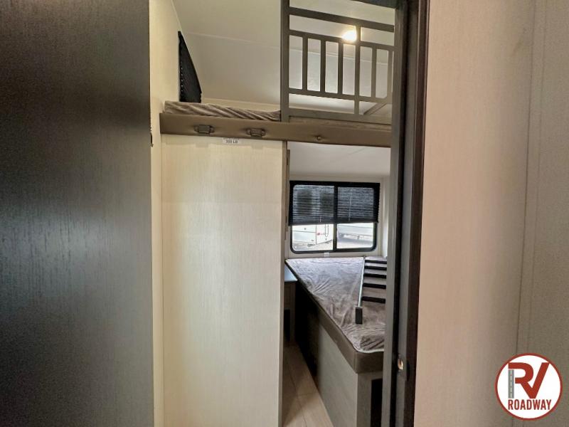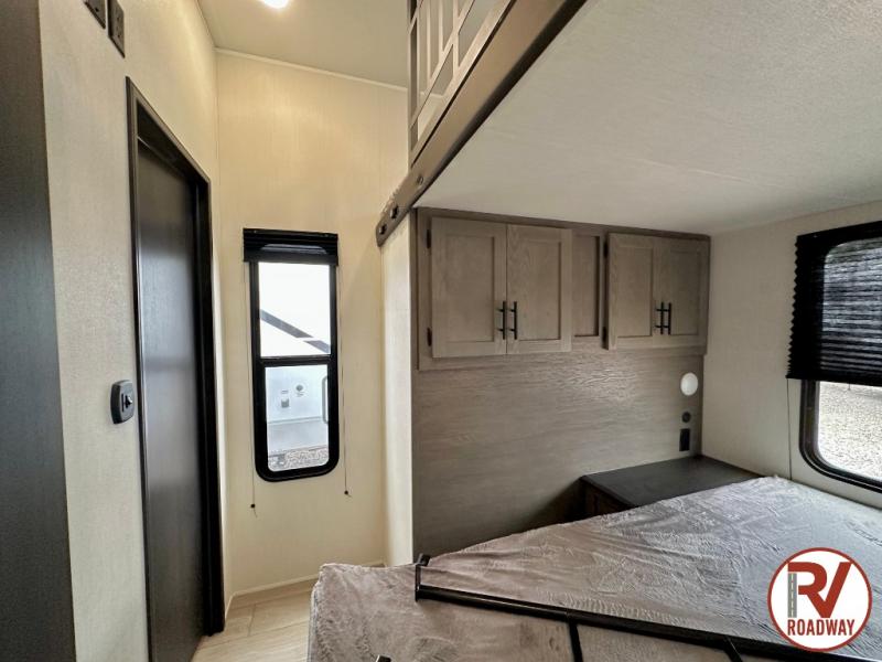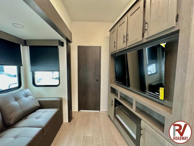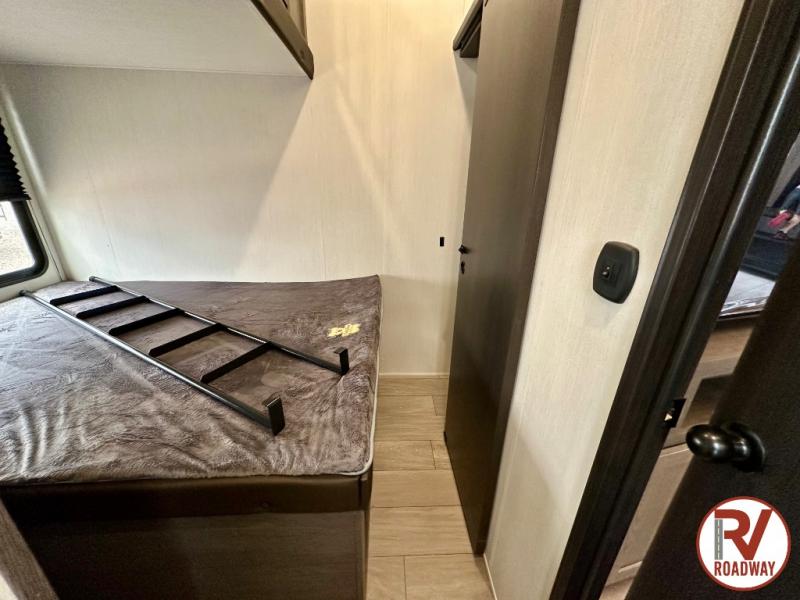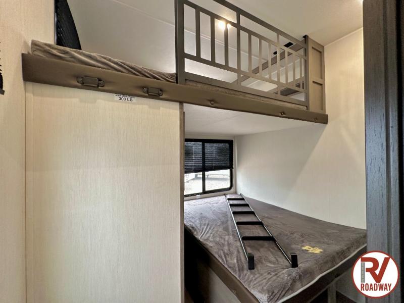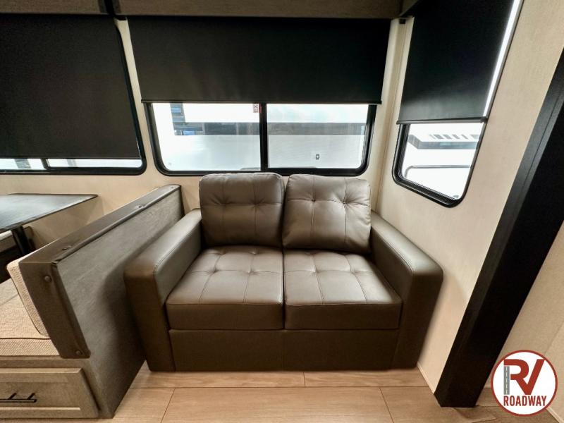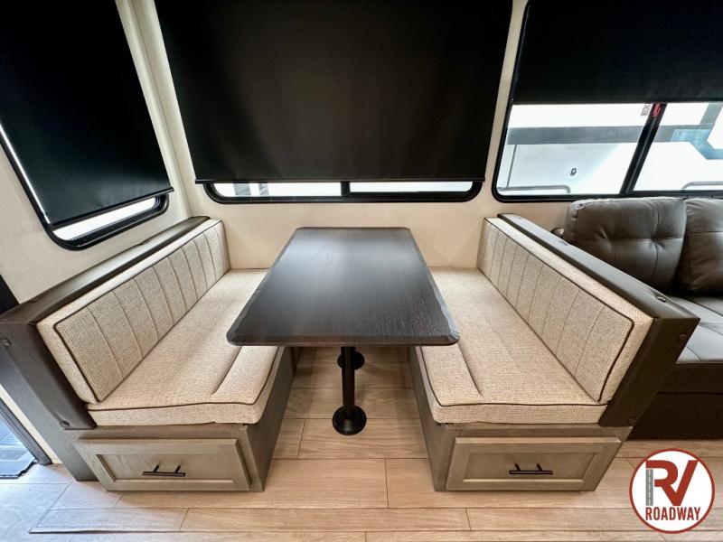 There's not much about this fifth wheel that you won't love! Your guests can claim the rear bunkhouse suite with a 54" x 74" bunk/bed, a 60" x 80" loft bunk, and a half bath for added convenience. You'll have the front private bedroom all to yourselves, and the spacious full bath is close by for easy nighttime use. Everyone can meet in the combined kitchen and living area that is made open thanks to the dual opposing slides. There is also a kitchen island with a trash can, a pull-out countertop extension, a booth dinette, and a tri-fold sofa across from the fireplace; how cozy!