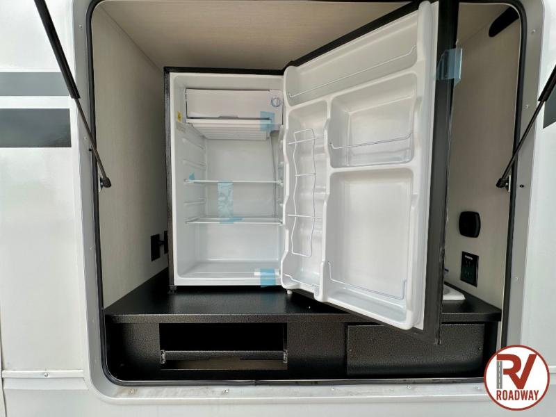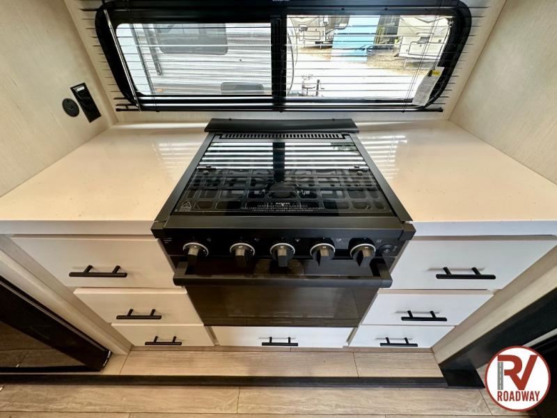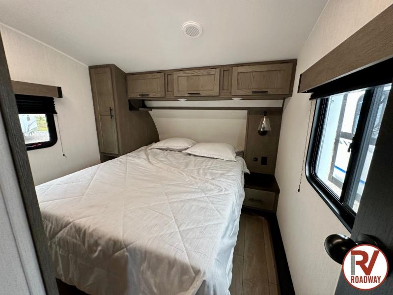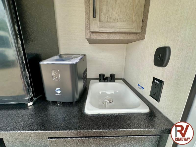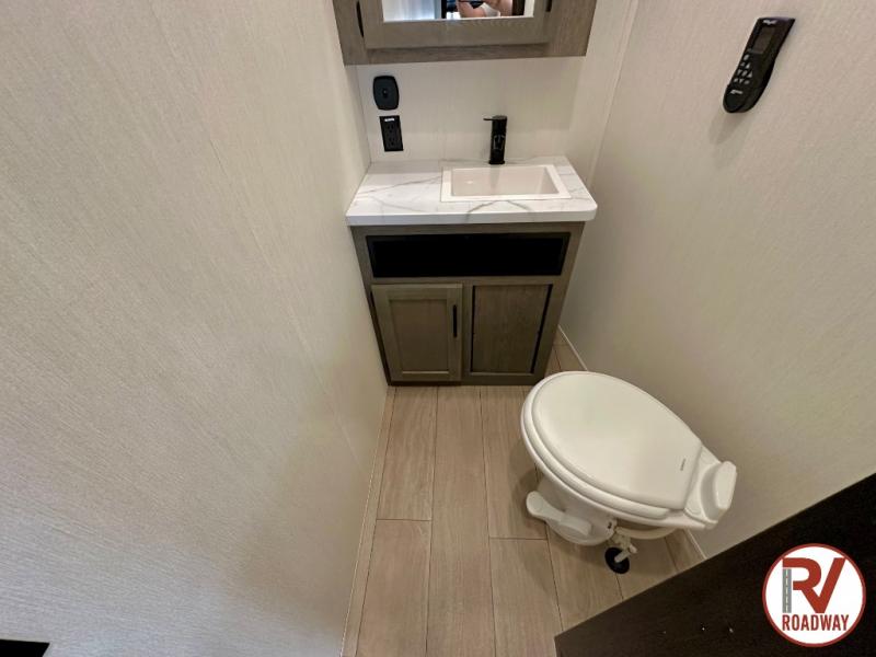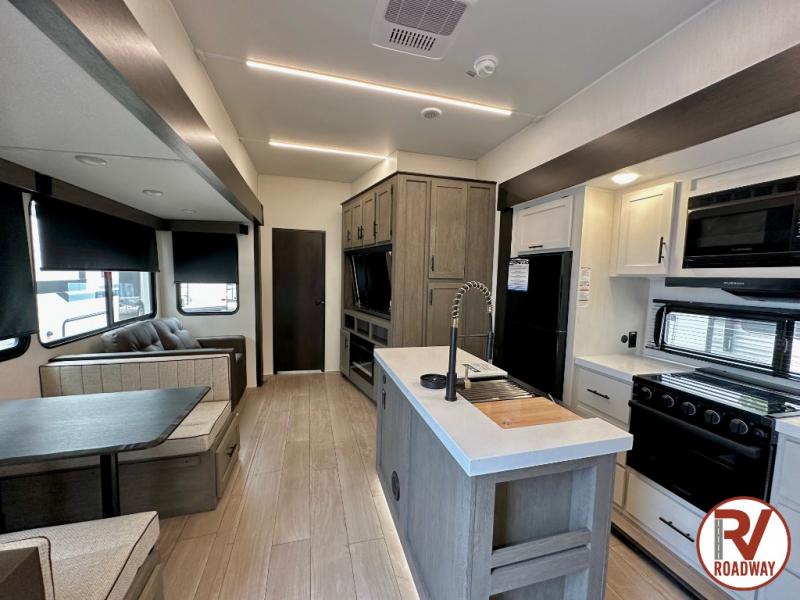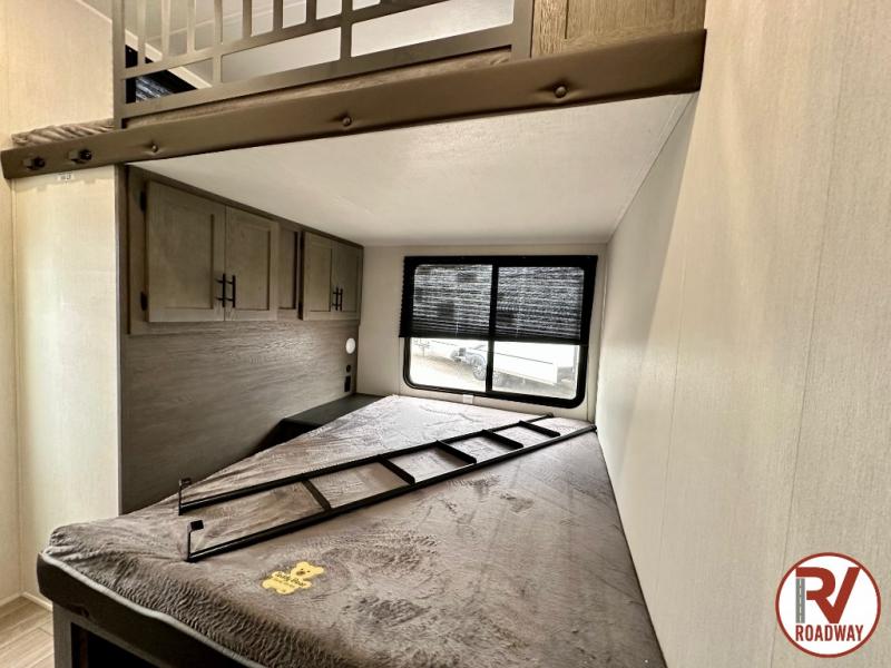 There's not much about this fifth wheel that you won't love! Your guests can claim the rear bunkhouse suite with a 54" x 74" bunk/bed, a 60" x 80" loft bunk, and a half bath for added convenience. You'll have the front private bedroom all to yourselves, and the spacious full bath is close by for easy nighttime use. Everyone can meet in the combined kitchen and living area that is made open thanks to the dual opposing slides. There is also a kitchen island with a trash can, a pull-out countertop extension, a booth dinette, and a tri-fold sofa across from the fireplace; how cozy!