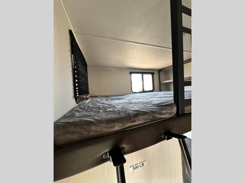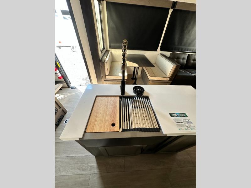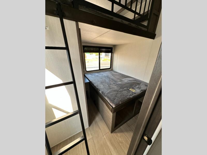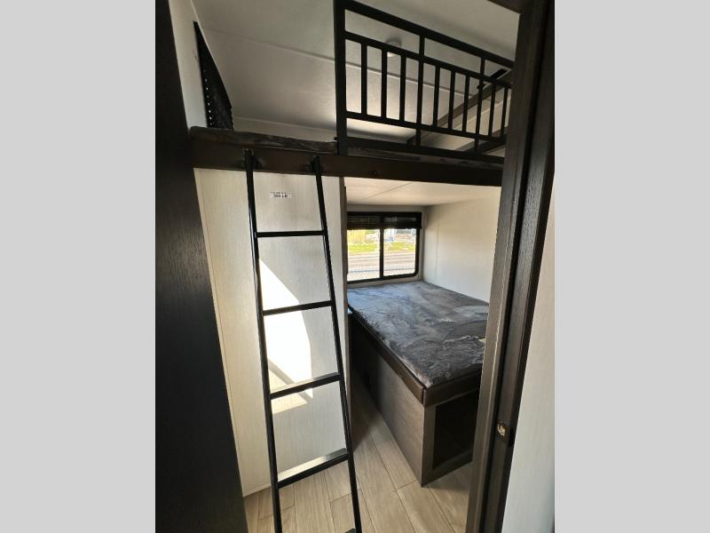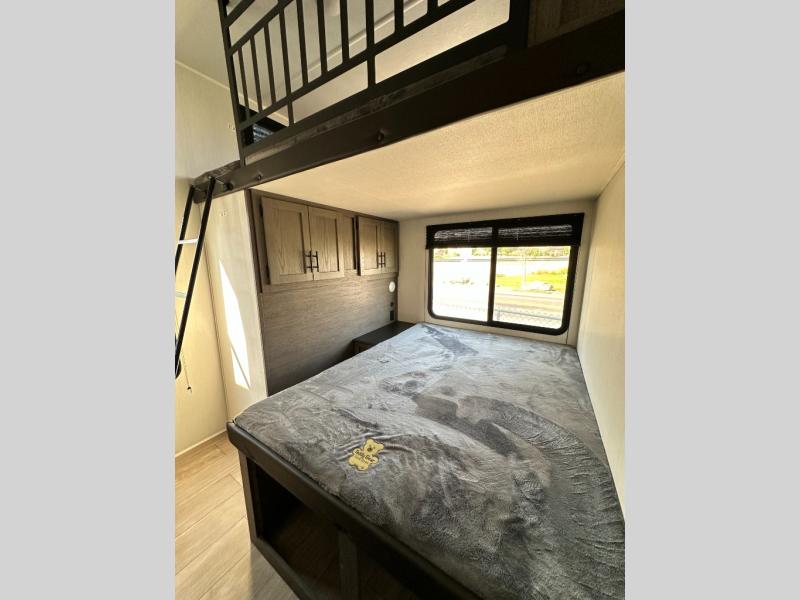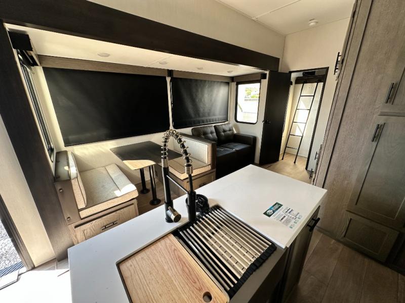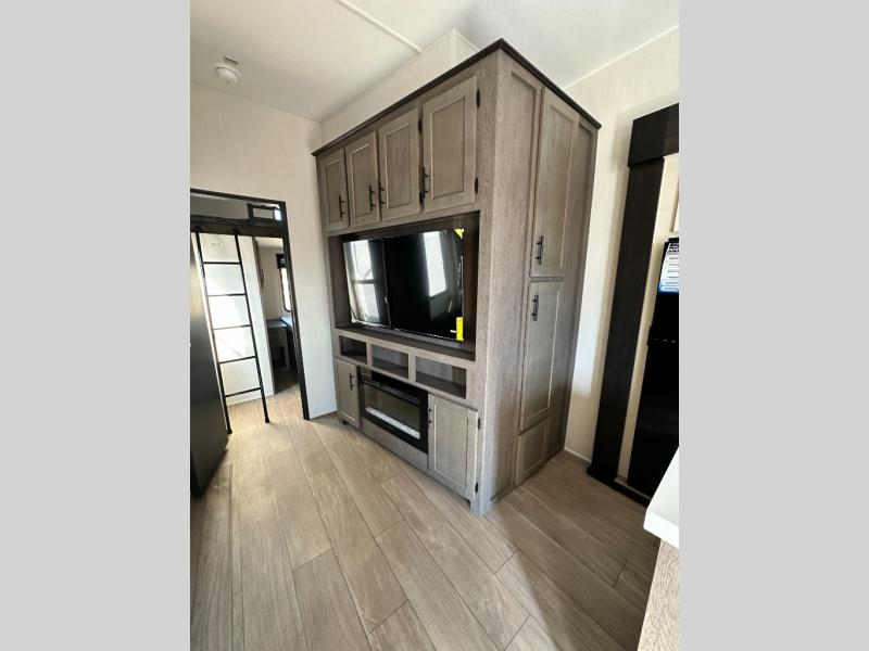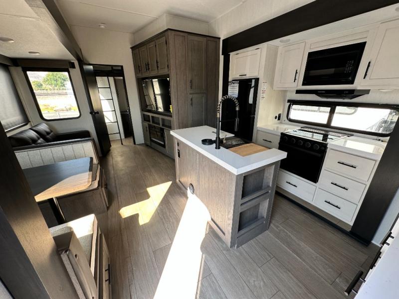 There's not much about this fifth wheel that you won't love! Your guests can claim the rear bunkhouse suite with a 54" x 74" bunk/bed, a 60" x 80" loft bunk, and a half bath for added convenience. You'll have the front private bedroom all to yourselves, and the spacious full bath is close by for easy nighttime use. Everyone can meet in the combined kitchen and living area that is made open thanks to the dual opposing slides. There is also a kitchen island with a trash can, a pull-out countertop extension, a booth dinette, and a tri-fold sofa across from the fireplace; how cozy!