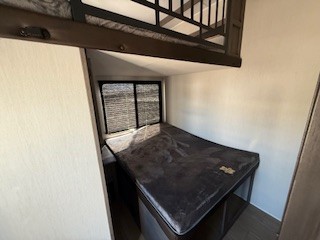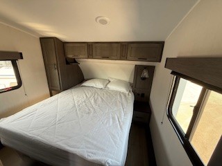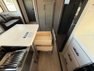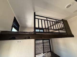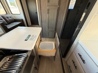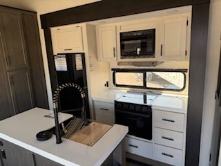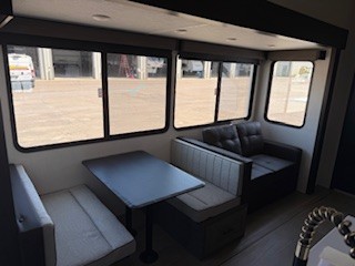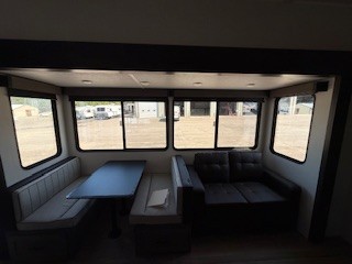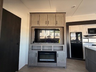 There's not much about this fifth wheel that you won't love! Your guests can claim the rear bunkhouse suite with a 54" x 74" bunk/bed, a 60" x 80" loft bunk, and a half bath for added convenience. You'll have the front private bedroom all to yourselves, and the spacious full bath is close by for easy nighttime use. Everyone can meet in the combined kitchen and living area that is made open thanks to the dual opposing slides. There is also a kitchen island with a trash can, a pull-out countertop extension, a booth dinette, and a tri-fold sofa across from the fireplace; how cozy!