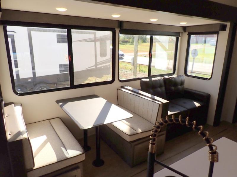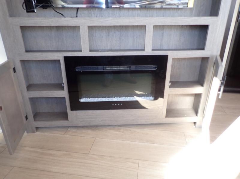 There's not much about this fifth wheel that you won't love! Your guests can claim the rear bunkhouse suite with a 54" x 74" bunk/bed, a 60" x 80" loft bunk, and a half bath for added convenience. You'll have the front private bedroom all to yourselves, and the spacious full bath is close by for easy nighttime use. Everyone can meet in the combined kitchen and living area that is made open thanks to the dual opposing slides. There is also a kitchen island with a trash can, a hutch, a booth dinette, and a tri-fold sofa across from the fireplace; how cozy!