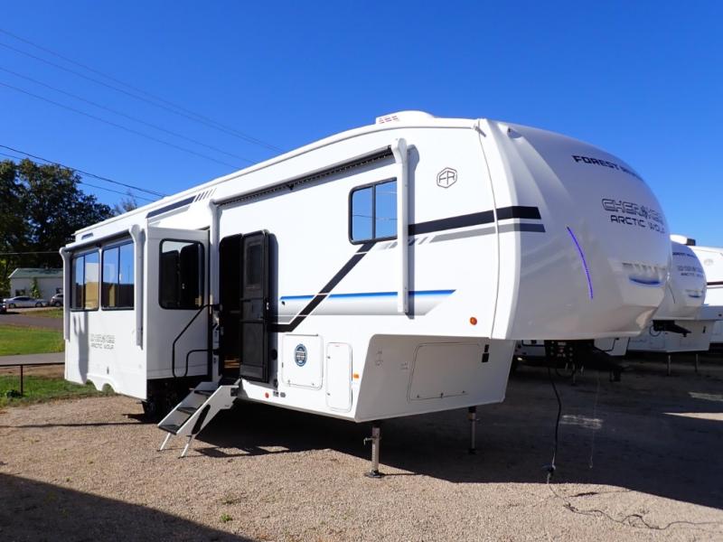 You'll have the very best time tackling outdoor adventures with the Forest River Cherokee Arctic Wolf fifth wheel! Each model has been constructed with a “ToughBend” rigid skirt metal design, Leash Latch pet safety technology, an outside shower with hot/cold water, and a 1x engineered wood “SuperTruss” roof structure with 3/8" decking for added durability. There is also an automatic leveling and stabilization system, slam latch storage doors with "Safety Stay" magnets, plus 12V heat pads on all holding tanks with help withstand colder temperatures. Inside, you'll love the solid surface kitchen countertops with underlighting, along with a carpetless floor design, and fully adjustable, slow rise, blackout roller shades. The on-demand tankless hot water heater will provide endless hot water and the central A/C unit with Quick Cool will ensure your comfort during those hot summer camping months. There are many more stand-out features found on these fifth wheels; check them out!