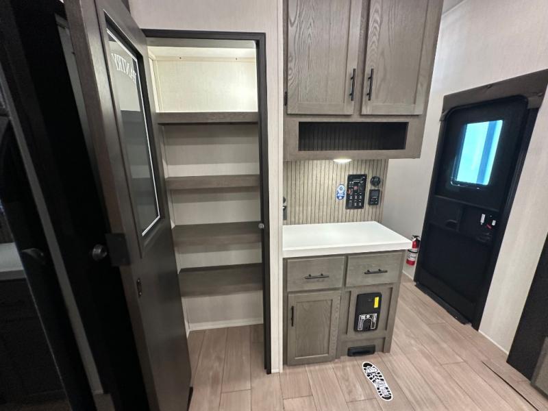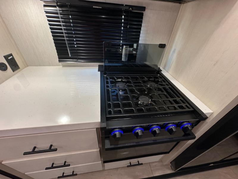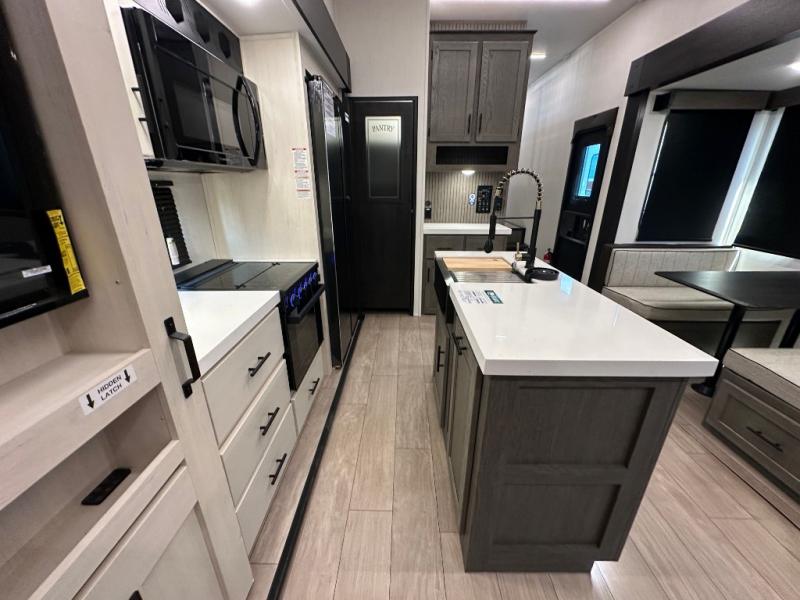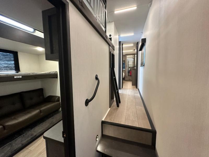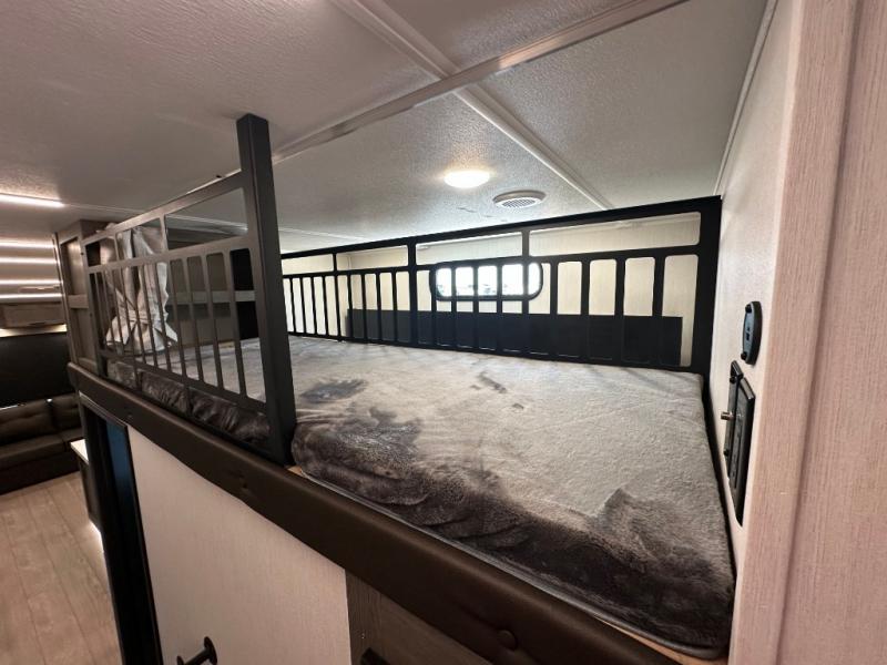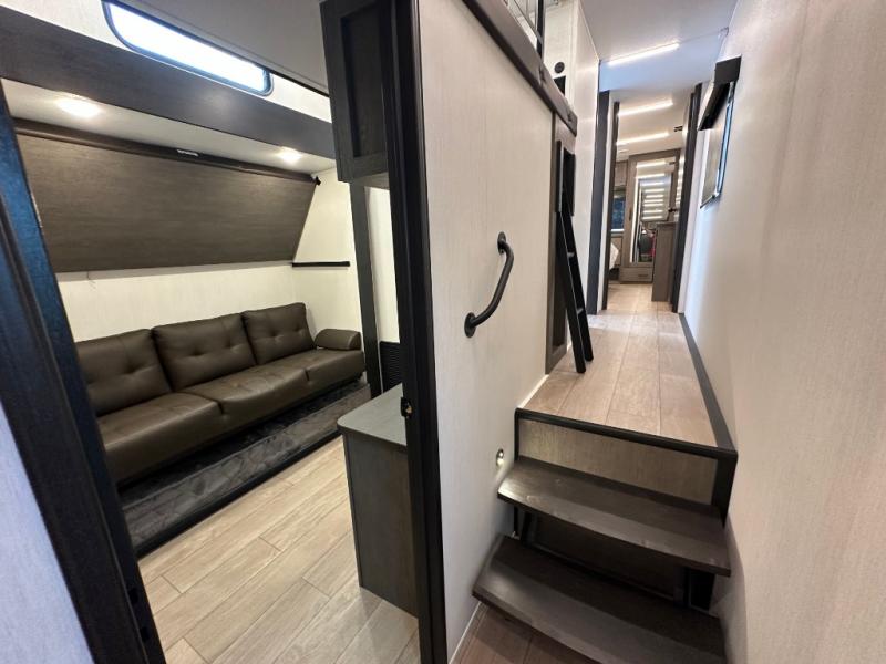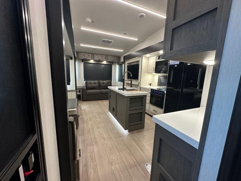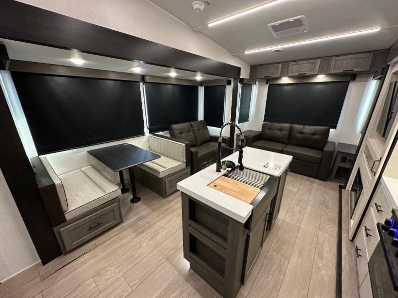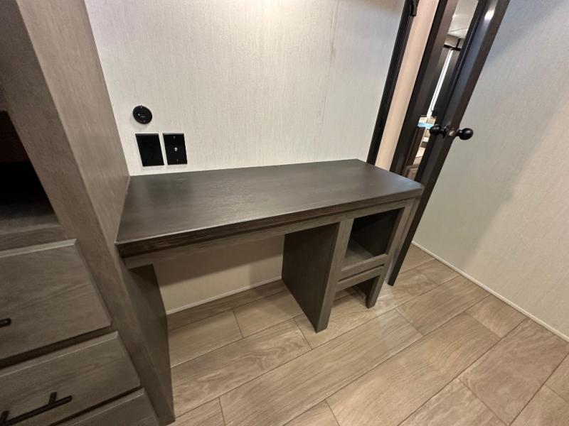 You have excellent sleeping accommodations on this Cherokee Arctic Wolf fifth wheel! There is a private bedroom with a king-size bed at the front for you, and the second bedroom contains two 28" x 72" bunks and a jack knife sofa with trundle for any kids or friends you have traveling with you. A desk provides space to work or study. And it doesn't stop there. There is also a tri-fold sofa in the living area that you can use as a sleeping space. The kitchen is ready for you to make meals on the three-burner range, and you have plenty of work space with a pull-out countertop extension. You can enjoy your meals at the dinette, and after dinner relax on the theater seats across from the fireplace.