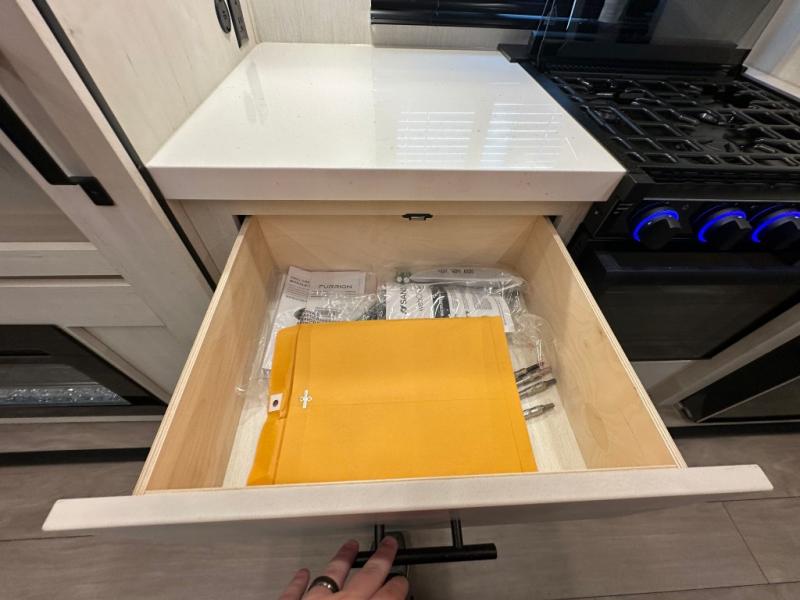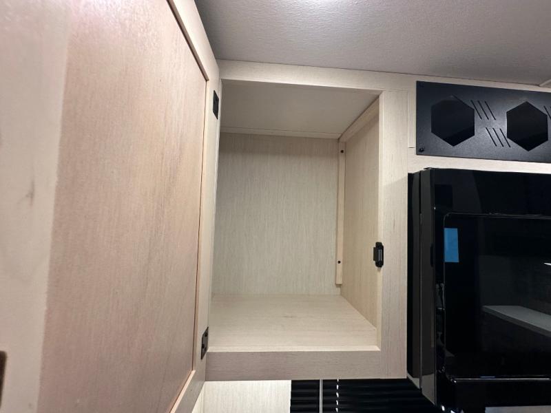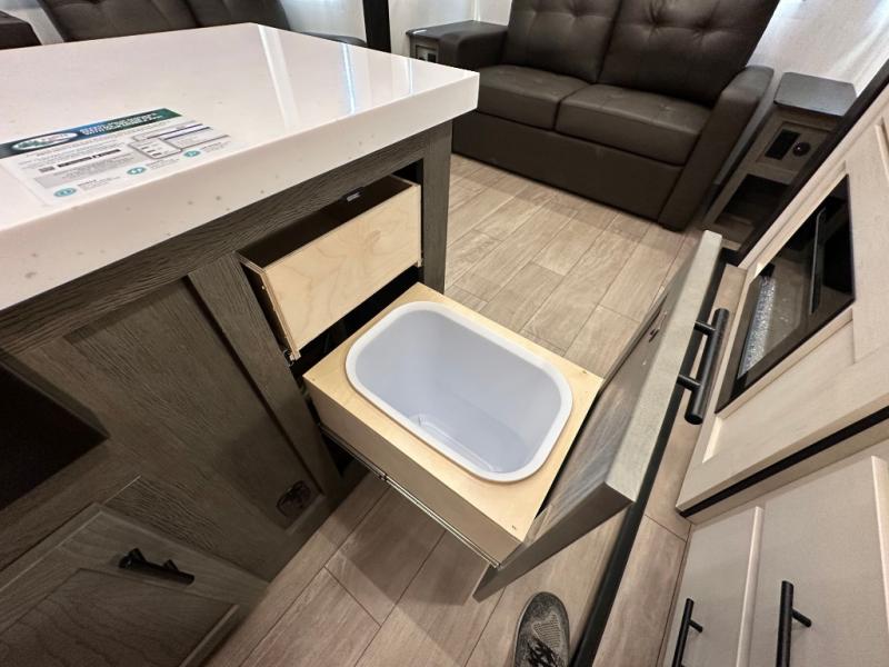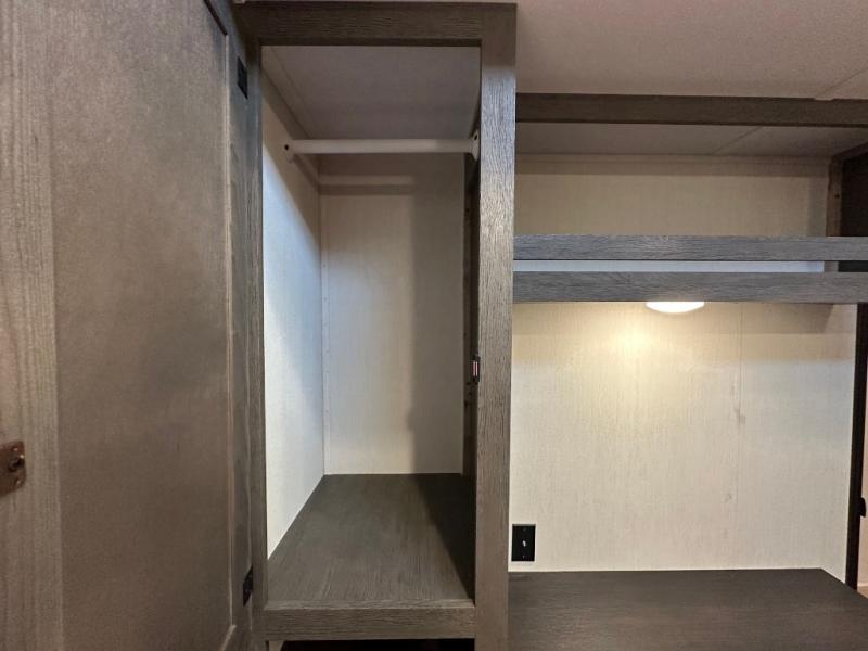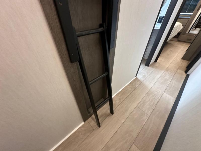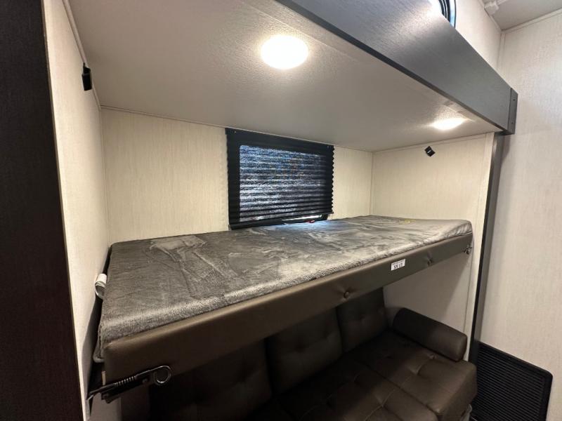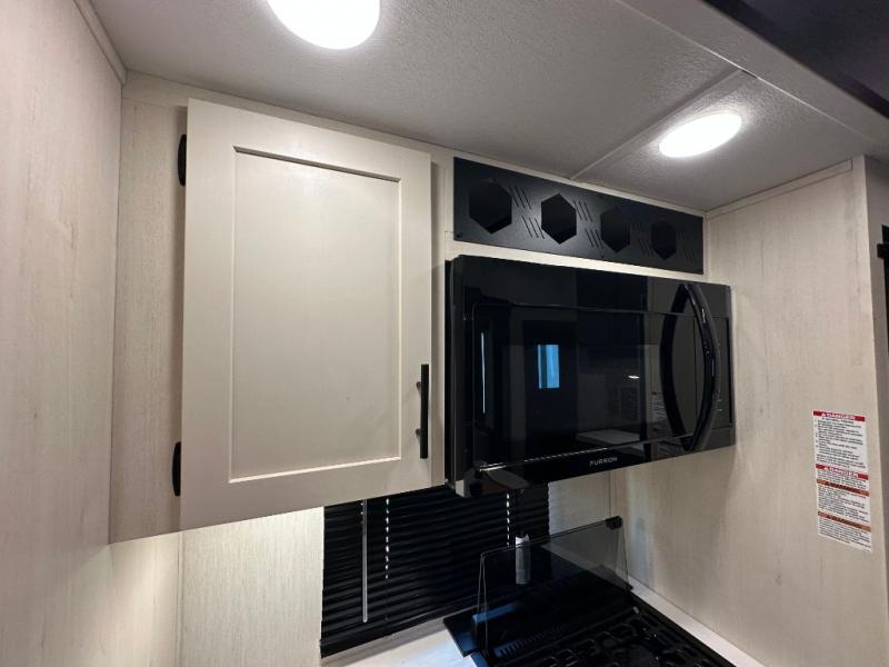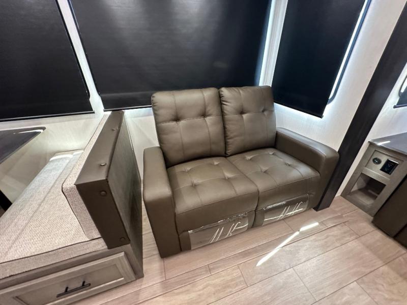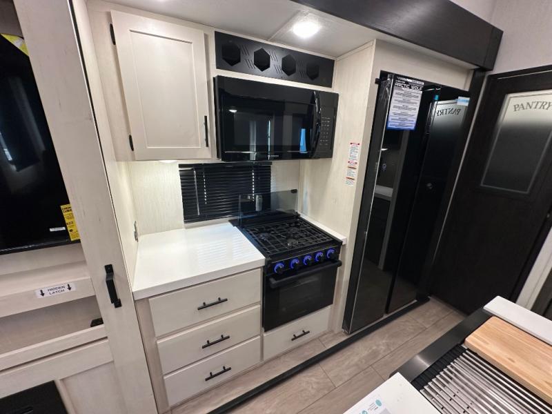 You have excellent sleeping accommodations on this Cherokee Arctic Wolf fifth wheel! There is a private bedroom with a king-size bed at the front for you, and the second bedroom contains two 28" x 72" bunks and a jack knife sofa with trundle for any kids or friends you have traveling with you. A desk provides space to work or study. And it doesn't stop there. There is also a tri-fold sofa in the living area that you can use as a sleeping space. The kitchen is ready for you to make meals on the three-burner range, and you have plenty of work space with a pull-out countertop extension. You can enjoy your meals at the dinette, and after dinner relax on the theater seats across from the fireplace.