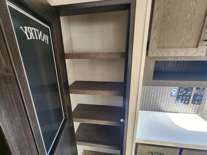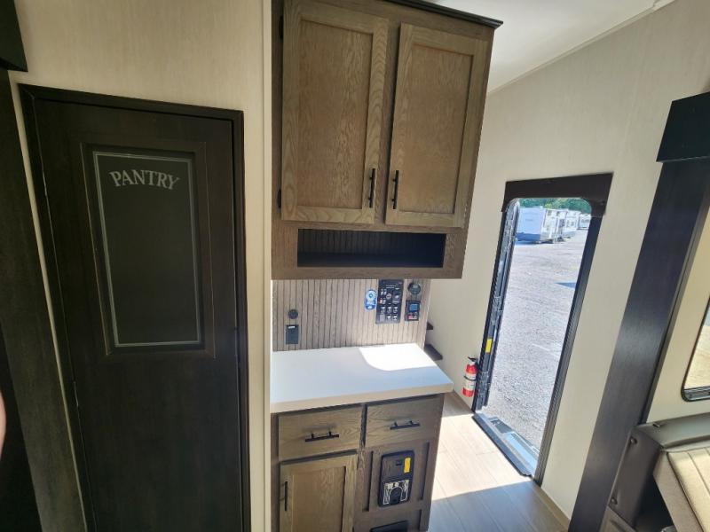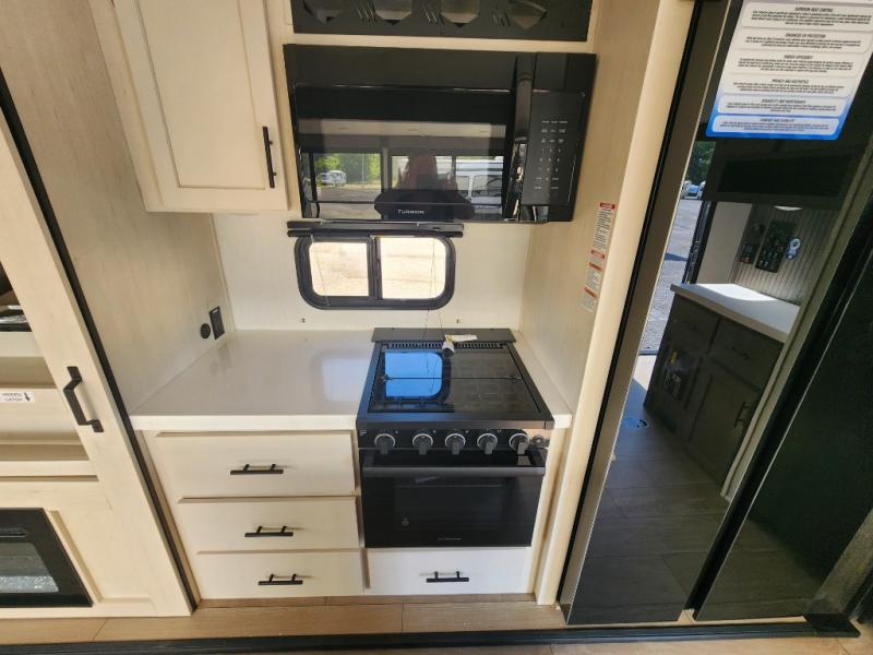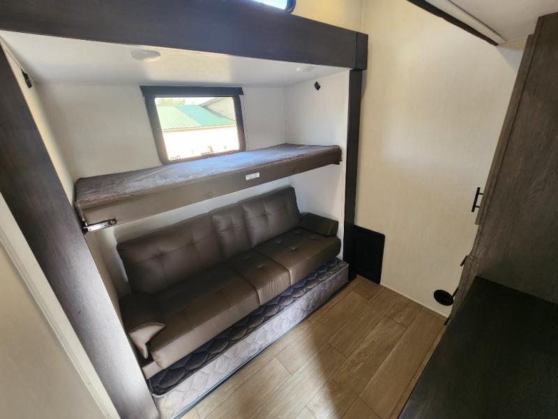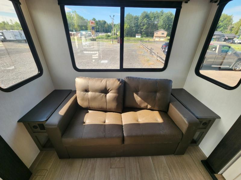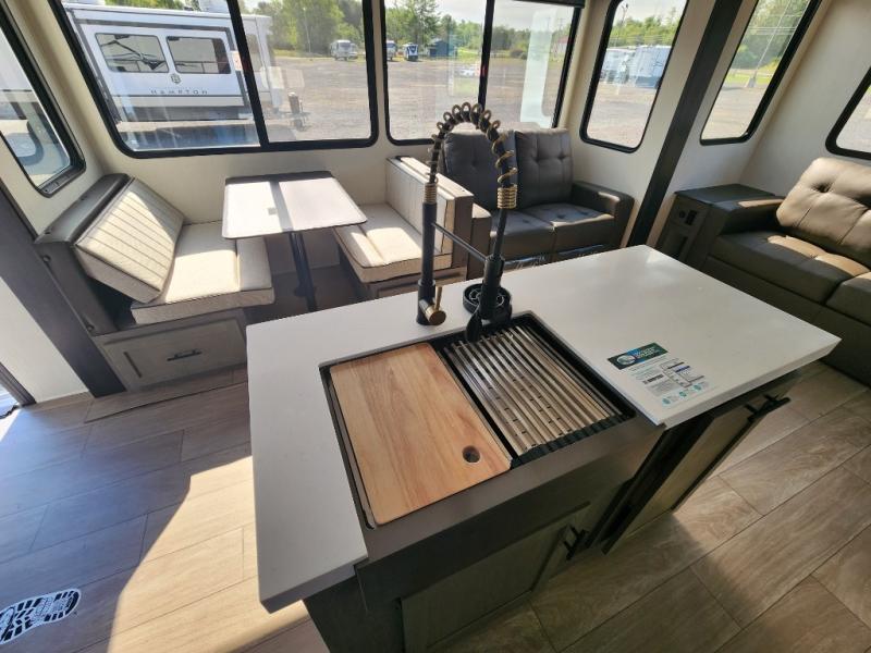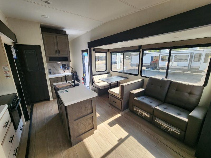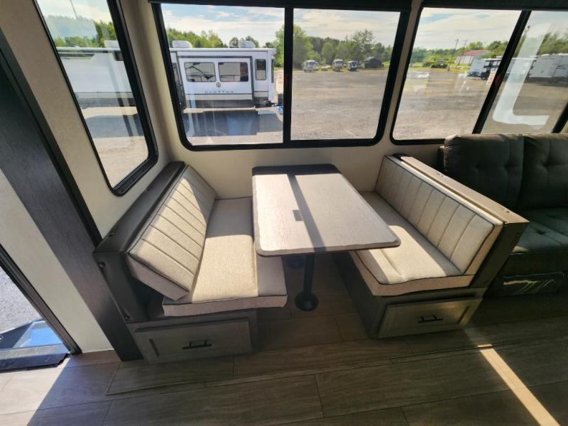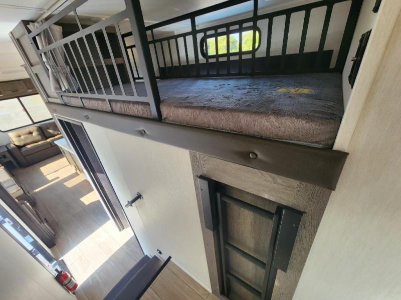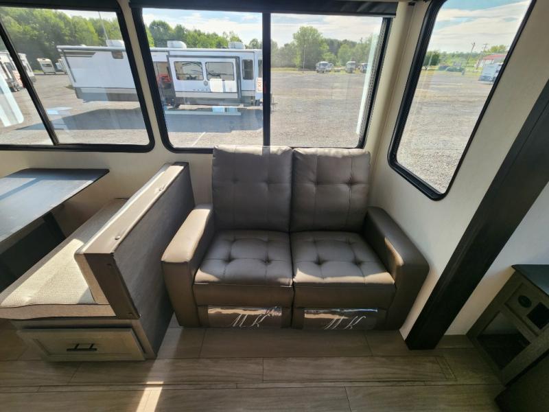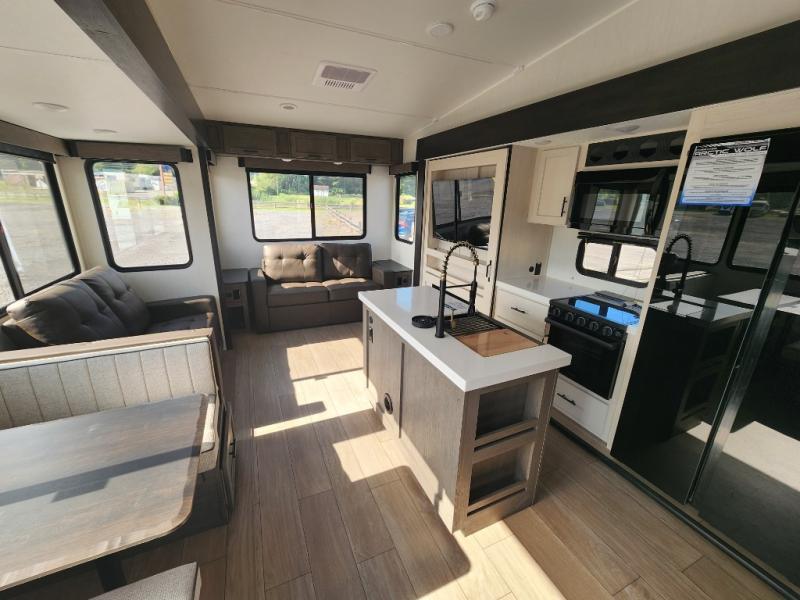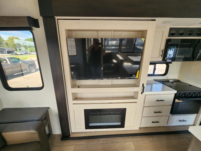 You have excellent sleeping accommodations on this Cherokee Arctic Wolf fifth wheel! There is a private bedroom with a king-size bed at the front for you, and the second bedroom contains two 28" x 72" bunks and a jack knife sofa with trundle for any kids or friends you have traveling with you. A desk provides space to work or study. And it doesn't stop there. There is also a tri-fold sofa in the living area that you can use as a sleeping space. The kitchen is ready for you to make meals on the three-burner range, and you have plenty of work space with a spacious kitchen island. You can enjoy your meals at the dinette, and after dinner relax on the jack knife sofa across from the fireplace.