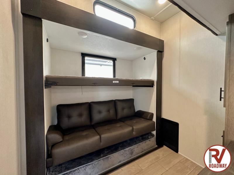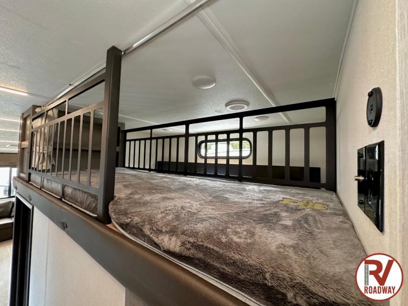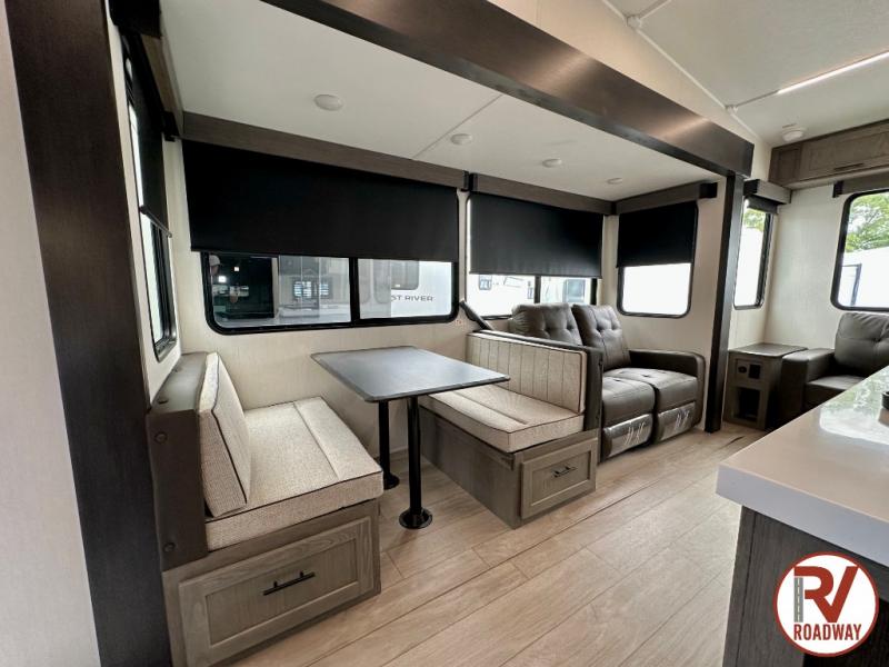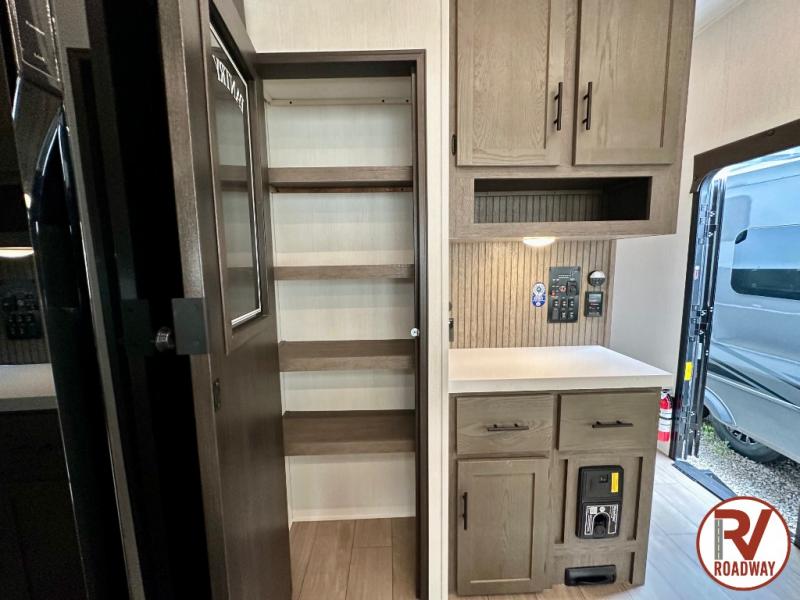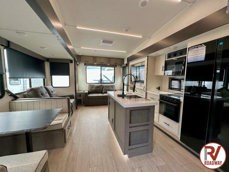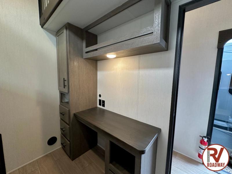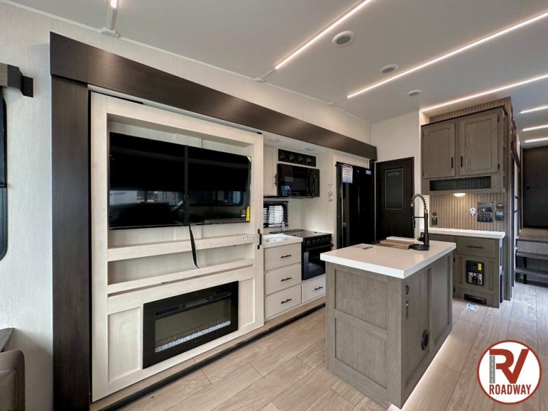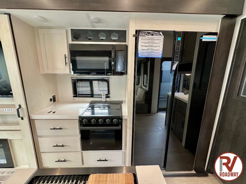 You have excellent sleeping accommodations on this Cherokee Arctic Wolf fifth wheel! There is a private bedroom with a king-size bed at the front for you, and the second bedroom contains two 28" x 72" bunks and a jack knife sofa with trundle for any kids or friends you have traveling with you. A desk provides space to work or study. And it doesn't stop there. There is also a tri-fold sofa in the living area that you can use as a sleeping space. The kitchen is ready for you to make meals on the three-burner range, and you have plenty of work space with a pull-out countertop extension. You can enjoy your meals at the dinette, and after dinner relax on the theater seats across from the fireplace.