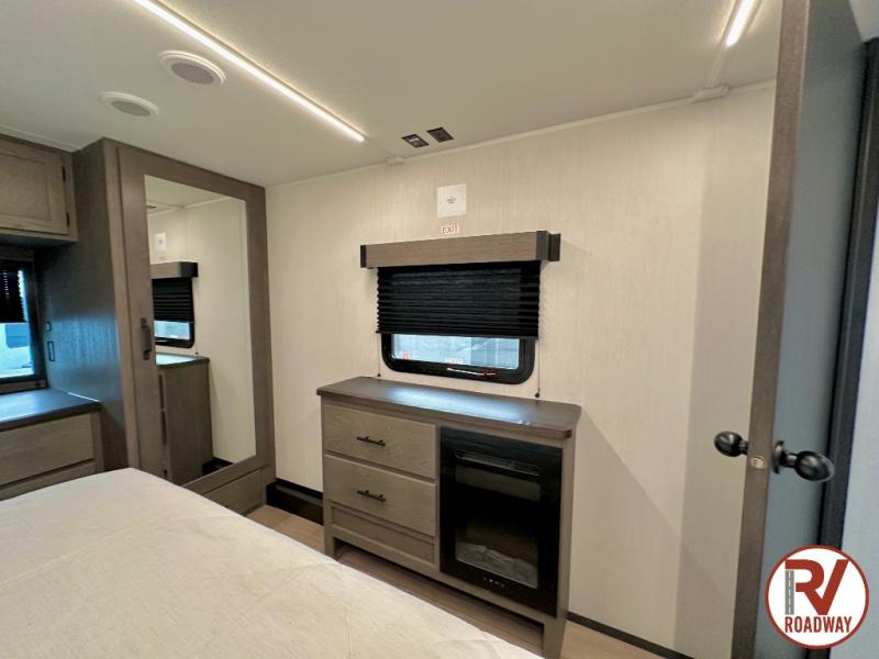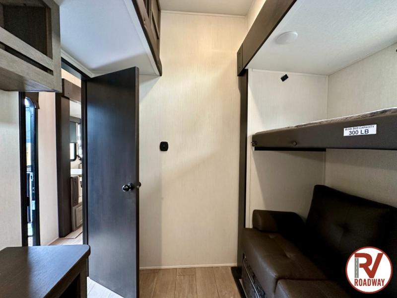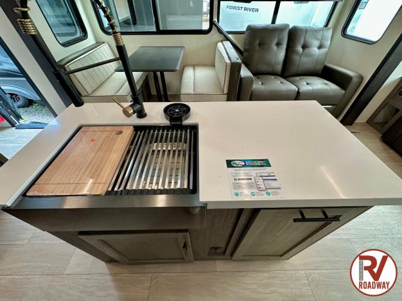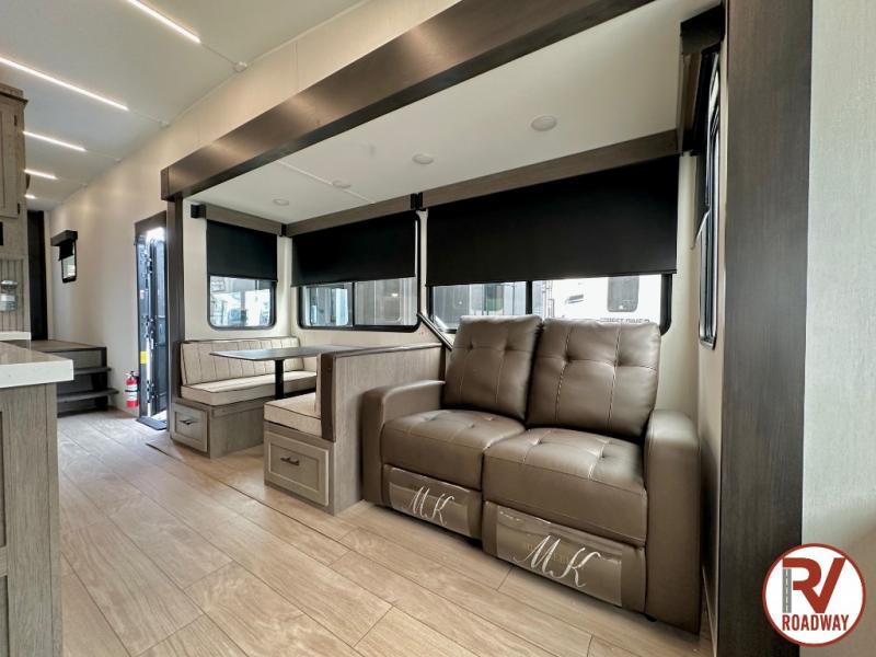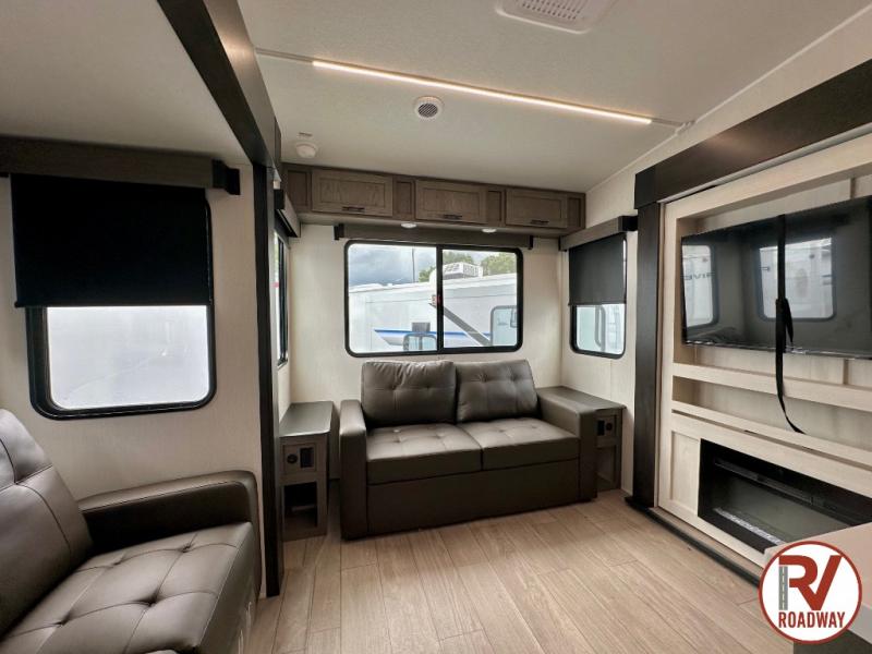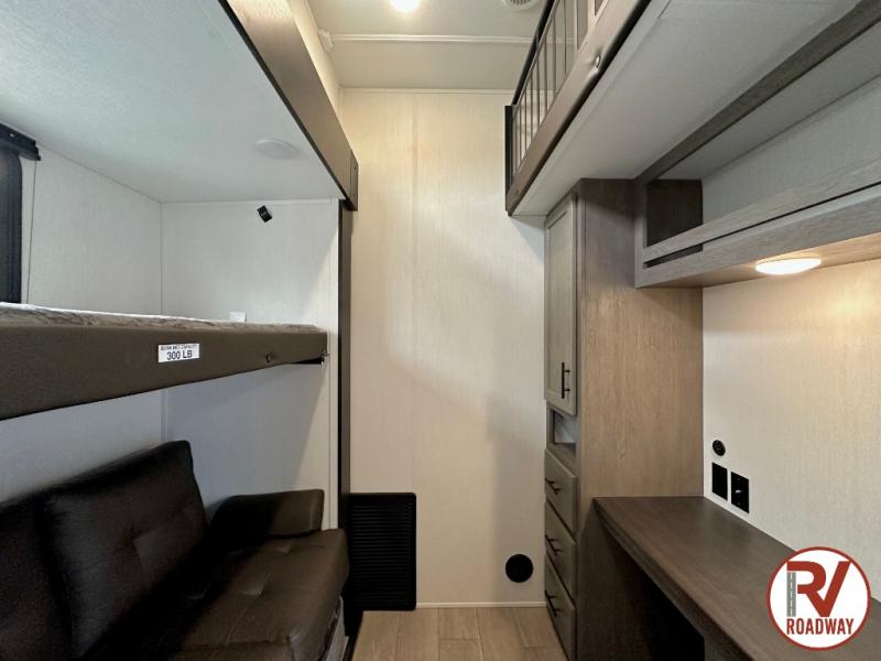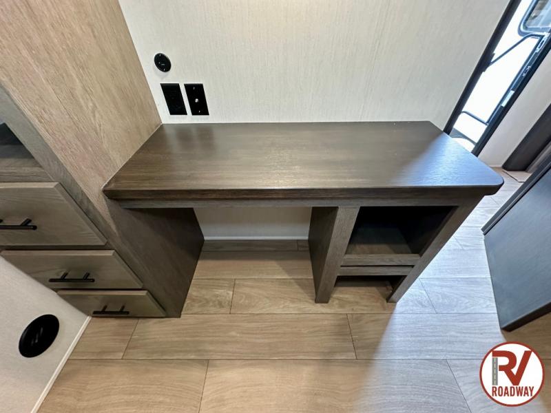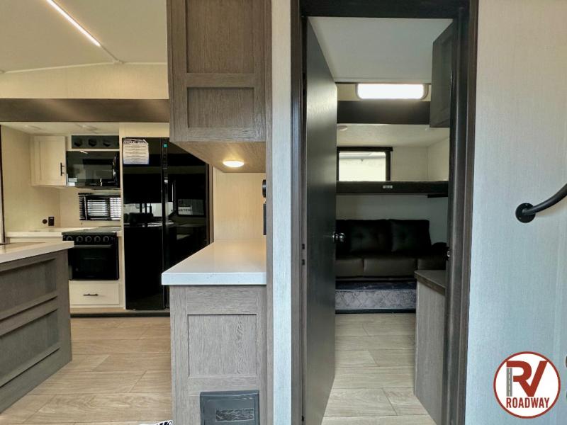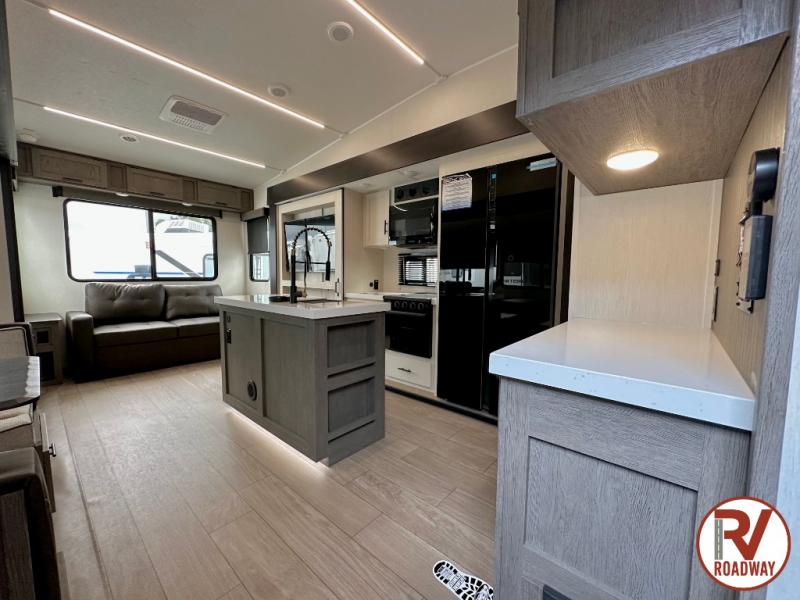 You have excellent sleeping accommodations on this Cherokee Arctic Wolf fifth wheel! There is a private bedroom with a king-size bed at the front for you, and the second bedroom contains two 28" x 72" bunks and a jack knife sofa with trundle for any kids or friends you have traveling with you. A desk provides space to work or study. And it doesn't stop there. There is also a tri-fold sofa in the living area that you can use as a sleeping space. The kitchen is ready for you to make meals on the three-burner range, and you have plenty of work space with a pull-out countertop extension. You can enjoy your meals at the dinette, and after dinner relax on the theater seats across from the fireplace.