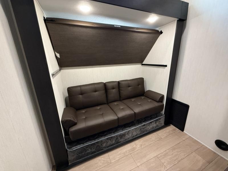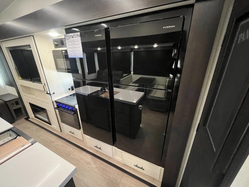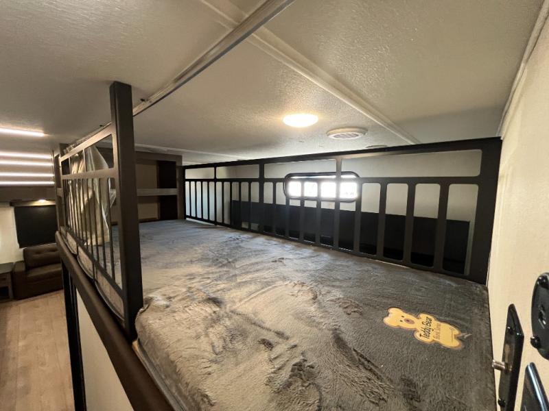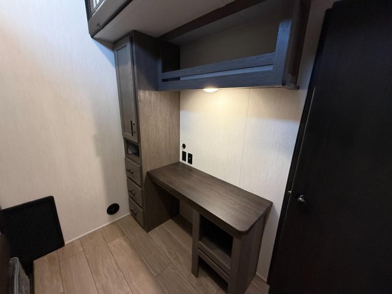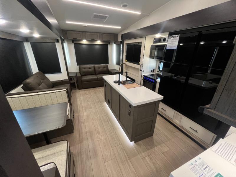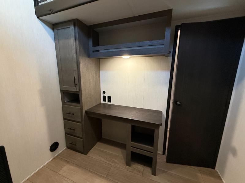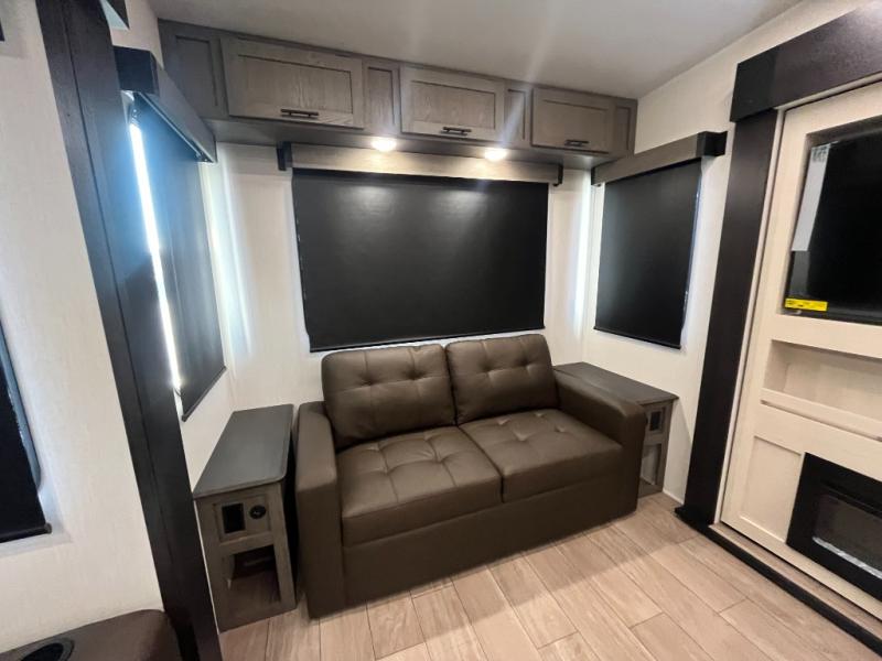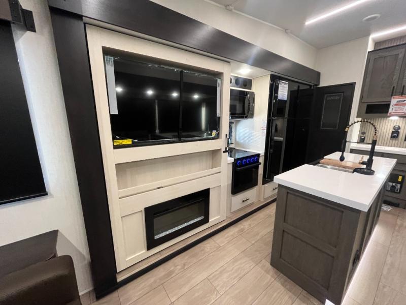 You have excellent sleeping accommodations on this Cherokee Arctic Wolf fifth wheel! There is a private bedroom with a king-size bed at the front for you, and the second bedroom contains two 28" x 72" bunks and a jack knife sofa with trundle for any kids or friends you have traveling with you. A desk provides space to work or study. And it doesn't stop there. There is also a tri-fold sofa in the living area that you can use as a sleeping space. The kitchen is ready for you to make meals on the three-burner range, and you have plenty of work space with a spacious kitchen island. You can enjoy your meals at the dinette, and after dinner relax on the jack knife sofa across from the fireplace.