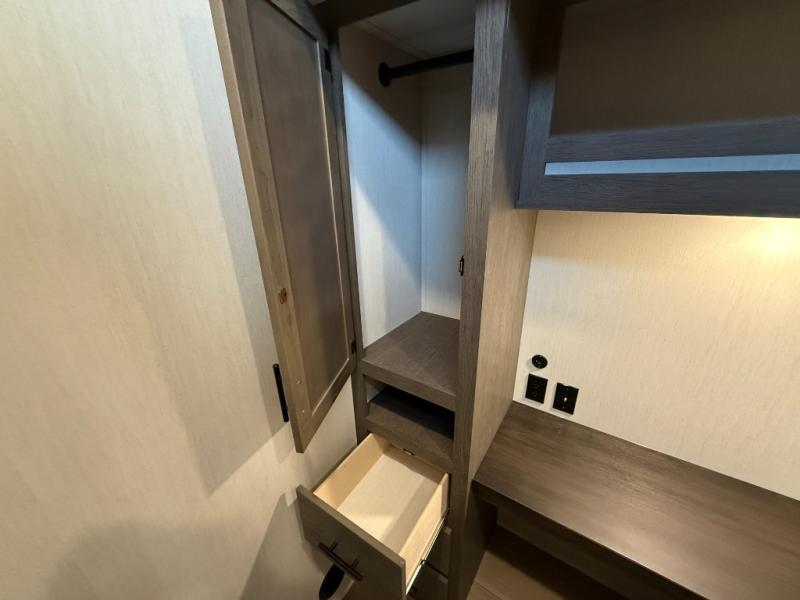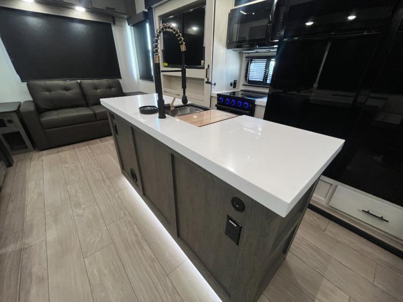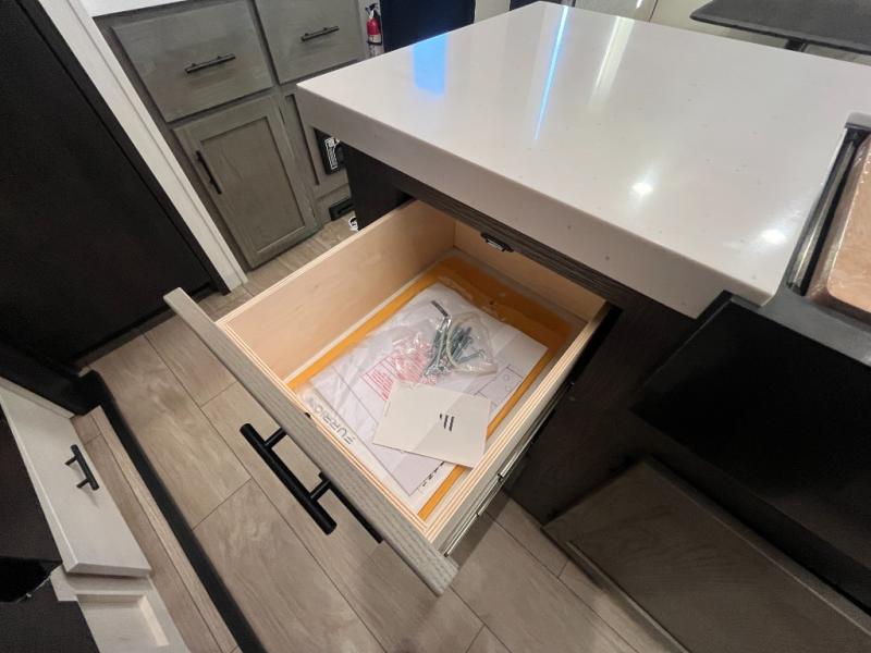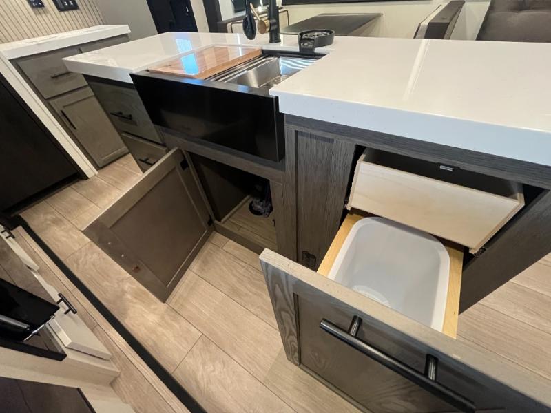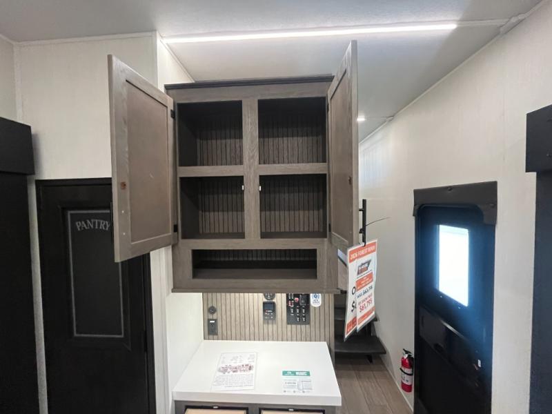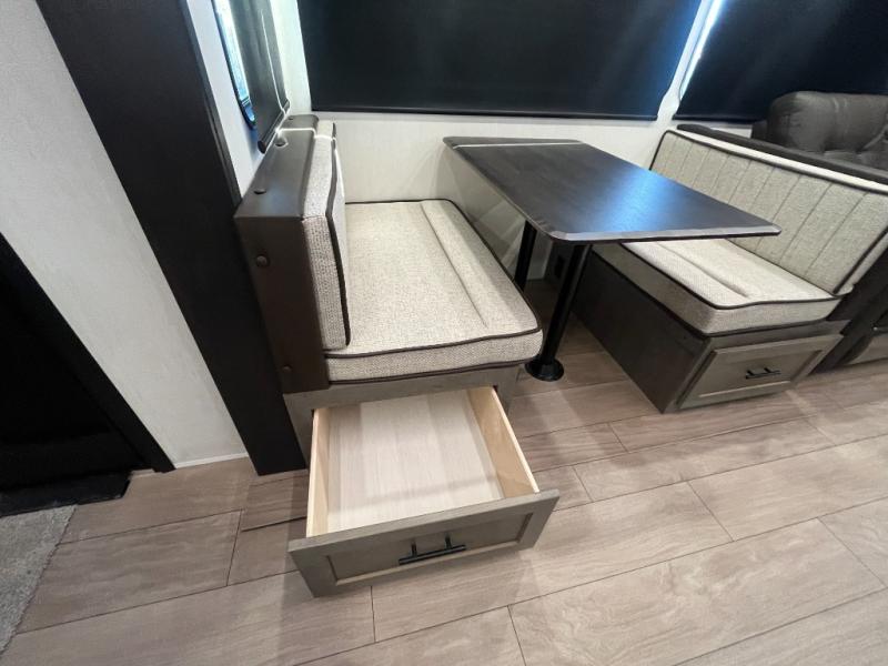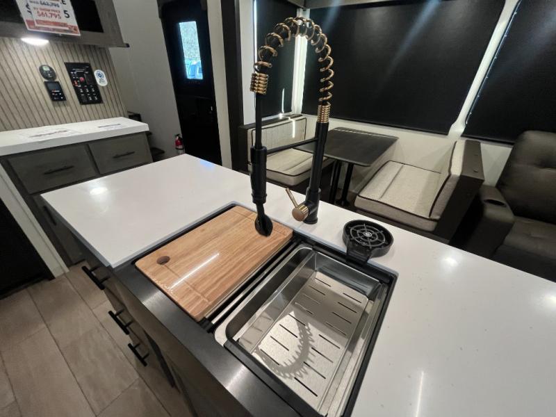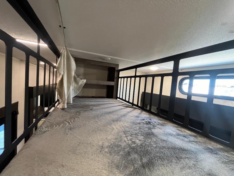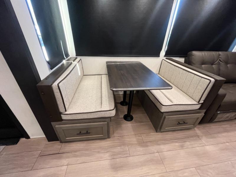 You have excellent sleeping accommodations on this Cherokee Arctic Wolf fifth wheel! There is a private bedroom with a king-size bed at the front for you, and the second bedroom contains two 28" x 72" bunks and a jack knife sofa with trundle for any kids or friends you have traveling with you. A desk provides space to work or study. And it doesn't stop there. There is also a tri-fold sofa in the living area that you can use as a sleeping space. The kitchen is ready for you to make meals on the three-burner range, and you have plenty of work space with a spacious kitchen island. You can enjoy your meals at the dinette, and after dinner relax on the jack knife sofa across from the fireplace.