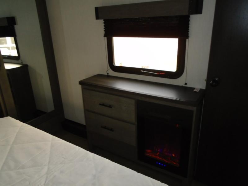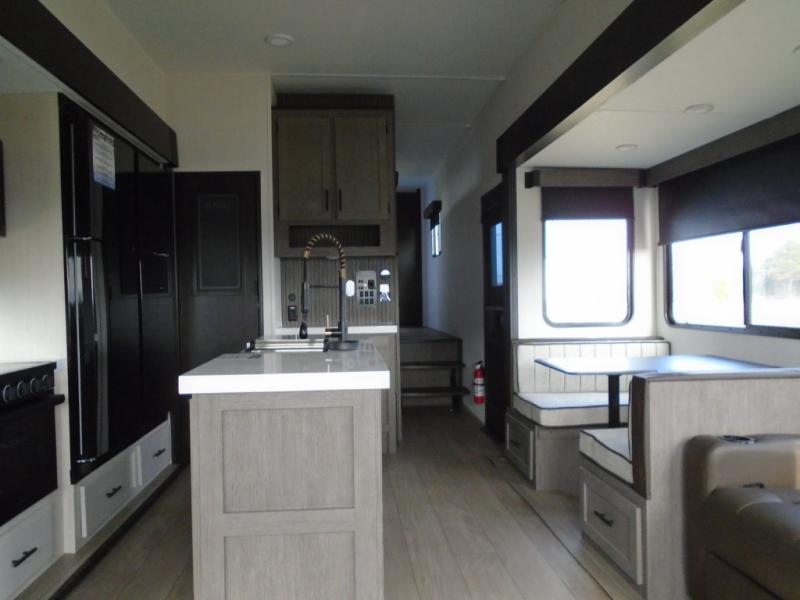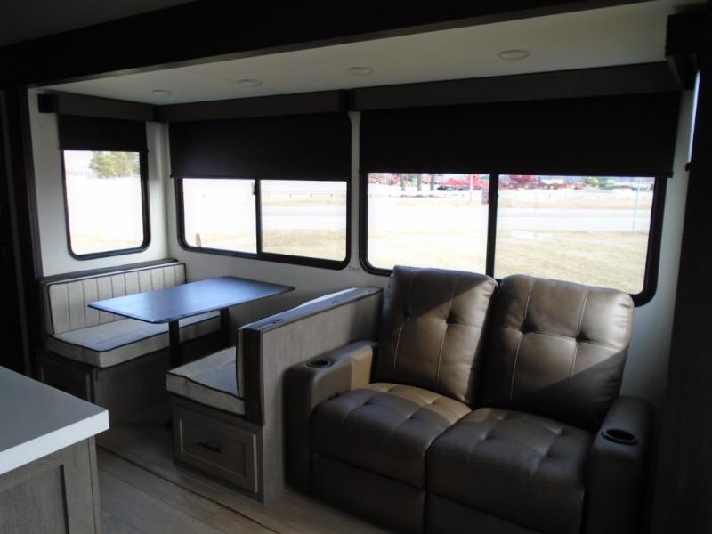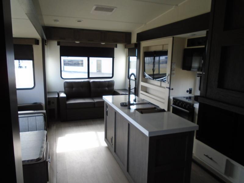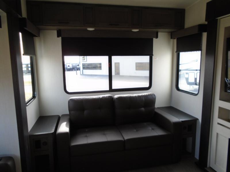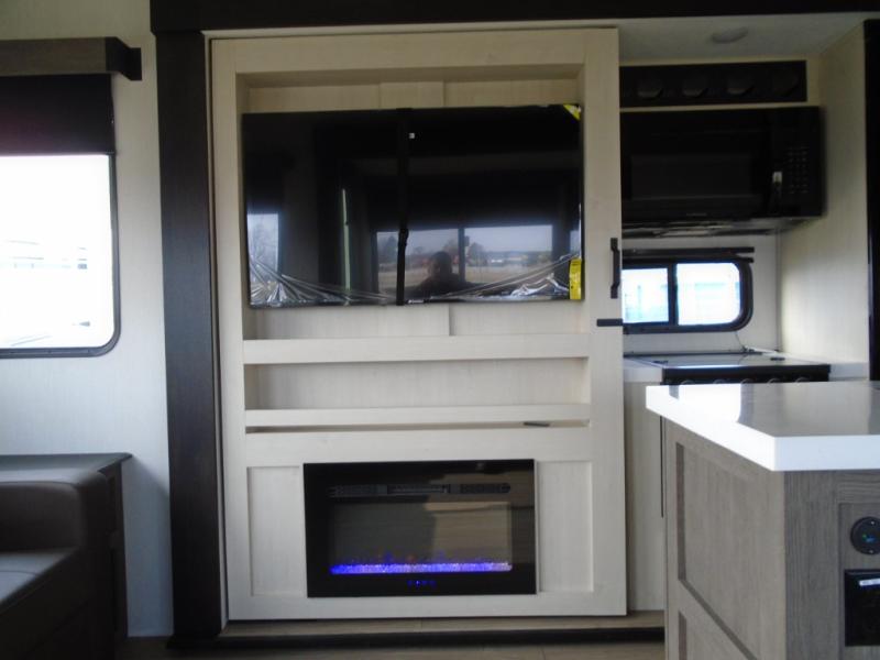 You have excellent sleeping accommodations on this Cherokee Arctic Wolf fifth wheel! There is a private bedroom with a king-size bed at the front for you, and the second bedroom contains two 28" x 72" bunks and a jack knife sofa with trundle for any kids or friends you have traveling with you. A desk provides space to work or study. And it doesn't stop there. There is also a tri-fold sofa in the living area that you can use as a sleeping space. The kitchen is ready for you to make meals on the three-burner range, and you have plenty of work space with a spacious kitchen island. You can enjoy your meals at the dinette, and after dinner relax on the jack knife sofa across from the fireplace.