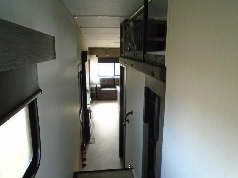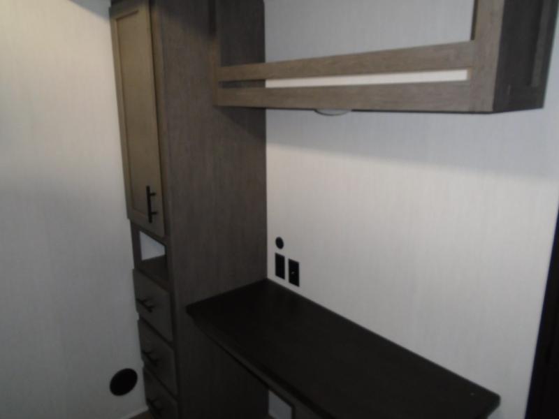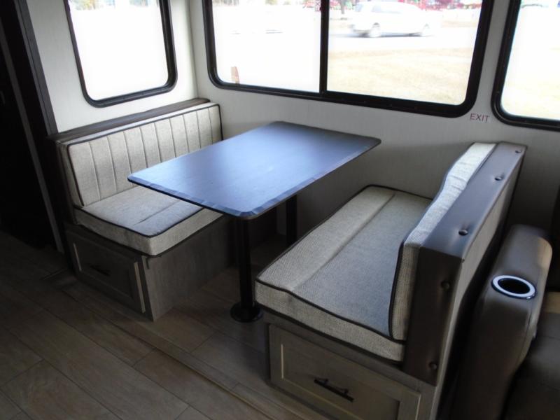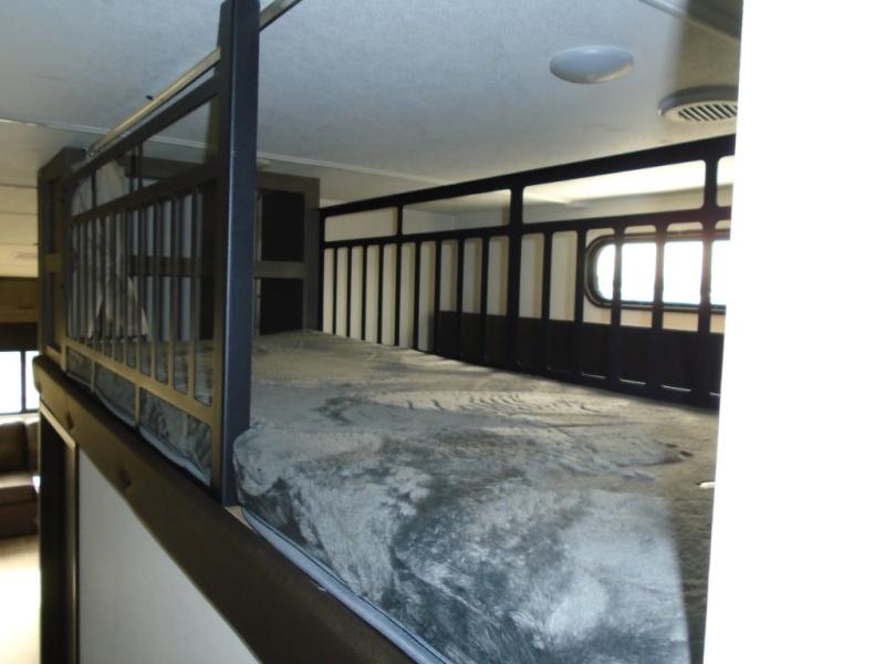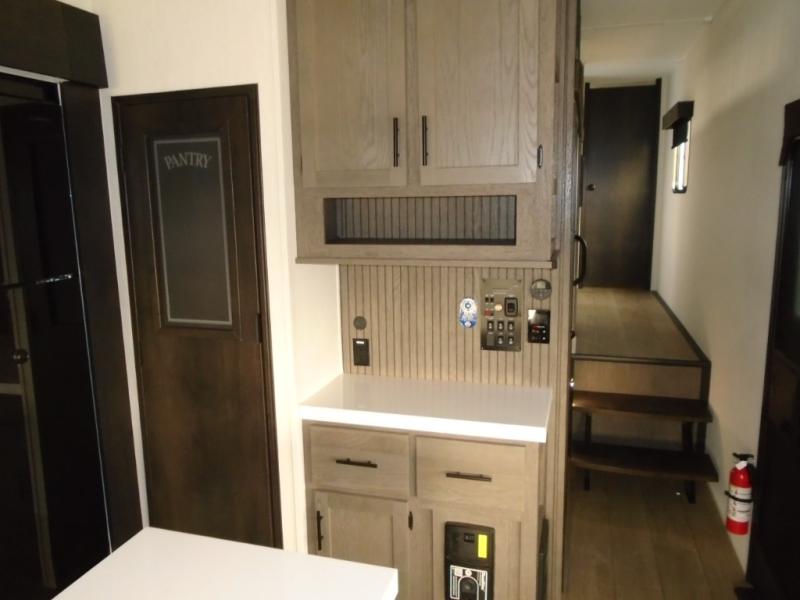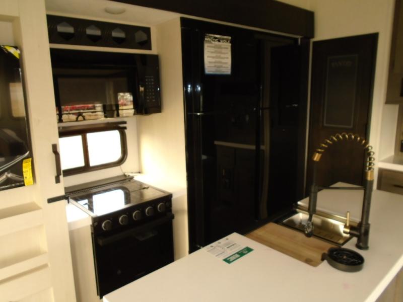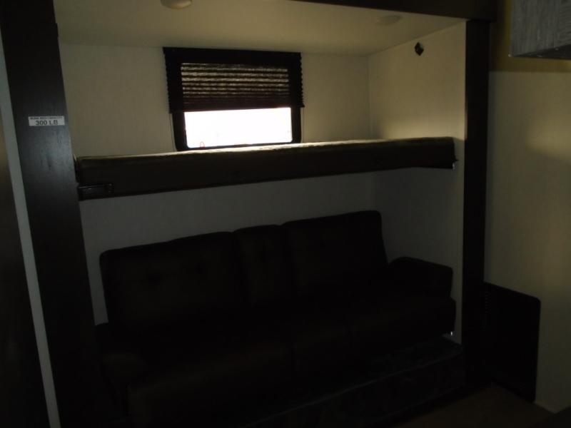 You have excellent sleeping accommodations on this Cherokee Arctic Wolf fifth wheel! There is a private bedroom with a king-size bed at the front for you, and the second bedroom contains two 28" x 72" bunks and a jack knife sofa with trundle for any kids or friends you have traveling with you. A desk provides space to work or study. And it doesn't stop there. There is also a tri-fold sofa in the living area that you can use as a sleeping space. The kitchen is ready for you to make meals on the three-burner range, and you have plenty of work space with a spacious kitchen island. You can enjoy your meals at the dinette, and after dinner relax on the jack knife sofa across from the fireplace.