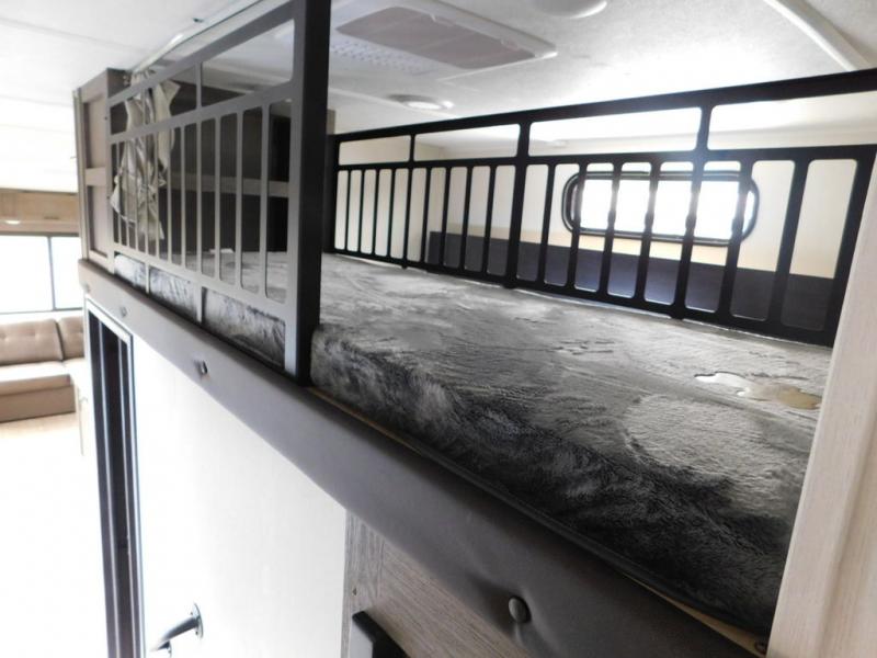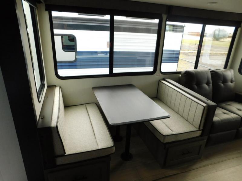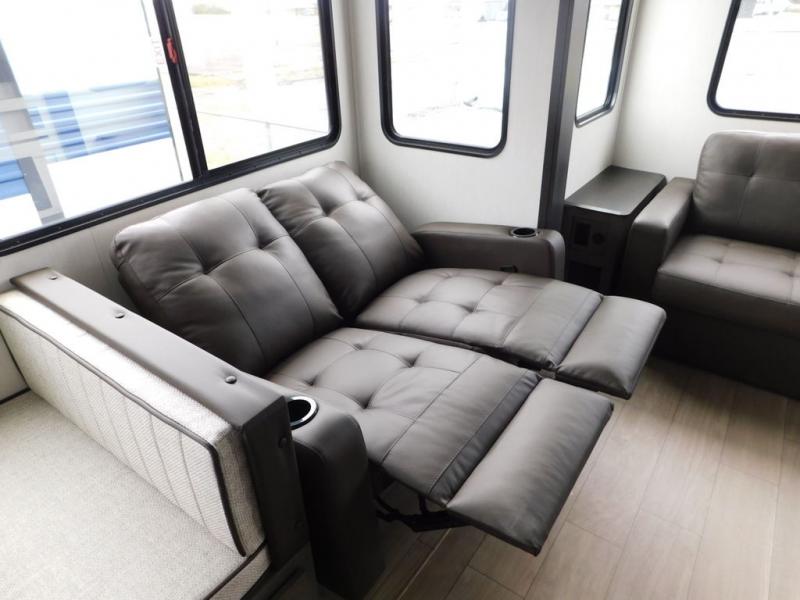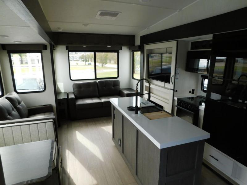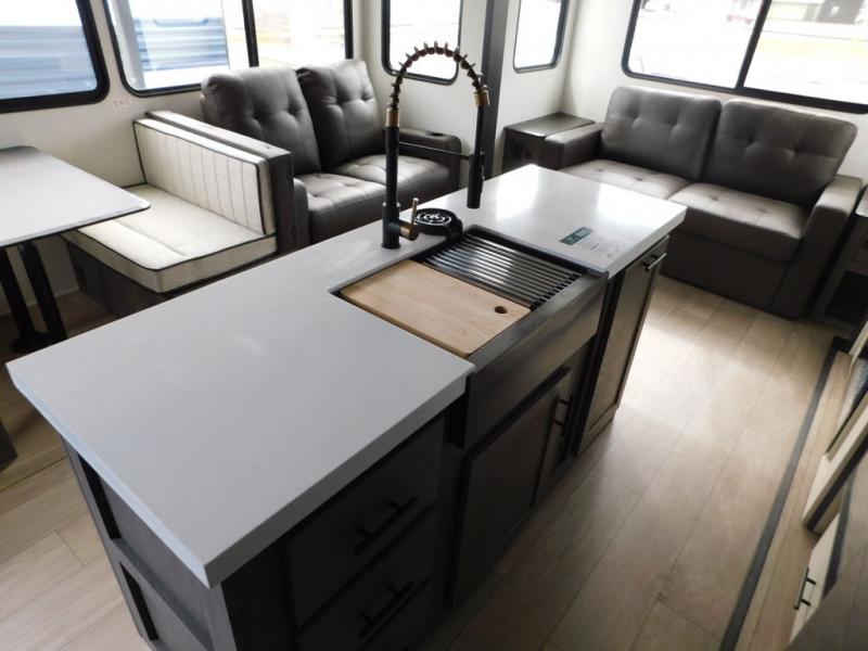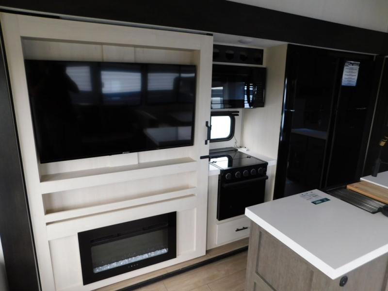 You have excellent sleeping accommodations on this Cherokee Arctic Wolf fifth wheel! There is a private bedroom with a king-size bed at the front for you, and the second bedroom contains two 28" x 72" bunks and a jack knife sofa with trundle for any kids or friends you have traveling with you. A desk provides space to work or study. And it doesn't stop there. There is also a tri-fold sofa in the living area that you can use as a sleeping space. The kitchen is ready for you to make meals on the three-burner range, and you have plenty of work space with a spacious kitchen island. You can enjoy your meals at the dinette, and after dinner relax on the jack knife sofa across from the fireplace.