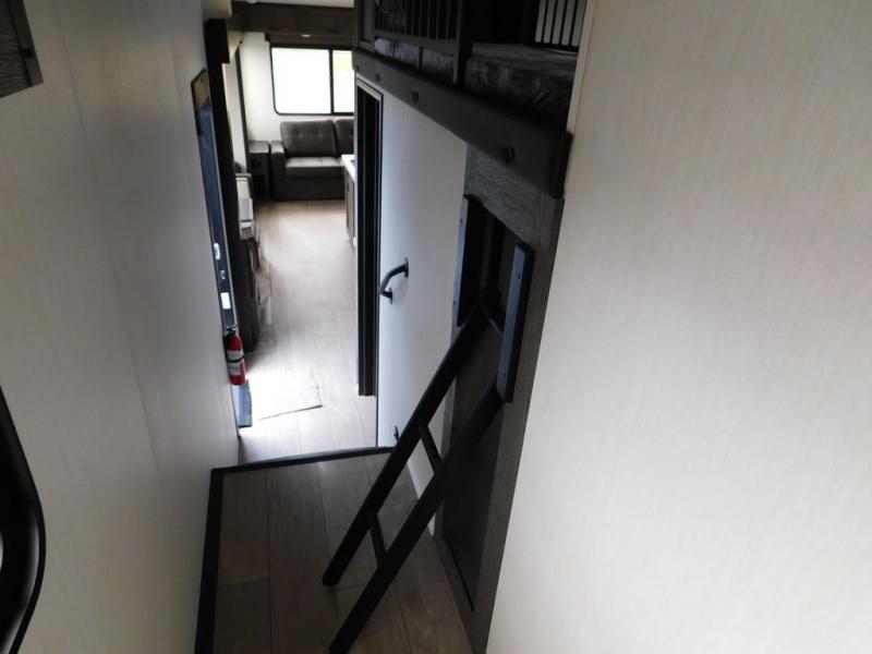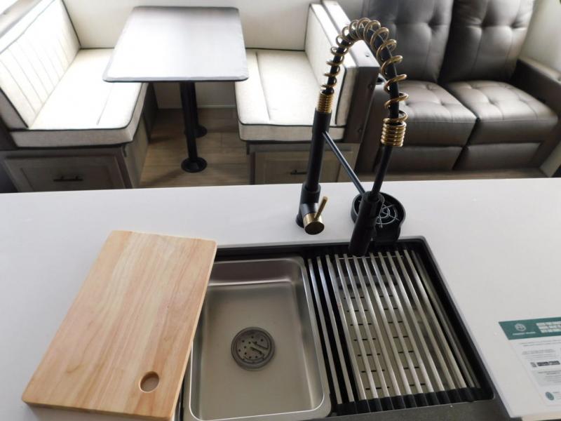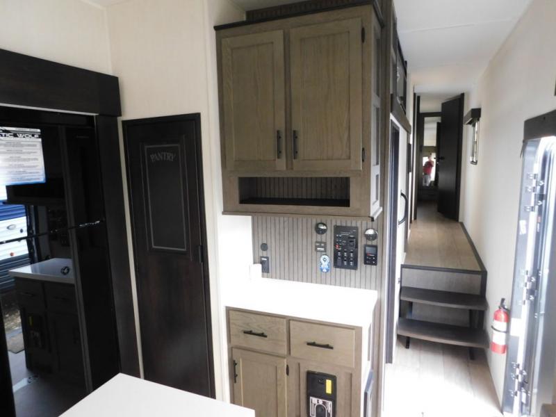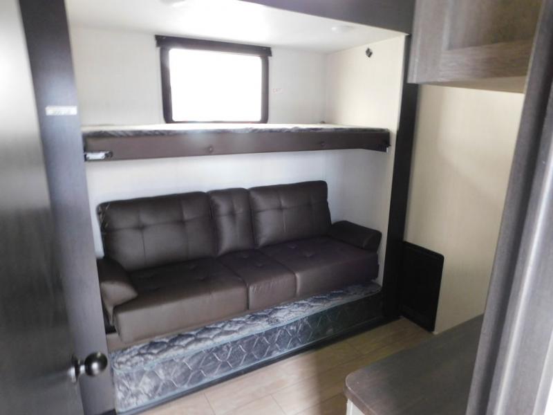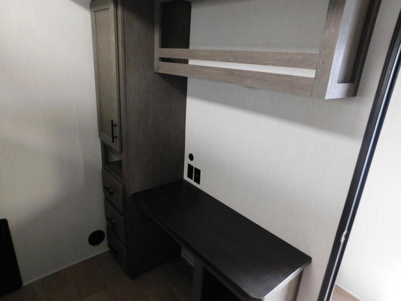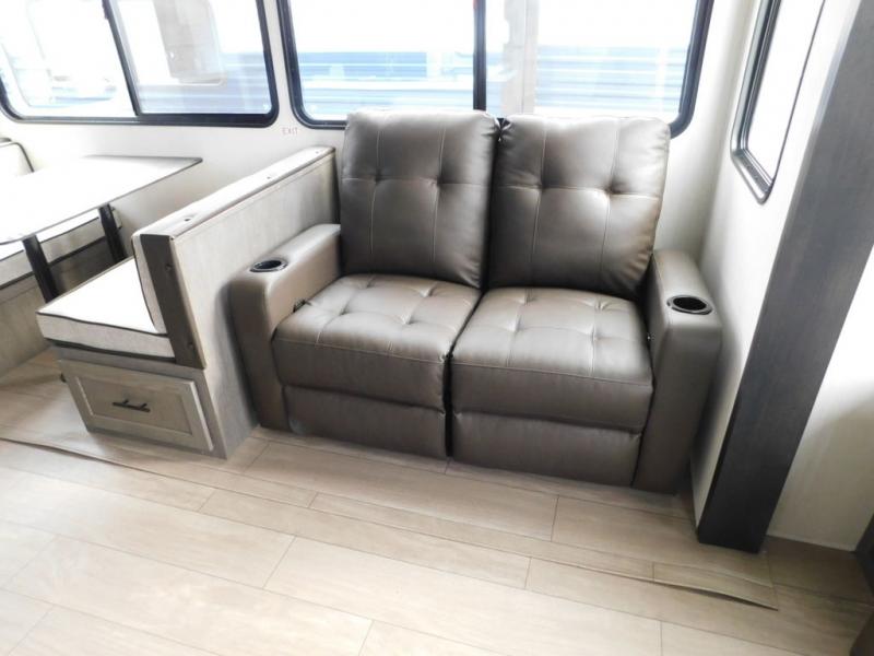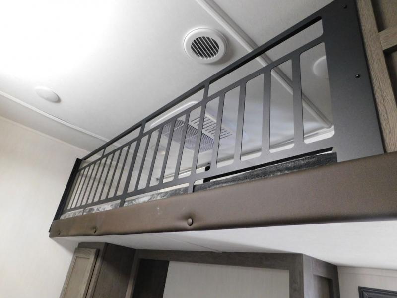 You have excellent sleeping accommodations on this Cherokee Arctic Wolf fifth wheel! There is a private bedroom with a king-size bed at the front for you, and the second bedroom contains two 28" x 72" bunks and a jack knife sofa with trundle for any kids or friends you have traveling with you. A desk provides space to work or study. And it doesn't stop there. There is also a tri-fold sofa in the living area that you can use as a sleeping space. The kitchen is ready for you to make meals on the three-burner range, and you have plenty of work space with a spacious kitchen island. You can enjoy your meals at the dinette, and after dinner relax on the jack knife sofa across from the fireplace.