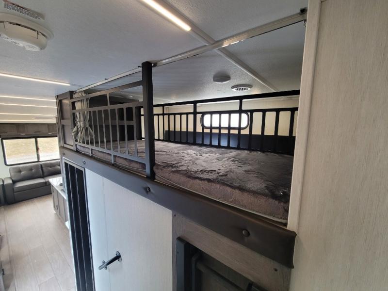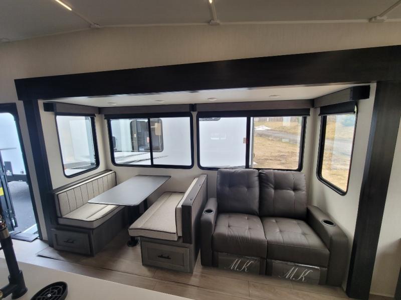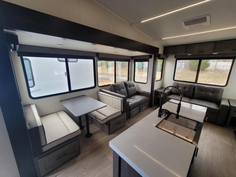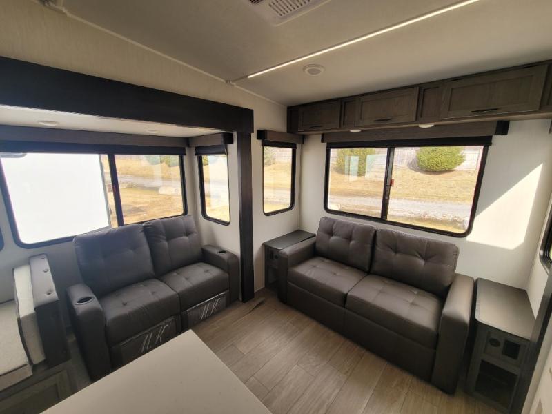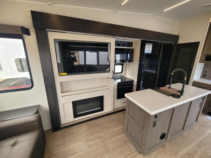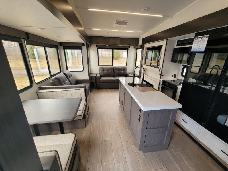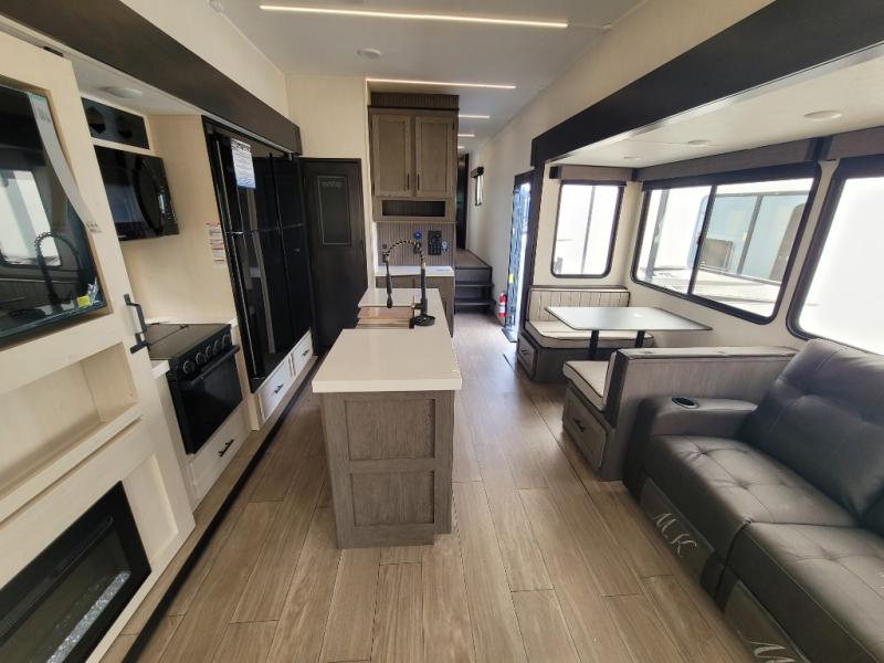 You have excellent sleeping accommodations on this Cherokee Arctic Wolf fifth wheel! There is a private bedroom with a king-size bed at the front for you, and the second bedroom contains two 28" x 72" bunks and a jack knife sofa with trundle for any kids or friends you have traveling with you. A desk provides space to work or study. And it doesn't stop there. There is also a tri-fold sofa in the living area that you can use as a sleeping space. The kitchen is ready for you to make meals on the three-burner range, and you have plenty of work space with a spacious kitchen island. You can enjoy your meals at the dinette, and after dinner relax on the jack knife sofa across from the fireplace.
