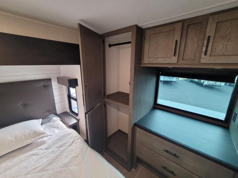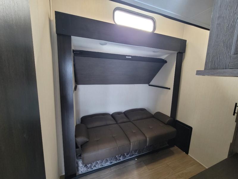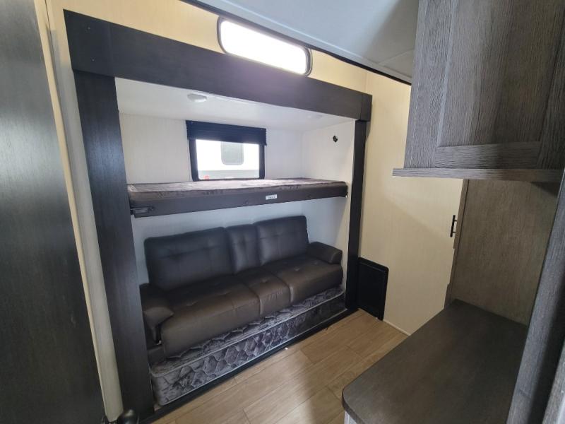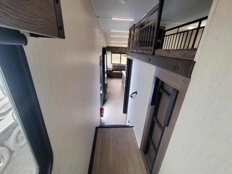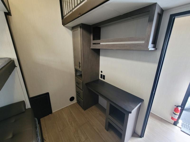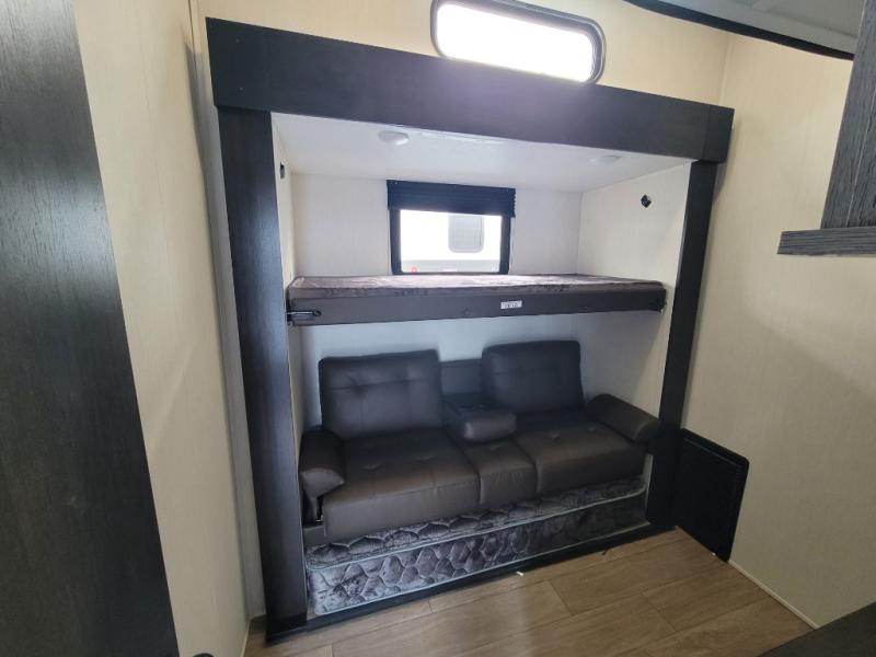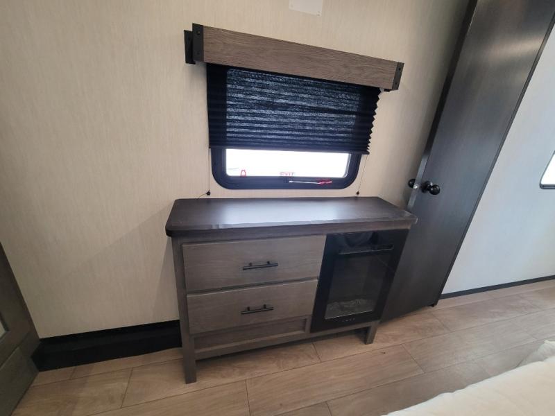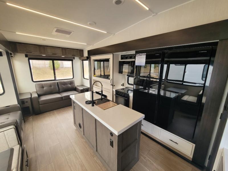 You have excellent sleeping accommodations on this Cherokee Arctic Wolf fifth wheel! There is a private bedroom with a king-size bed at the front for you, and the second bedroom contains two 28" x 72" bunks and a jack knife sofa with trundle for any kids or friends you have traveling with you. A desk provides space to work or study. And it doesn't stop there. There is also a tri-fold sofa in the living area that you can use as a sleeping space. The kitchen is ready for you to make meals on the three-burner range, and you have plenty of work space with a spacious kitchen island. You can enjoy your meals at the dinette, and after dinner relax on the jack knife sofa across from the fireplace.