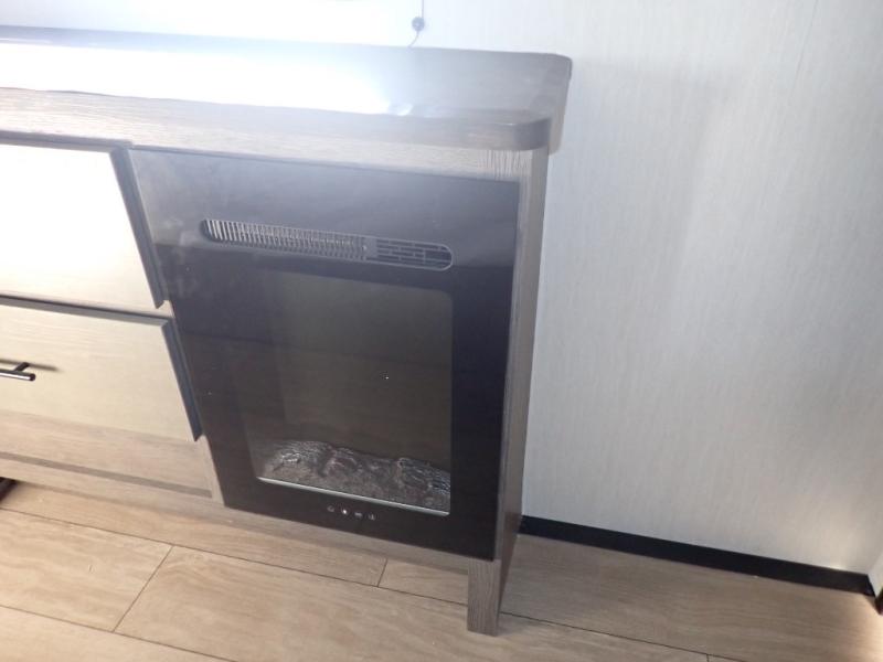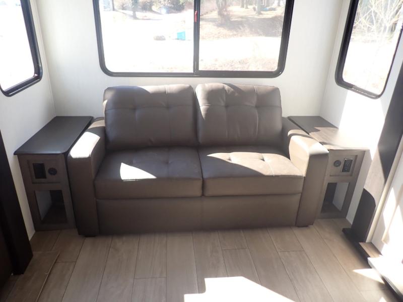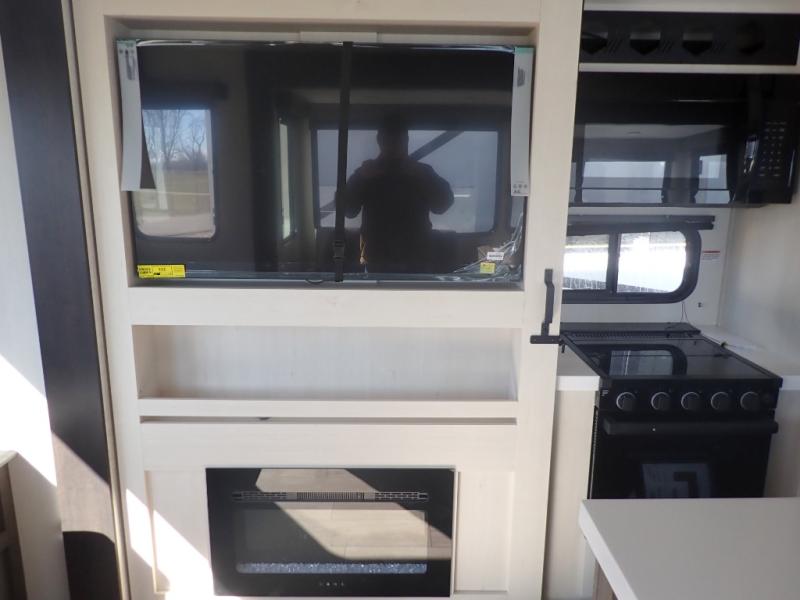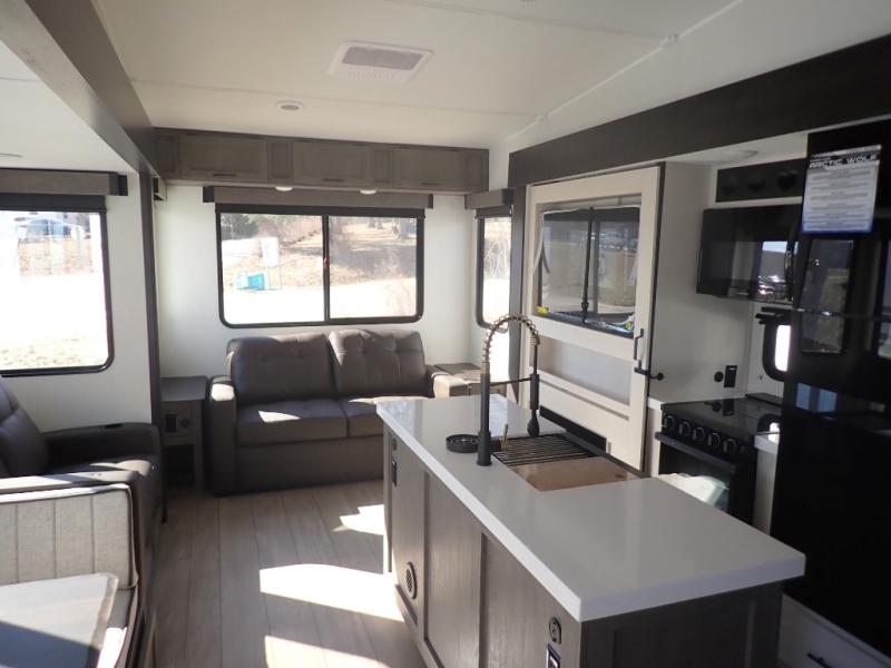 You have excellent sleeping accommodations on this Cherokee Arctic Wolf fifth wheel! There is a private bedroom with a king-size bed at the front for you, and the second bedroom contains two 28" x 72" bunks and a jack knife sofa with trundle for any kids or friends you have traveling with you. A desk provides space to work or study. And it doesn't stop there. There is also a tri-fold sofa in the living area that you can use as a sleeping space. The kitchen is ready for you to make meals on the three-burner range, and you have plenty of work space with a spacious kitchen island. You can enjoy your meals at the dinette, and after dinner relax on the jack knife sofa across from the fireplace.