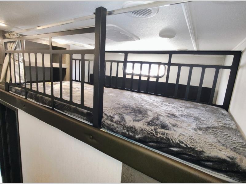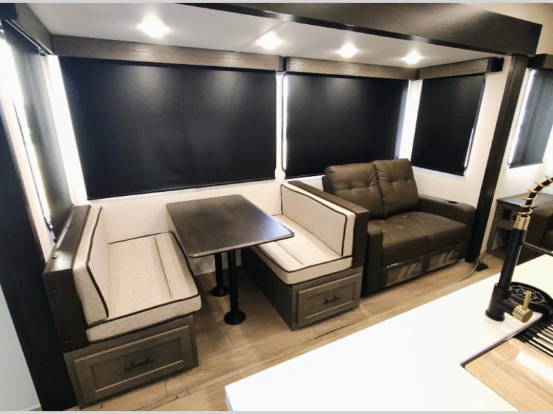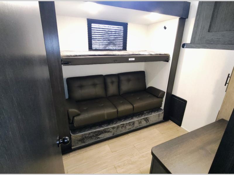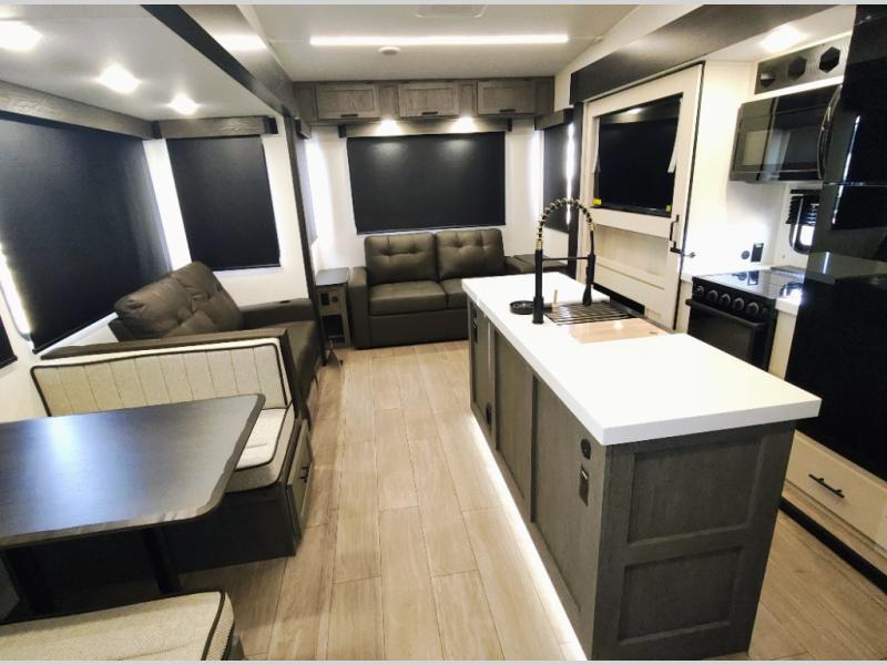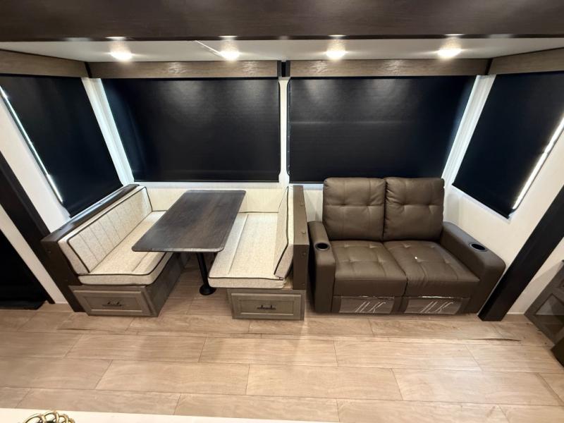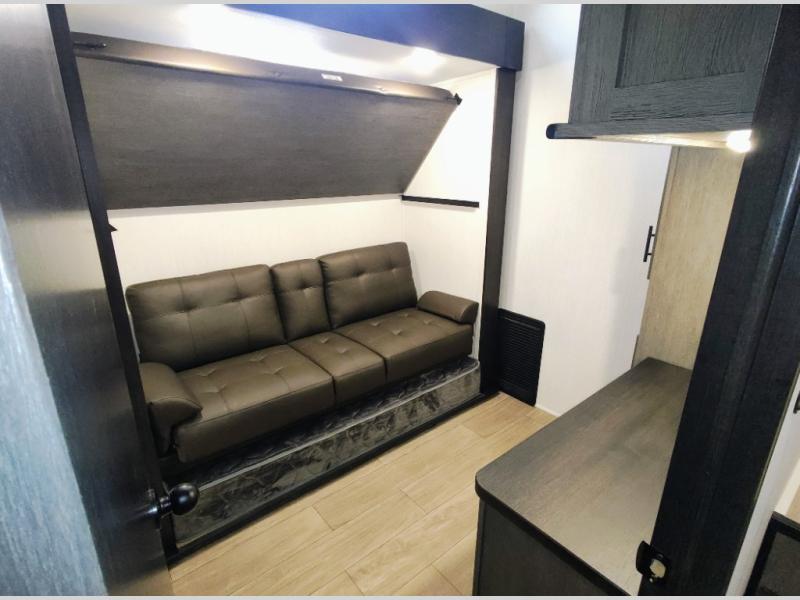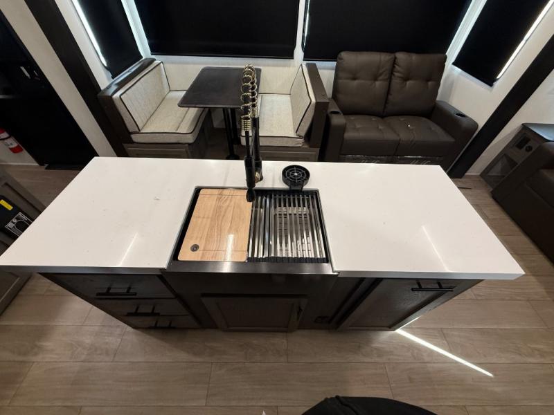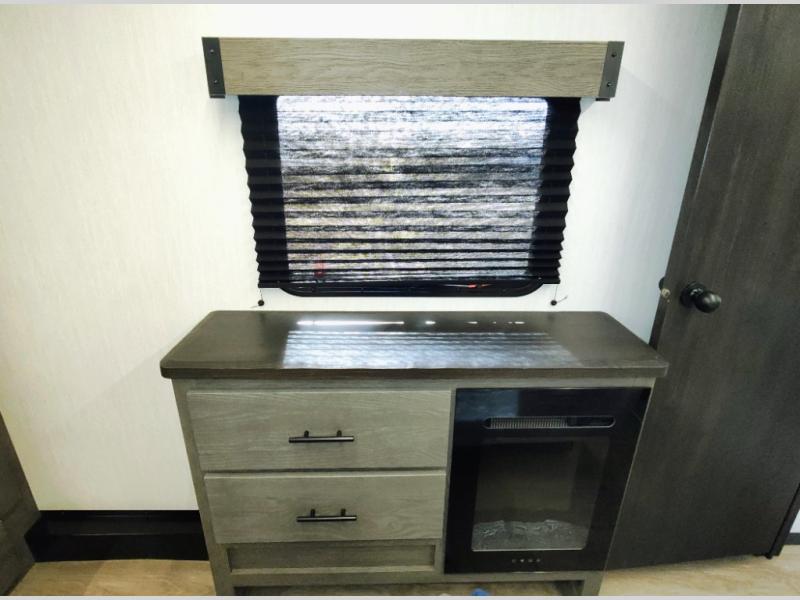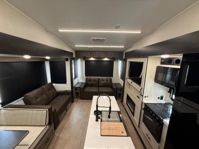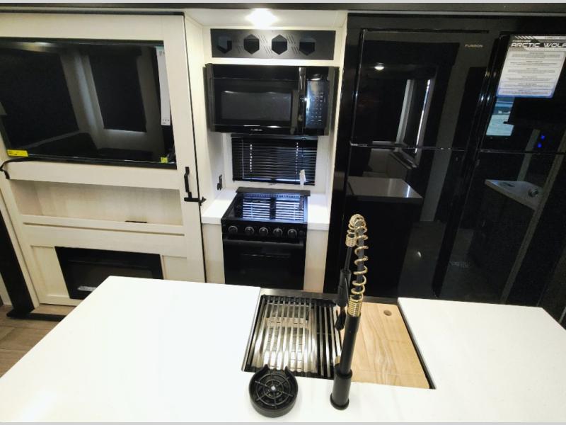 You have excellent sleeping accommodations on this Cherokee Arctic Wolf fifth wheel! There is a private bedroom with a king-size bed at the front for you, and the second bedroom contains two 28" x 72" bunks and a jack knife sofa with trundle for any kids or friends you have traveling with you. A desk provides space to work or study. And it doesn't stop there. There is also a tri-fold sofa in the living area that you can use as a sleeping space. The kitchen is ready for you to make meals on the three-burner range, and you have plenty of work space with a spacious kitchen island. You can enjoy your meals at the dinette, and after dinner relax on the jack knife sofa across from the fireplace.