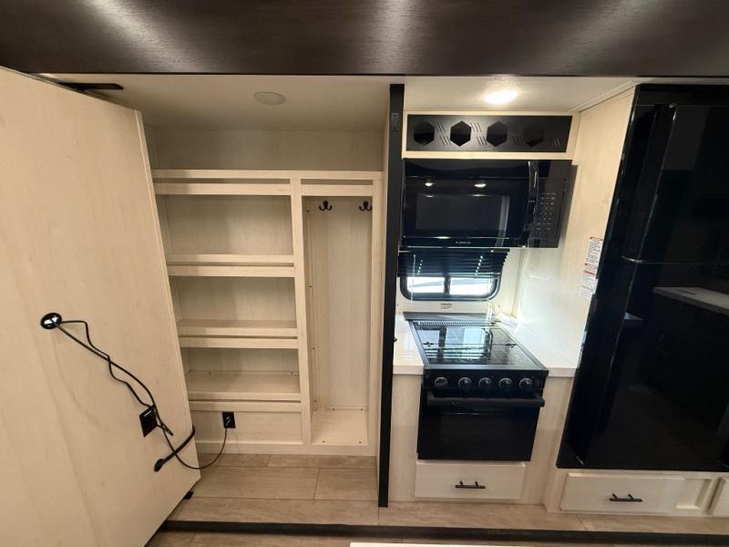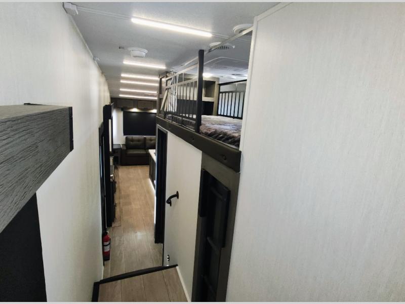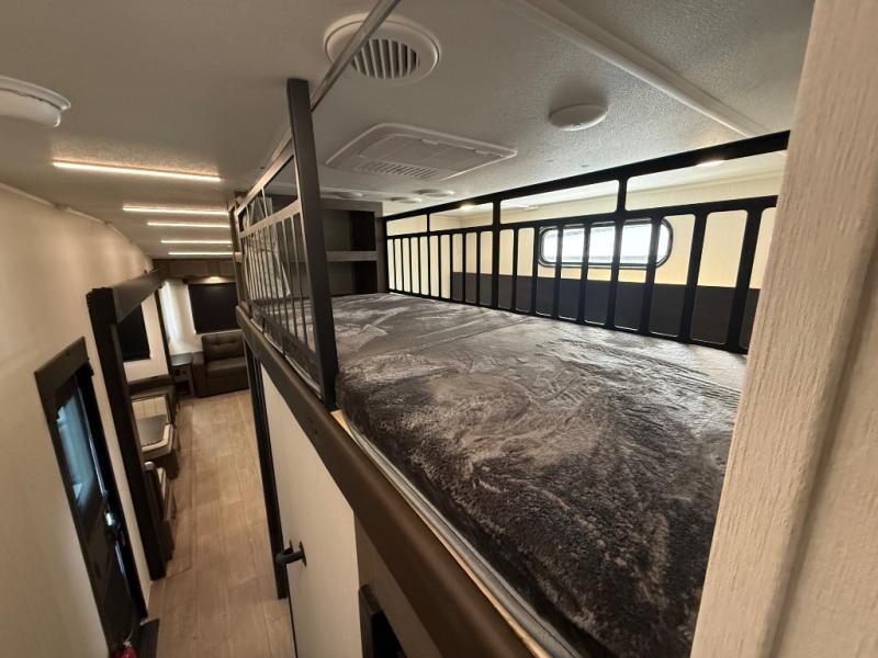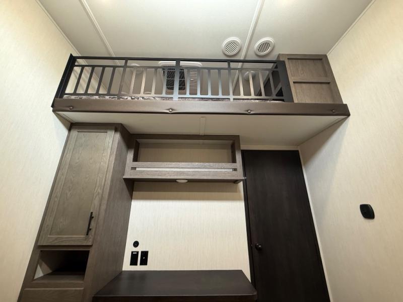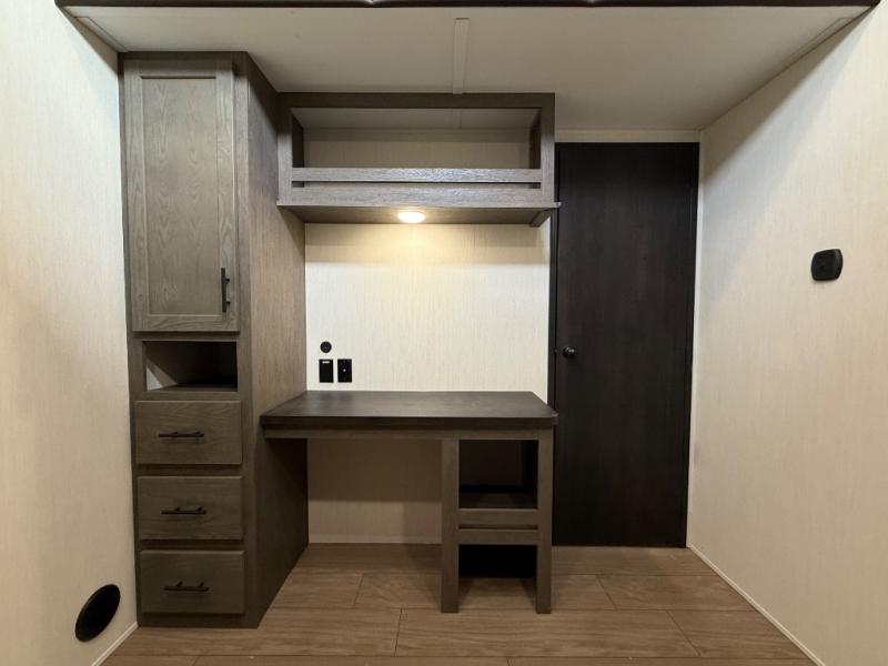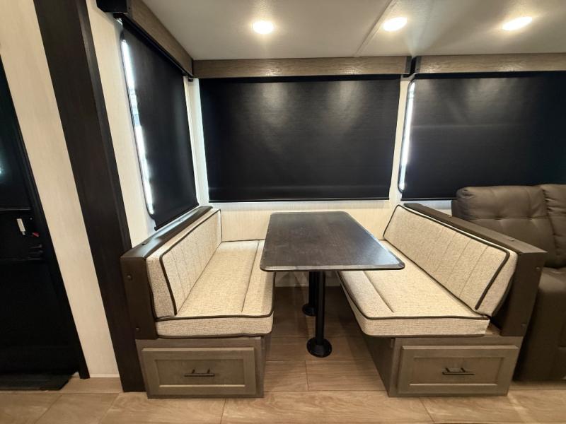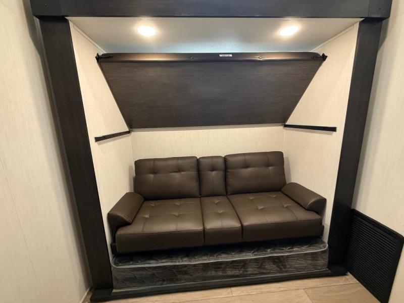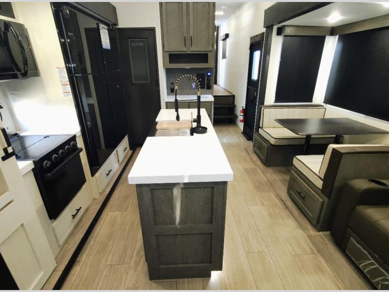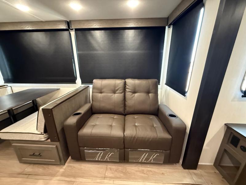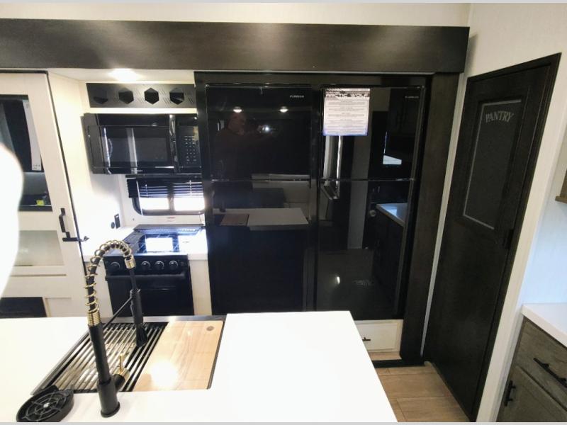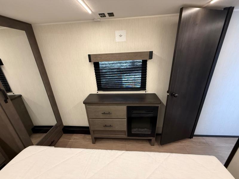 You have excellent sleeping accommodations on this Cherokee Arctic Wolf fifth wheel! There is a private bedroom with a king-size bed at the front for you, and the second bedroom contains two 28" x 72" bunks and a jack knife sofa with trundle for any kids or friends you have traveling with you. A desk provides space to work or study. And it doesn't stop there. There is also a tri-fold sofa in the living area that you can use as a sleeping space. The kitchen is ready for you to make meals on the three-burner range, and you have plenty of work space with a spacious kitchen island. You can enjoy your meals at the dinette, and after dinner relax on the jack knife sofa across from the fireplace.