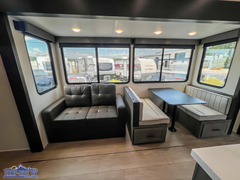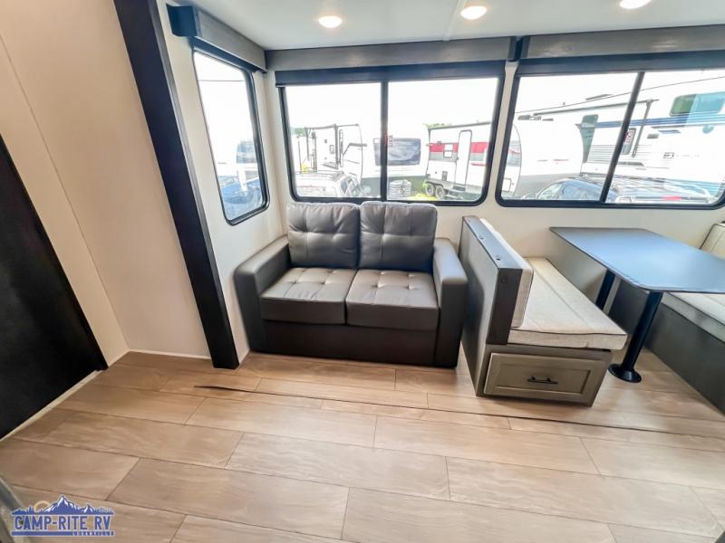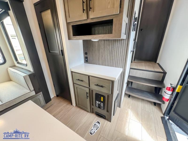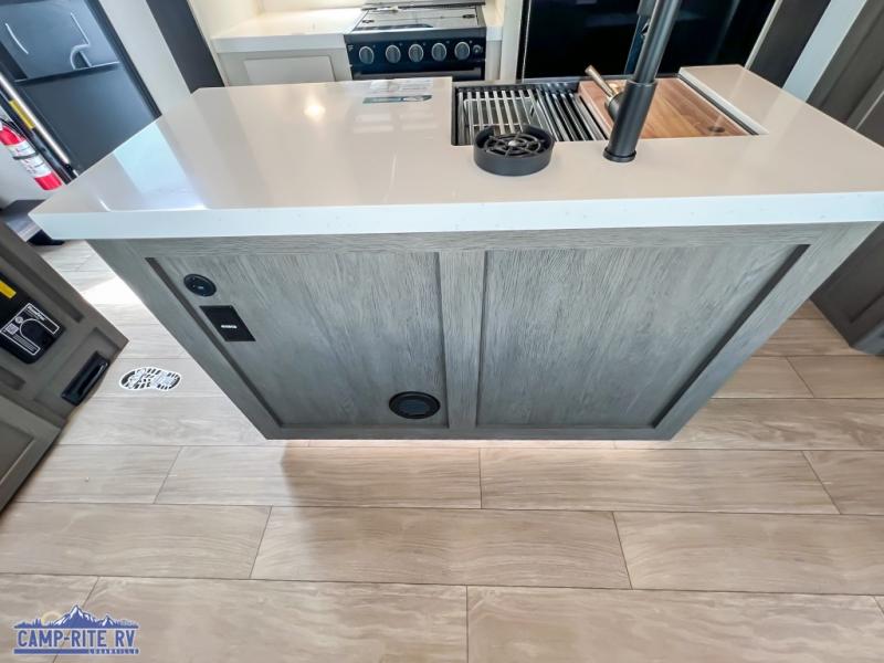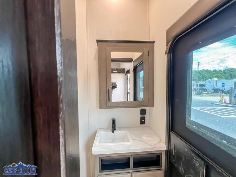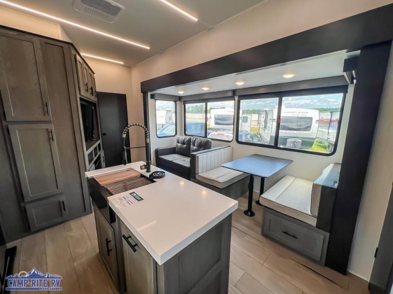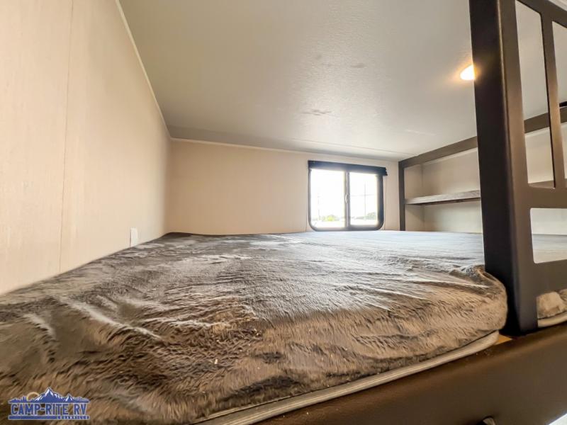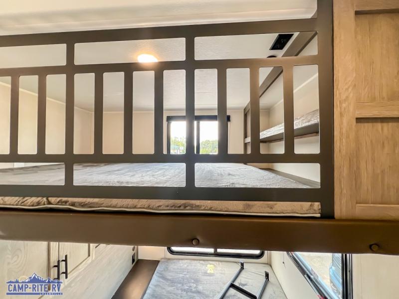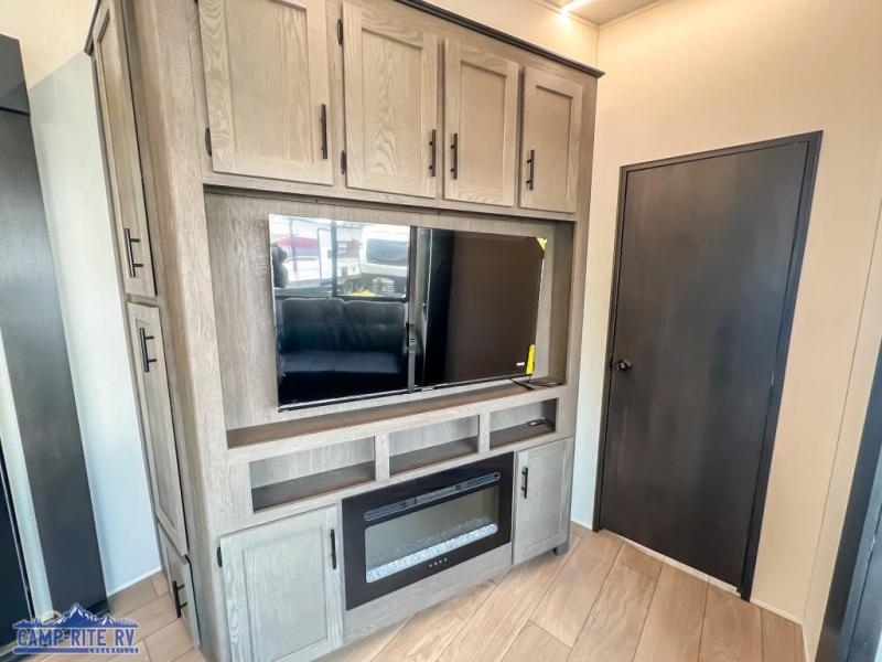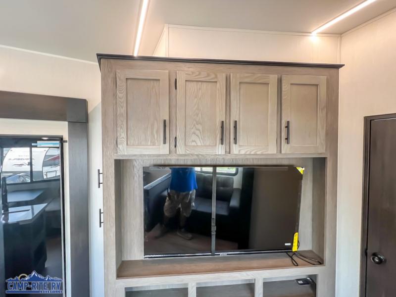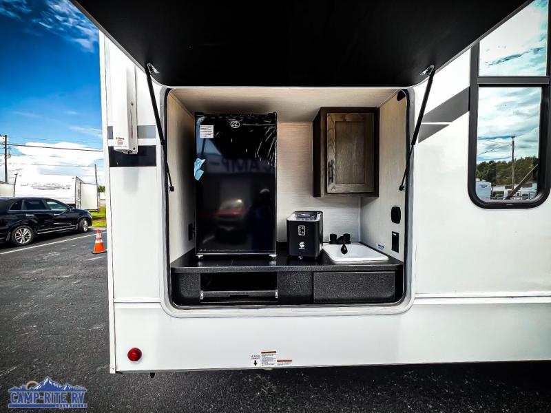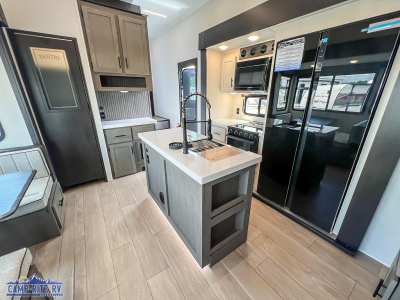This Cherokee Arctic Wolf fifth wheel is an excellent choice if you have a large family that wants to get away! Not only is there a private bedroom up front for you, but there is also a bedroom suite in the back. This suite has a 54" x 74" bed, a 60" x 80" loft bed, a TV area, a half bathroom all to itself, and the second exterior entry door. What a space! You'll also be highly impressed with the living area because it has a large slide that holds the tri-fold sofa and dinette. The large pantry is another feature you'll appreciate since it can store all of the food needed to feed your group, and the outside kitchen is an added bonus the cook will love!