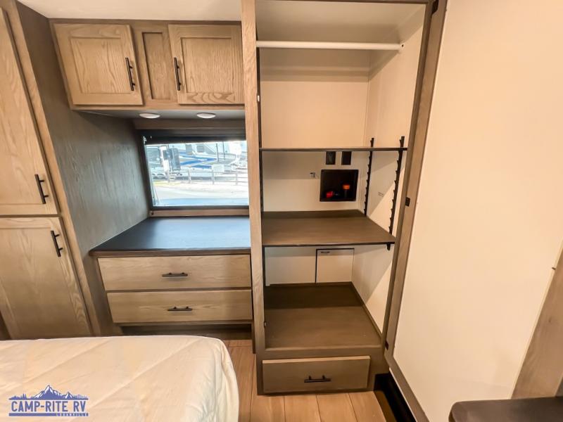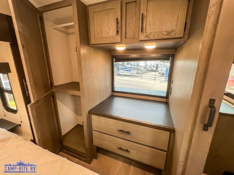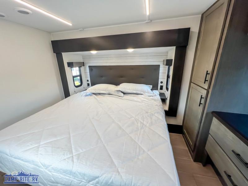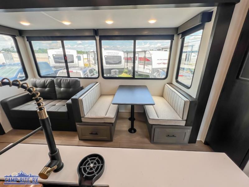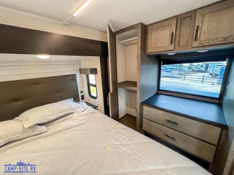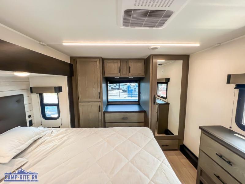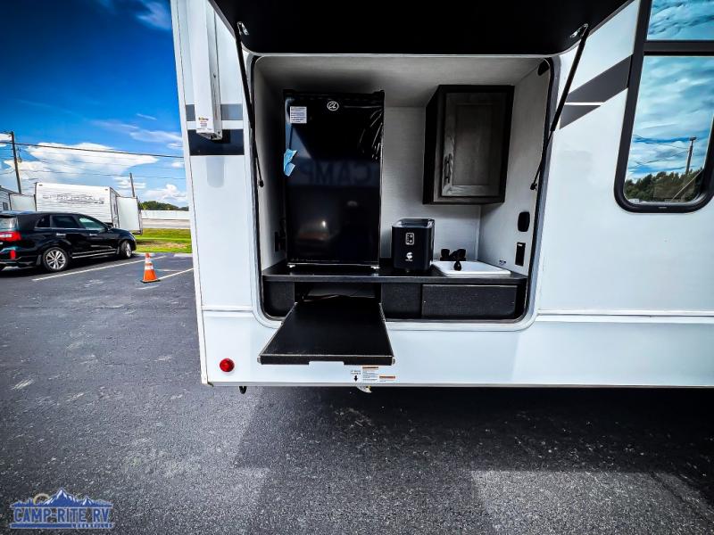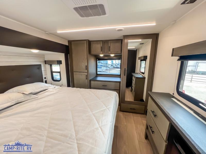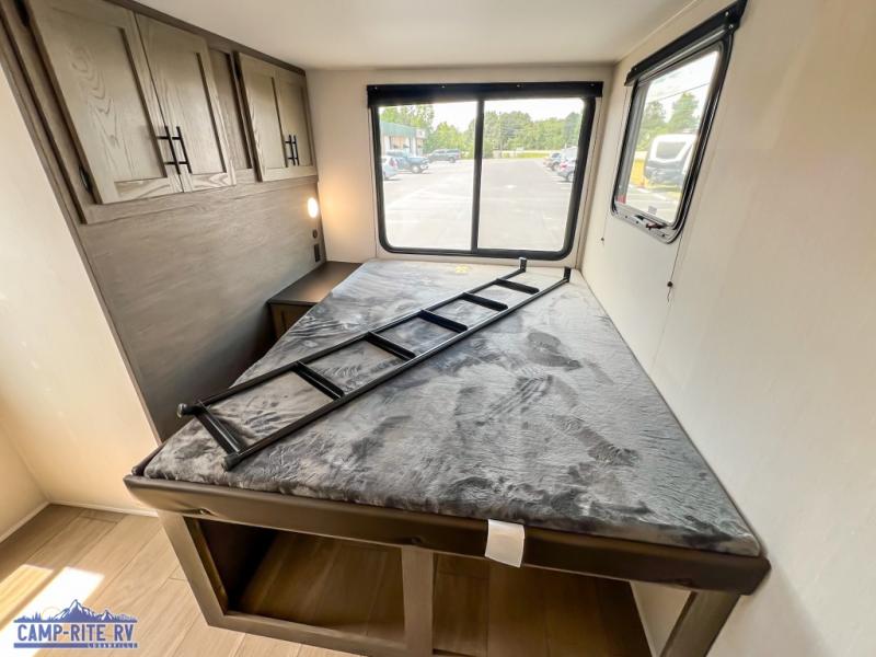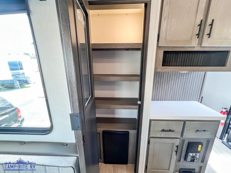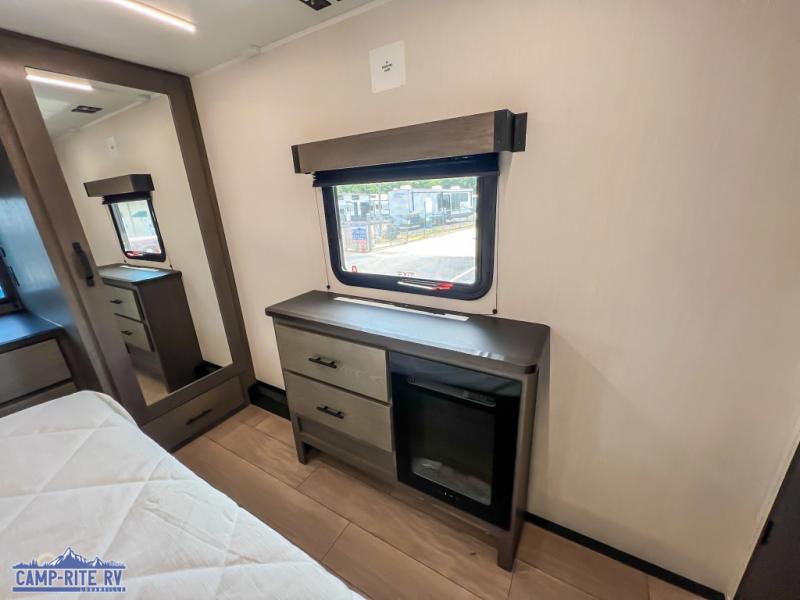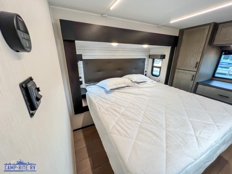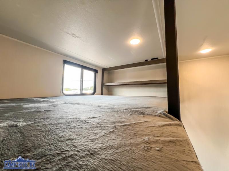 This Cherokee Arctic Wolf fifth wheel is an excellent choice if you have a large family that wants to get away! Not only is there a private bedroom up front for you, but there is also a bedroom suite in the back. This suite has a 54" x 74" bed, a 60" x 80" loft bed, a TV area, a half bathroom all to itself, and the second exterior entry door. What a space! You'll also be highly impressed with the living area because it has a large slide that holds the tri-fold sofa and dinette. The large pantry is another feature you'll appreciate since it can store all of the food needed to feed your group, and the outside kitchen is an added bonus the cook will love!