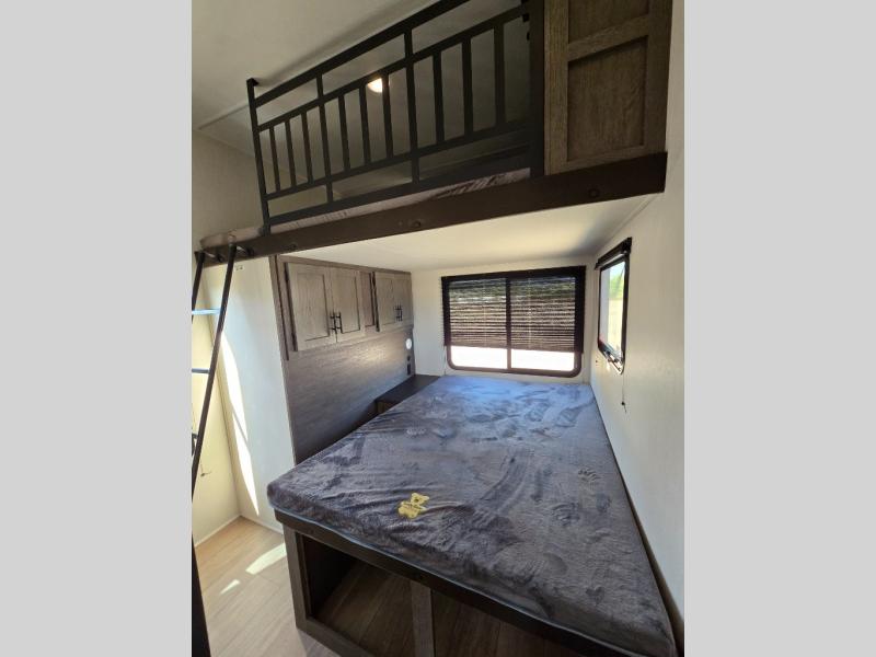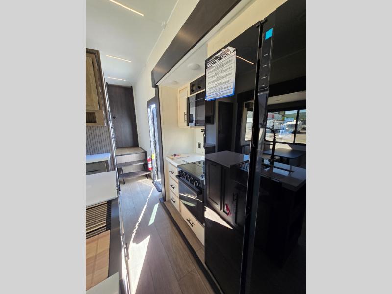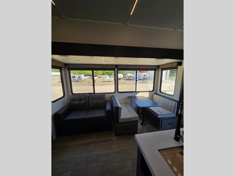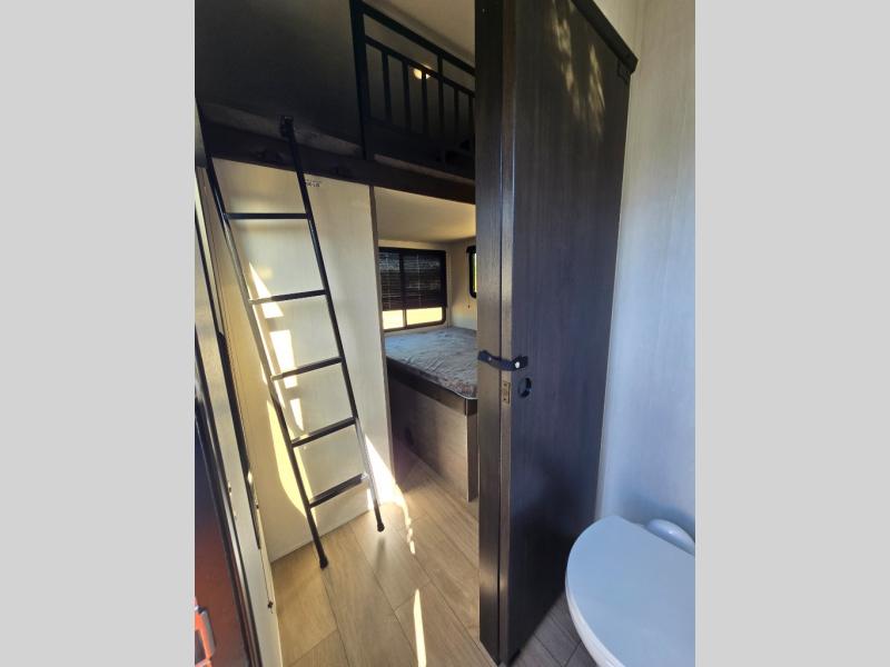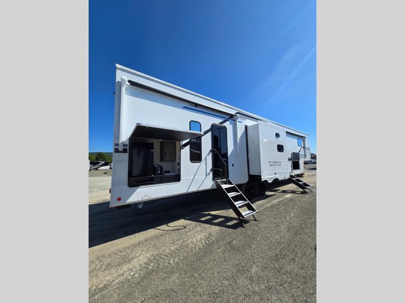 This Cherokee Arctic Wolf fifth wheel is an excellent choice if you have a large family that wants to get away! Not only is there a private bedroom up front for you, but there is also a bedroom suite in the back. This suite has a 54" x 74" bed, a 60" x 80" loft bed, full under bed storage, a half bathroom all to itself, and the second exterior entry door. What a space! You'll also be highly impressed with the living area because it has a large slide that holds the tri-fold sofa and dinette. The large pantry is another feature you'll appreciate since it can store all of the food needed to feed your group, and the outside kitchen is an added bonus the cook will love!